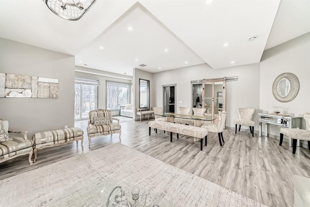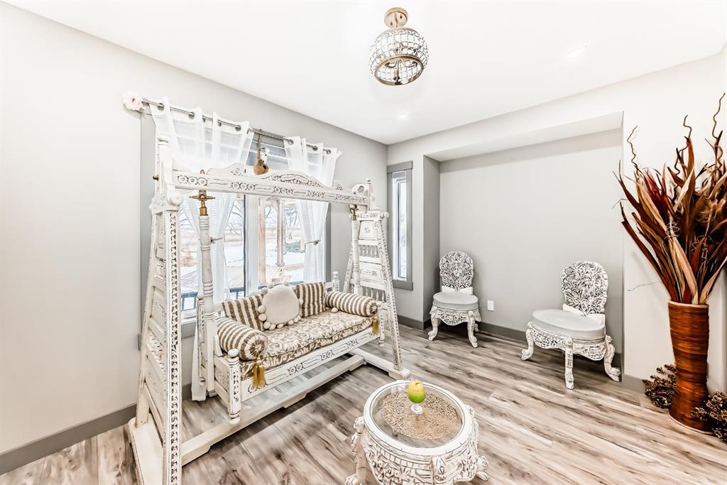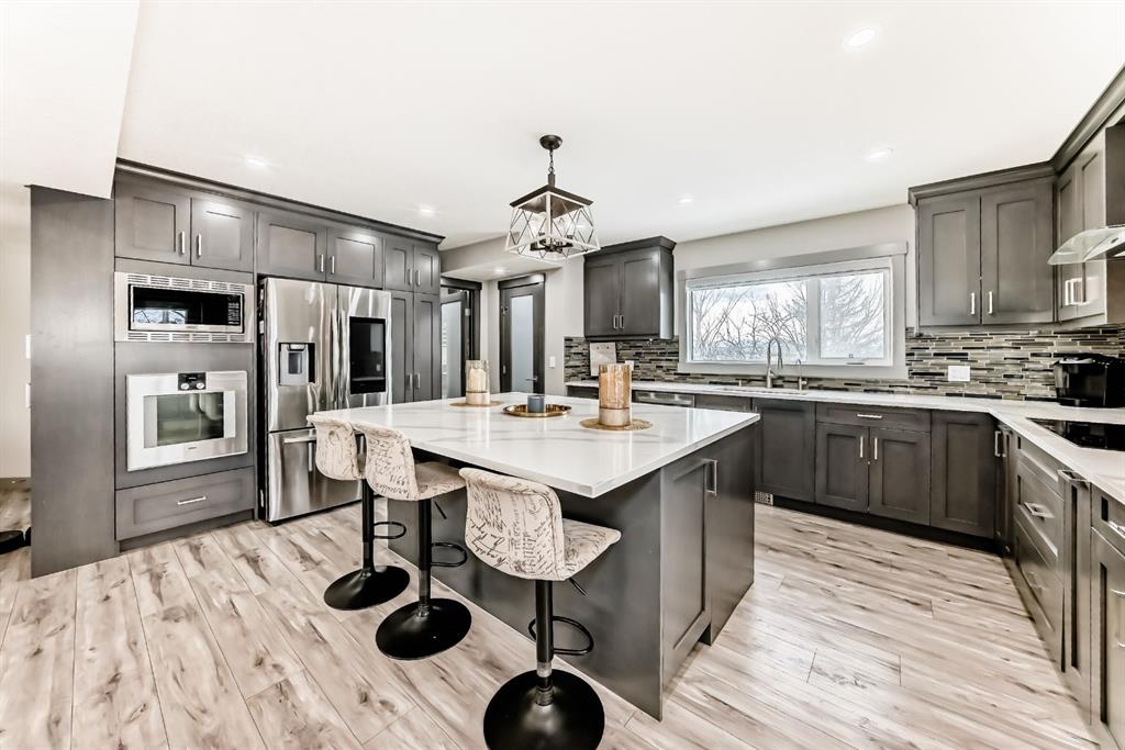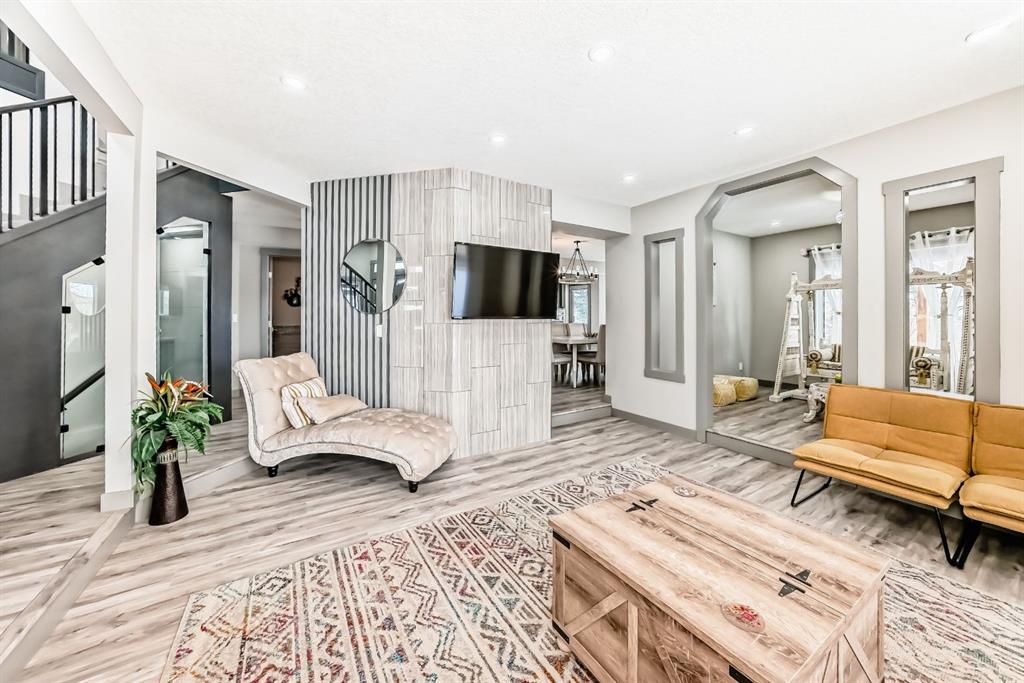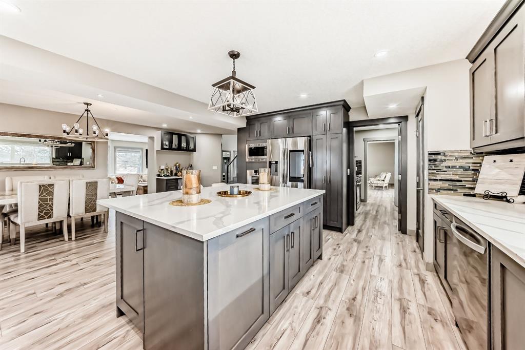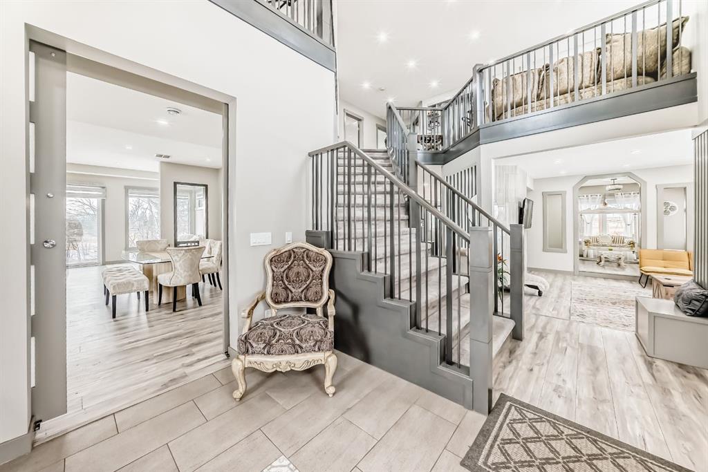 Set on 4 acres of lush, tree-lined land, this extraordinary estate offers privacy, presence, and prestige—just minutes from Calgary. Boasting over 5,500 sq. ft. of beautifully designed living space, this home underwent a major permitted expansion and renovation in 2021, resulting in a residence that feels both grand and entirely modern. Extensive upgrades include a brand-new septic system, Lux windows and doors, updated electrical, plumbing, heating, insulation, drywall, ceilings, lighting, and concrete sidewalks and patios surrounding the home. Additional features include a Culligan water softener and filtration system, three new furnaces, a new hot water tank, and new appliances—all still under warranty. A commercial-grade gas range with electric oven, plus two outdoor gas hookups for BBQs, further elevate the home’s functionality. Simply put, the upgrades are too numerous to list—this property must be experienced in person. The striking front entrance makes an immediate impression and opens to a thoughtfully designed main level. Here you’ll find a spacious den, a sunken living room, two generous dining areas, and an expansive chef’s kitchen complete with a large island, built-in bench seating, and a fully equipped spice kitchen. A cozy family room, two powder rooms, and a practical back entry with garage access and built-in coat and shoe storage complete the main floor. A stunning curved staircase leads upstairs to five bedrooms and four bathrooms. The upper level features two luxurious primary suites—one with double doors, a private sitting area, a 5-piece ensuite with jetted tub, and walk-in closet; the other with a 4-piece ensuite and walk-in closet. Three additional bedrooms include two with attached bathrooms and one serviced by a separate full bath. Two loft spaces add versatility: a large loft with fireplace and balcony overlooking the front yard, and a smaller loft ideal for a home office or study area. The upper floor also includes a convenient laundry room with ample storage, plus a small den perfect for a prayer room, playroom, or quiet retreat. The fully developed basement (illegal suite) has its own separate entrance and offers two bedrooms, a full bathroom, a living area, and a kitchen with an induction cooktop—ideal for extended family or guests. Positioned to capture sunlight throughout the day, the home is filled with natural light thanks to oversized windows throughout. Multiple driveways and a heated four-car garage provide exceptional convenience.