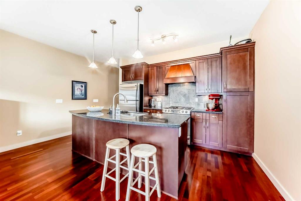 EXCEPTIONALLY WALKABLE LOCATION for this 2 bedroom, 2 bathroom condo spread over 921 square ft with titled underground parking and a LARGE STORAGE LOCKER. Enjoy the downtown lifestyle just steps away on trendy 17th Ave with shops and an array of restaurants. Located CLOSE TO SCHOOLS and BUS ROUTES. Walk or bike downtown, along the Bow River, and the many tranquil river pathways. Plus, just a short walk to the heart of Marda Loop for additional restaurant and shopping options. Welcome home to this STYLISH SANCTUARY offering a BRIGHT and SPACIOUS LAYOUT. Chef up some culinary wonders in the LARGE KITCHEN with stainless steel appliances, GAS STOVE, and large island. Relax in your living room in front of the CONTEMPORARY CONCRETE FIREPLACE that is bathed in SUNSHINE from the oversized windows. The adjacent dining room (or flex space) has plenty of room for meals or the additional space you need. IN-FLOOR heating will keep you warm and cozy. At the end of the day retreat to your primary bedroom with a built-in desk nook, walk-in closet, private ensuite with SOAKER TUB and SEPARATE SHOWER. Laundry is also conveniently located in the primary bedroom. The SECOND BEDROOM is right next to the second full bathroom. This WELL-MAINTAINED condo has a great combination of space and location you can’t pass up. You will also appreciate the SECURE GATED BUILDING. Come view this wonderful move-in ready home in an unbeatable inner-city location today!