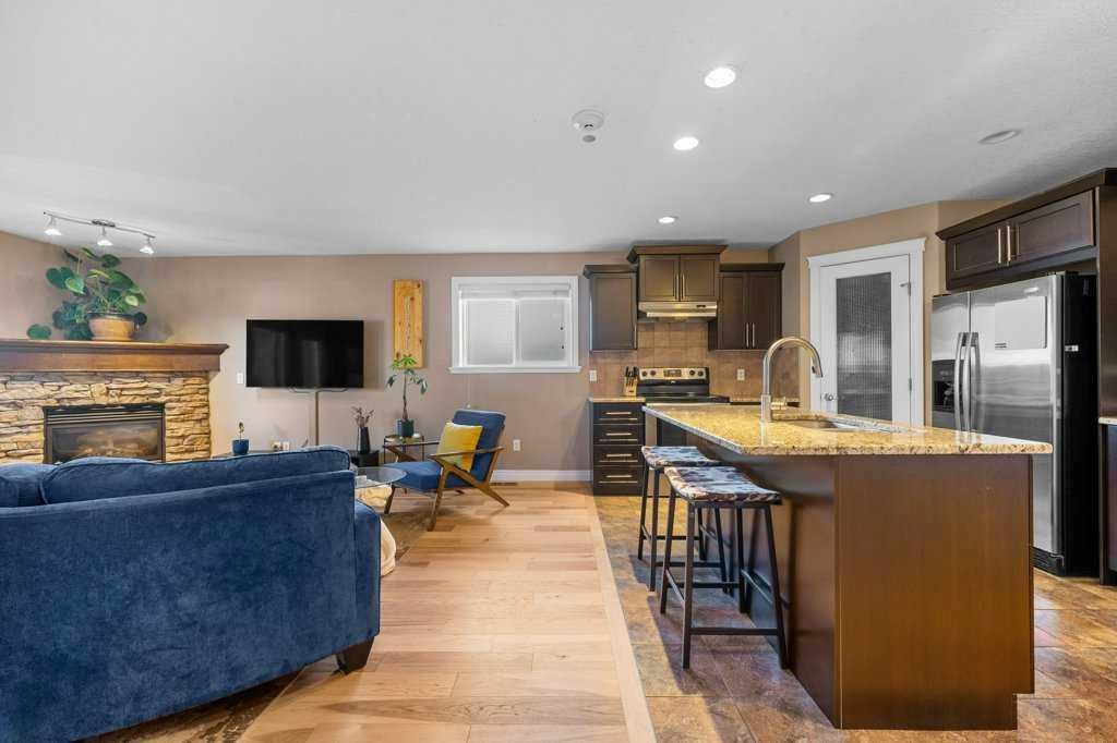 The main living area features new Connel hickory hardwood, a gas fireplace, and an airy dining/entertaining zone. Off the living room is your west-facing, covered balcony—perfect for sunset viewing and BBQs with a natural gas line already in place. The kitchen is thoughtfully appointed with a pantry, granite countertops, stainless steel appliances, and an island with breakfast bar.