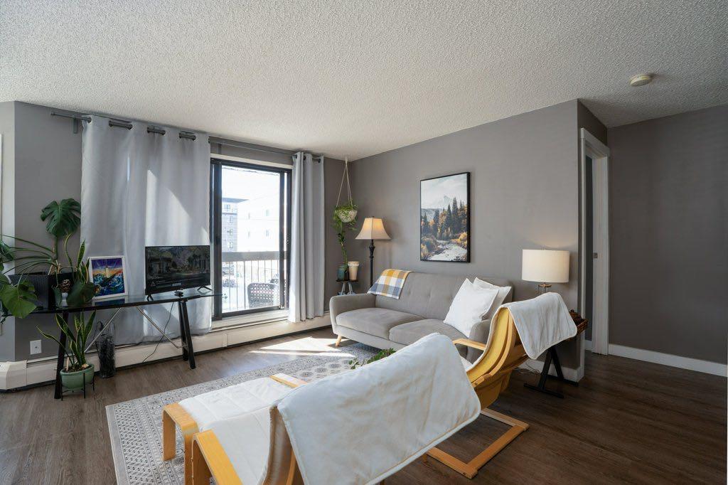 The living room offers a comfortable and functional layout, complete with a large patio door that opens onto your private balcony for enjoying sunny afternoons and relaxing evenings.