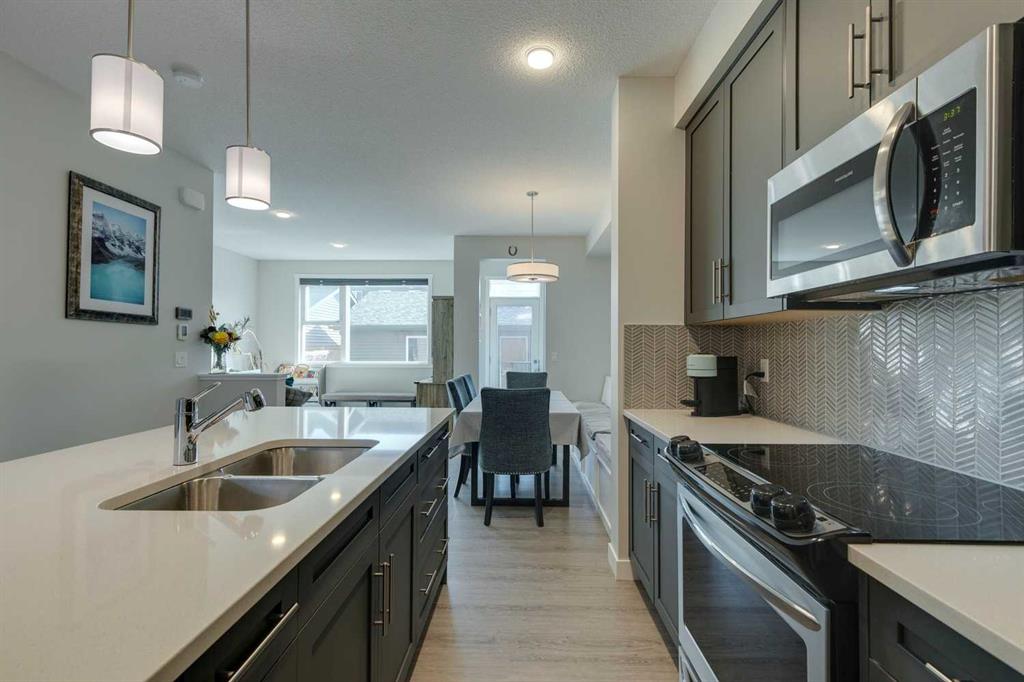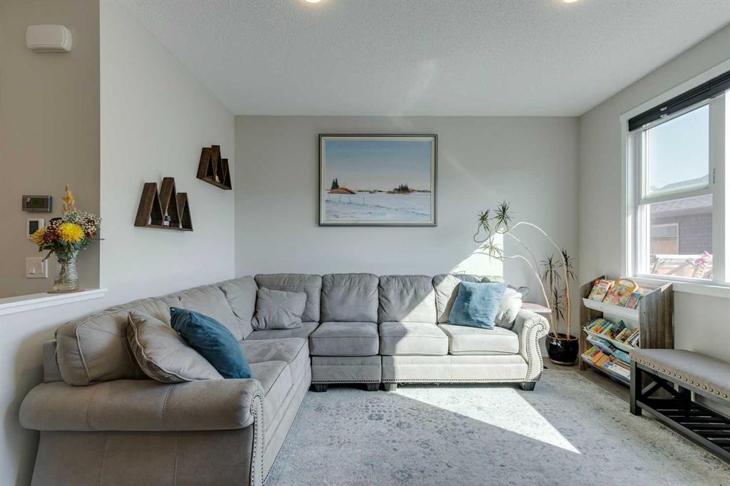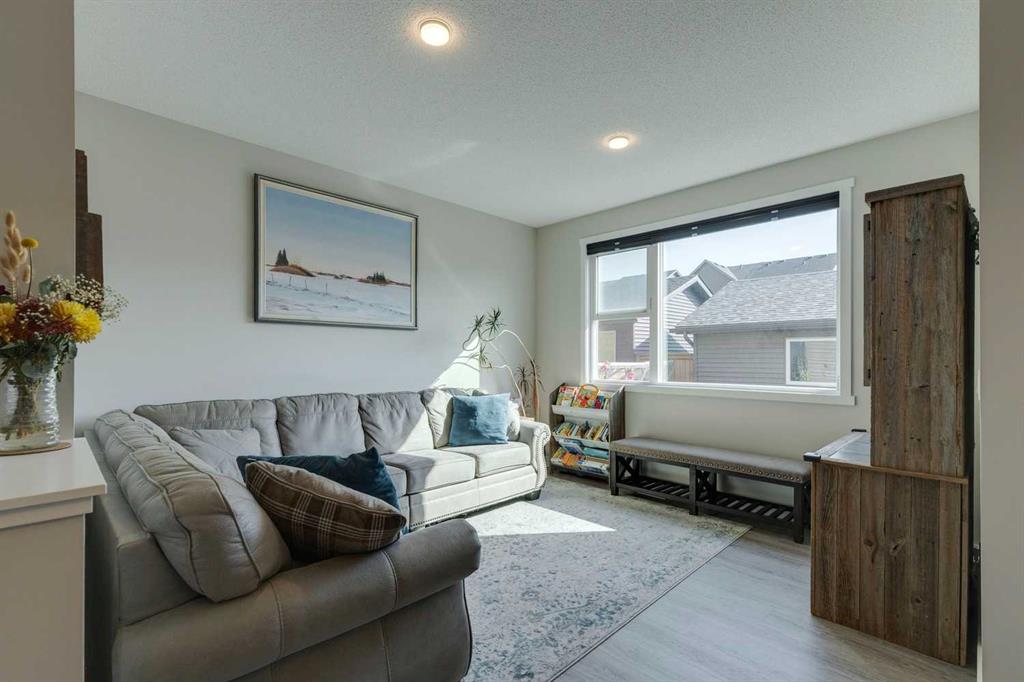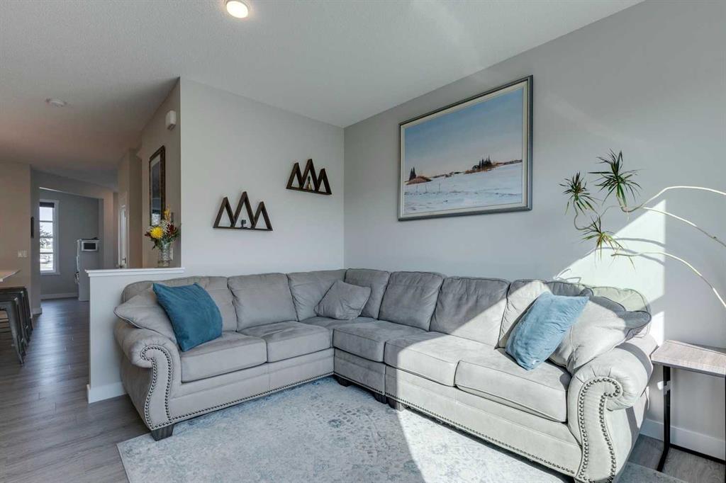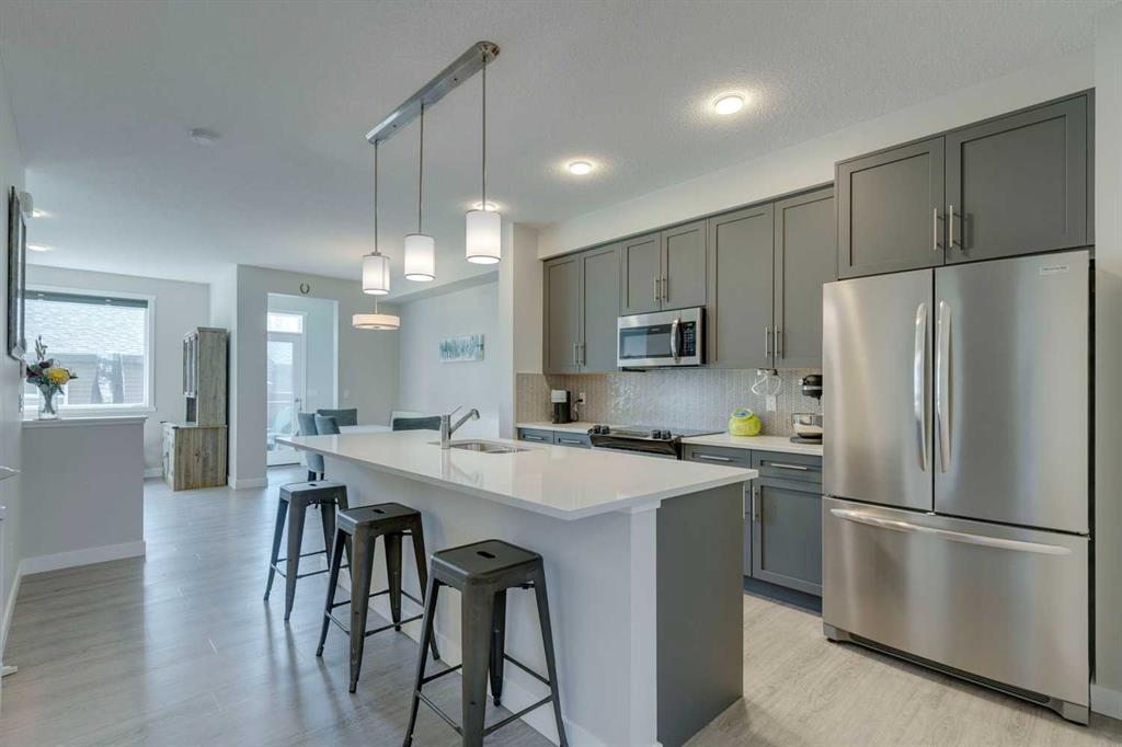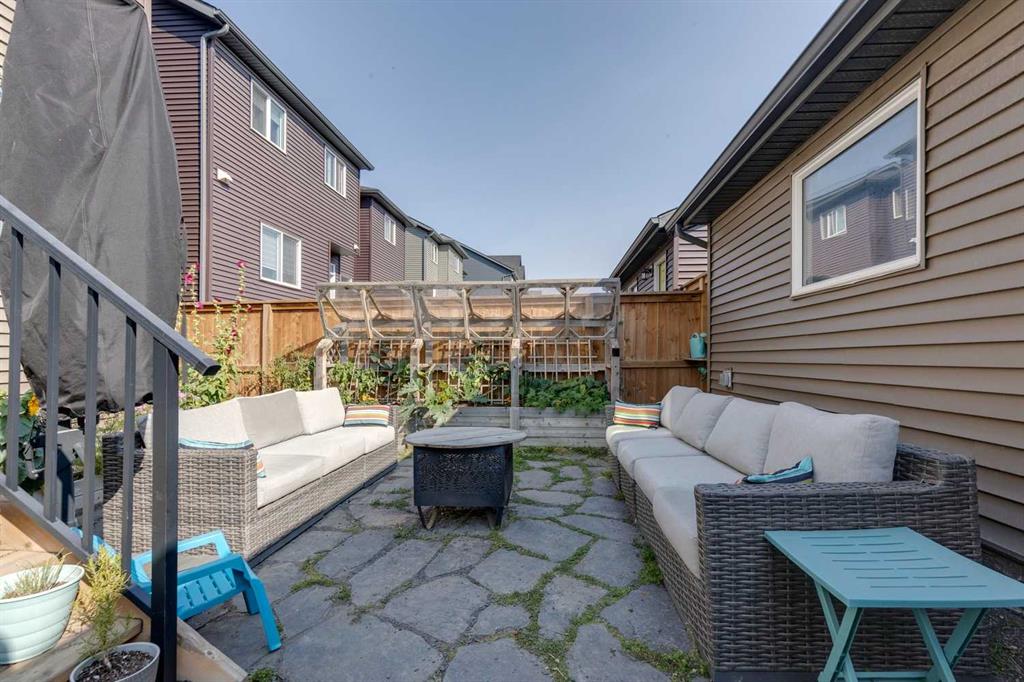 Carrington – 201 Carringvue Way NW: Welcome to this beautifully finished, fully developed 2-storey home in the family-friendly community of Carrington. Built by Homes by Avi, this home offers over 2,200 sq ft of living space with a total of 4 bedrooms, 3.5 bathrooms, and a detached double garage. The open-concept main floor is bright and inviting with luxury vinyl plank throughout. At the heart of the home is a stylish kitchen featuring quartz countertops, a herringbone backsplash, stainless steel appliances, and a central island that flows into the dining area with custom built-in bench seating. The living room is filled with natural light from large south-facing windows, while a spacious den and a 2-piece powder room complete the level. Upstairs, you will find the primary suite with a Juliet balcony, a walk-in closet, and a 3-piece ensuite with a walk-in glass shower. Two additional bedrooms, a 4-piece bathroom, and a convenient laundry room provide plenty of space for family living. The lower level was developed by the builder and offers even more living space with a large family room, a games area, a fourth bedroom, a 4-piece bathroom, and convenient under-stair storage. Outside the sunny south-facing backyard is fully landscaped with a deck with a gas line, a stone patio, planter boxes, and a double garage accessed from the paved lane. Recent updates to the home include new shingles and siding (2025) and central A/C (2024). Located in Carrington, a vibrant newer community with parks, playgrounds, pathways, Carrington Pond, a skatepark, and a basketball court – all while offering quick access to Stoney Trail, Deerfoot Trail, CrossIron Mills, and the airport. This turnkey home is ready for you to move in – book a showing today.