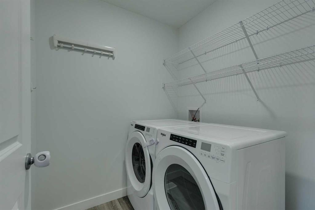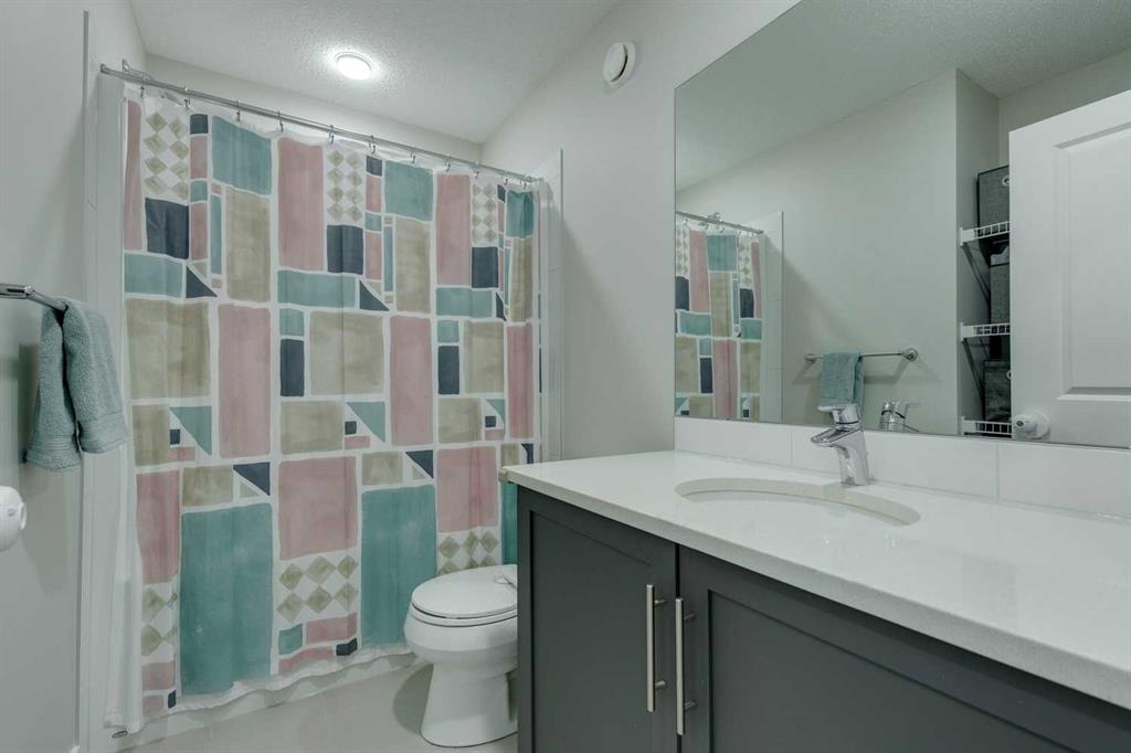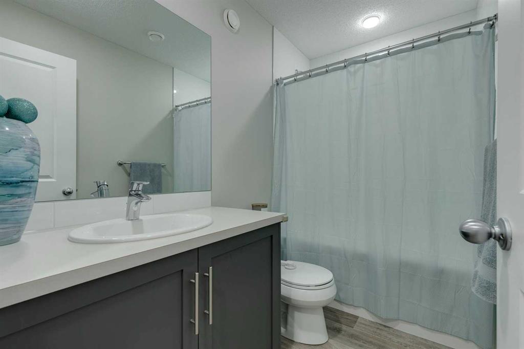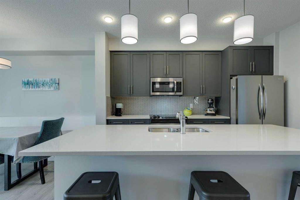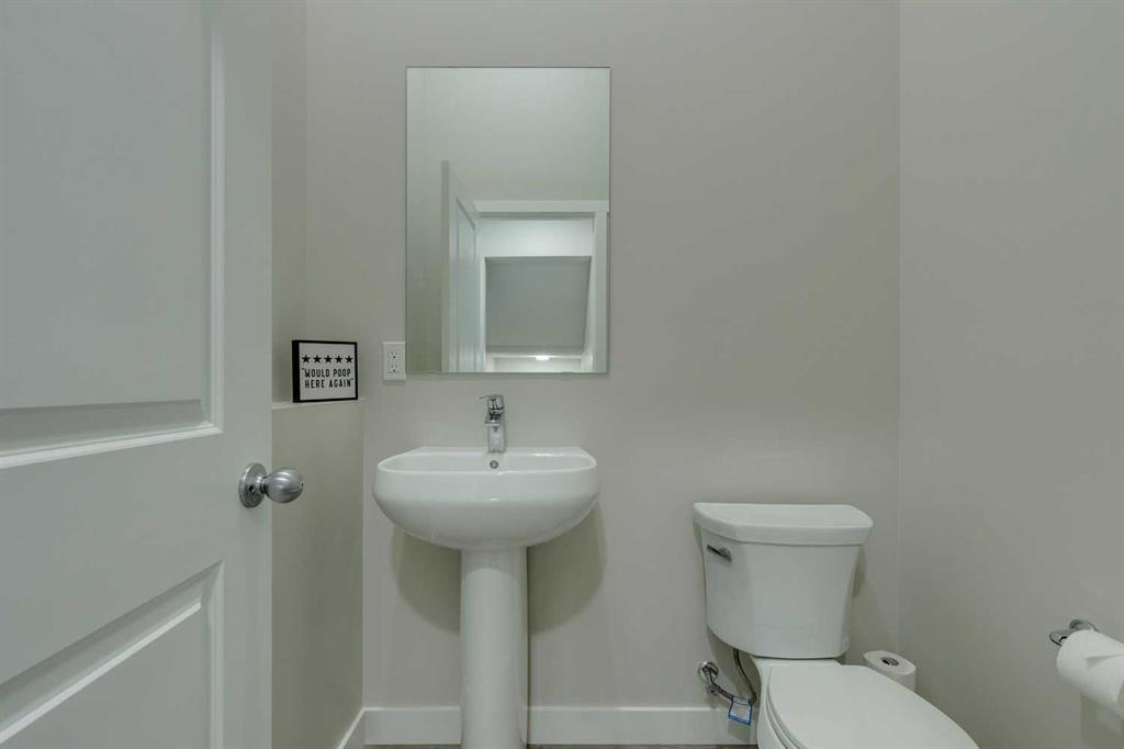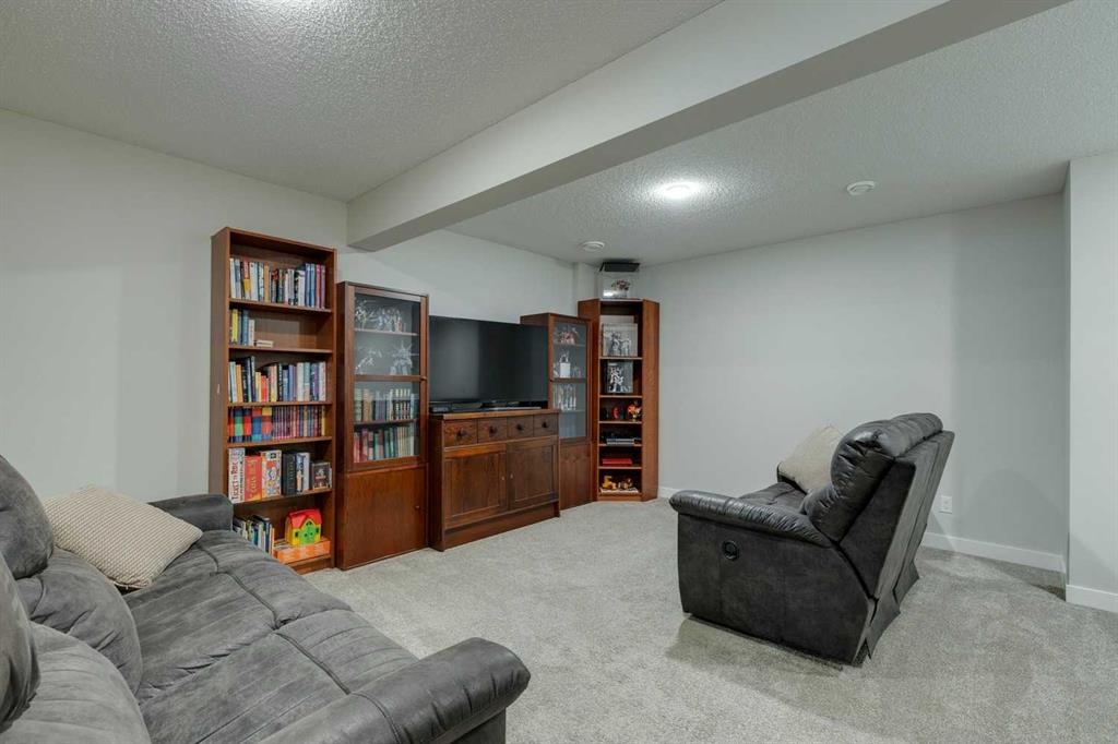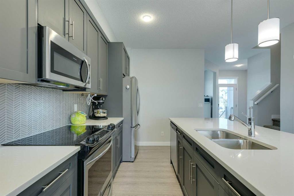Carrington – 201 Carringvue Way NW: Welcome to this beautifully finished, fully developed 2-storey home in the family-friendly community of Carrington. Built by Homes by Avi, this home offers over 2,200 sq ft of living space with a total of 4 bedrooms, 3.5 bathrooms, and a detached double garage. The open-concept main floor is bright and inviting with luxury vinyl plank throughout. At the heart of the home is a stylish kitchen featuring quartz countertops, a herringbone backsplash, stainless steel appliances, and a central island that flows into the dining area with custom built-in bench seating. The living room is filled with natural light from large south-facing windows, while a spacious den and a 2-piece powder room complete the level. Upstairs, you will find the primary suite with a Juliet balcony, a walk-in closet, and a 3-piece ensuite with a walk-in glass shower. Two additional bedrooms, a 4-piece bathroom, and a convenient laundry room provide plenty of space for family living. The lower level was developed by the builder and offers even more living space with a large family room, a games area, a fourth bedroom, a 4-piece bathroom, and convenient under-stair storage. Outside the sunny south-facing backyard is fully landscaped with a deck with a gas line, a stone patio, planter boxes, and a double garage accessed from the paved lane. Recent updates to the home include new shingles and siding (2025) and central A/C (2024). Located in Carrington, a vibrant newer community with parks, playgrounds, pathways, Carrington Pond, a skatepark, and a basketball court – all while offering quick access to Stoney Trail, Deerfoot Trail, CrossIron Mills, and the airport. This turnkey home is ready for you to move in – book a showing today.