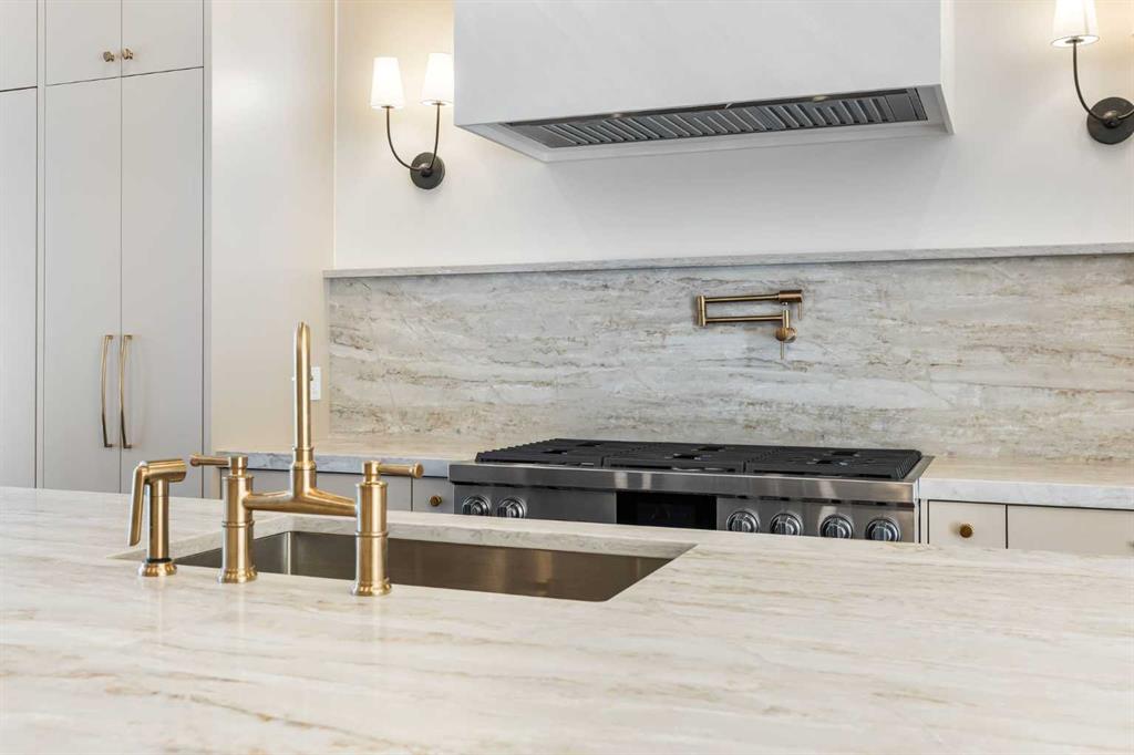 At the heart of the home, the chef’s kitchen is a true masterpiece. It features a 14-foot island with quartz, a quartz backsplash, plaster textured hood fan, pot filler, and oversized premium appliances including a 48” dual oven gas range and a 66” built-in fridge/freezer. There is a butler’s pantry with sink and cabinetry, mud room, coffee bar, and tons of storage including under the island. The kitchen is set up to be not only beautiful but also functional and includes a garbage drawer, bar cooler, and spice racks/cabinetry.