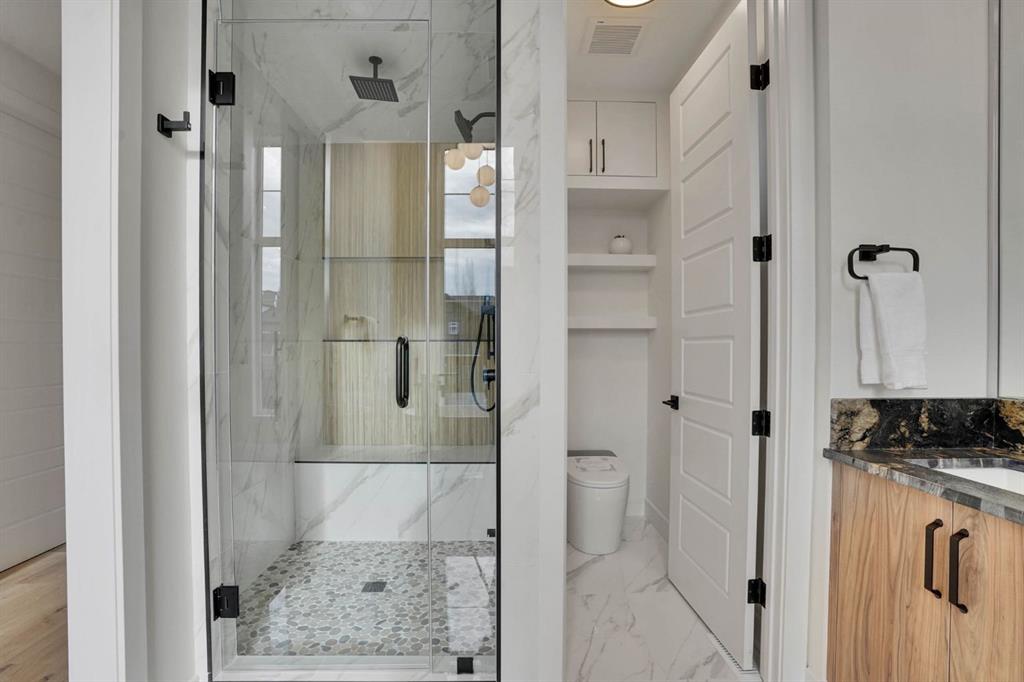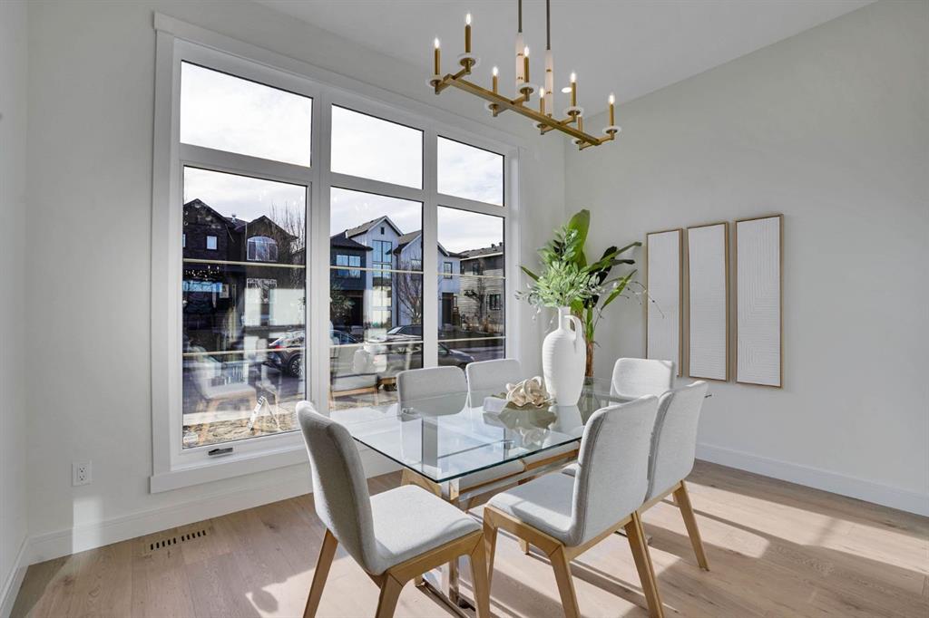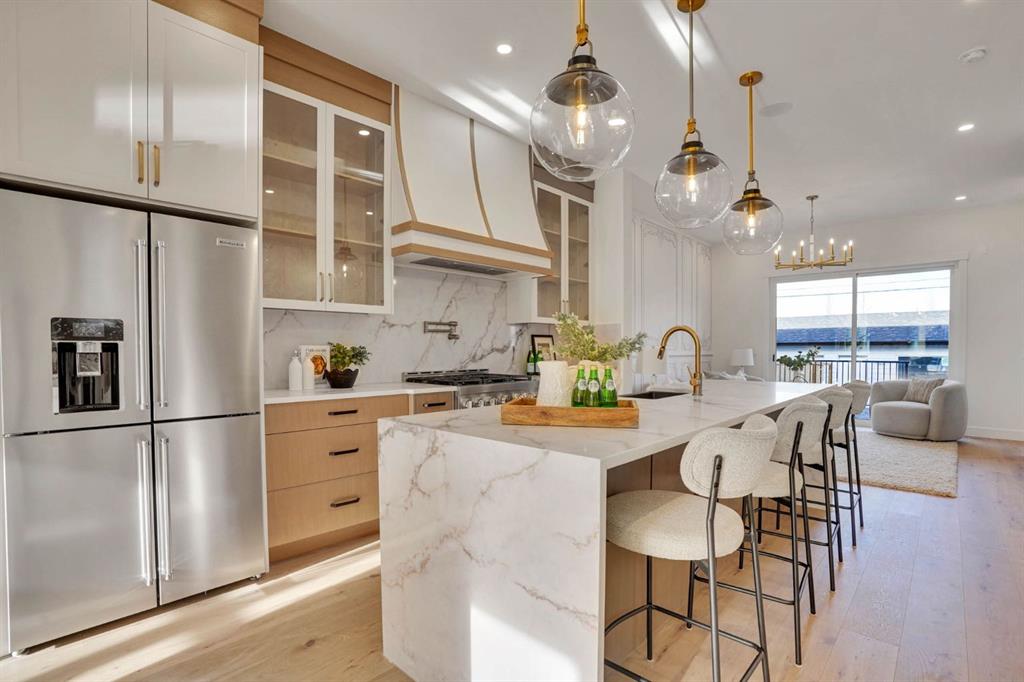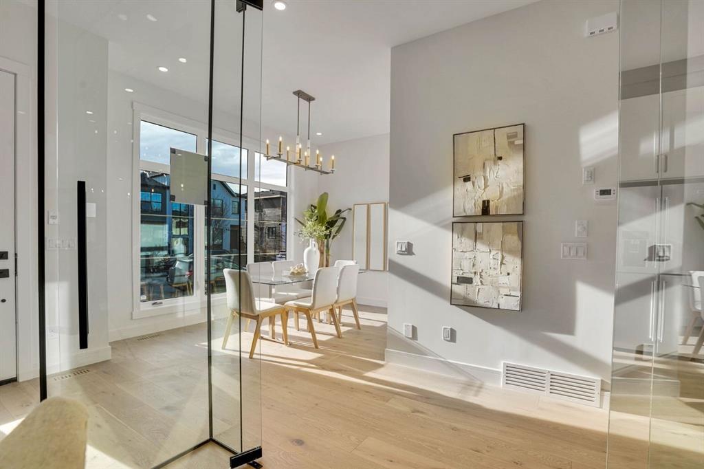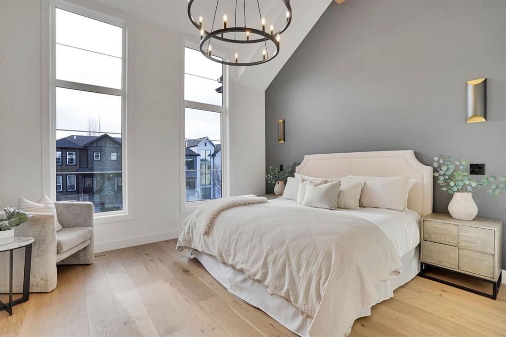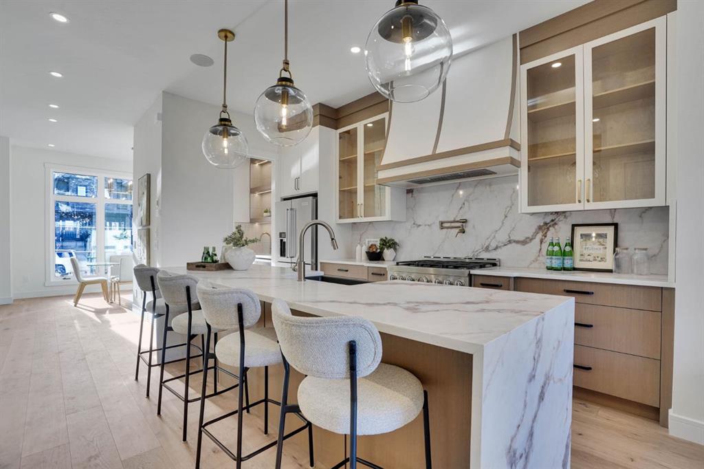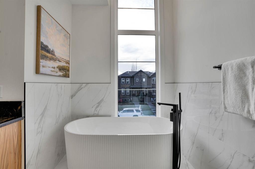 Elegantly crafted and custom-built by Multi Award-Winning Builder Edge Luxury Homes, This exceptional infill residence seamlessly blends elevated design with everyday comfort. Fully finished, professionally landscaped, fenced, and truly move-in ready, this home impresses from the moment you arrive. Step inside to soaring 10-foot ceilings, expansive floor-to-ceiling windows, rich hardwood flooring, and a thoughtfully designed layout that perfectly balances style and functionality. A dedicated main-floor office or den provides an ideal space for remote work or quiet study. The open-concept living area is designed for both relaxation and entertaining. At the heart of the home is a chef-inspired kitchen featuring white oak custom cabinetry, sleek quartz countertops, a stunning waterfall island, premium stainless steel appliances, and elegant glass-front feature cabinets. The adjoining dining area, complemented by a butler’s pantry, is perfectly suited for hosting memorable gatherings. The spacious living room is anchored by full-height rear glass doors, flooding the space with natural light and creating a seamless indoor-outdoor connection. Upstairs, the vaulted primary suite offers a luxurious retreat, complete with a large walk-in closet and a spa-inspired ensuite featuring dual vanities, a freestanding soaker tub, an oversized walk-in shower with steamer rough-in, and heated tile floors. All upper bedrooms feature their own private ensuite bathrooms, offering unmatched comfort and privacy. A cozy bonus room with a skylight is perfect for movie nights, while a convenient laundry room with built-in cabinetry and a sink adds everyday ease.