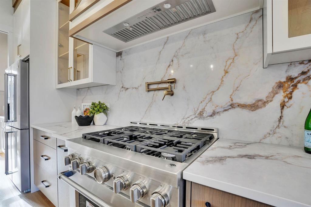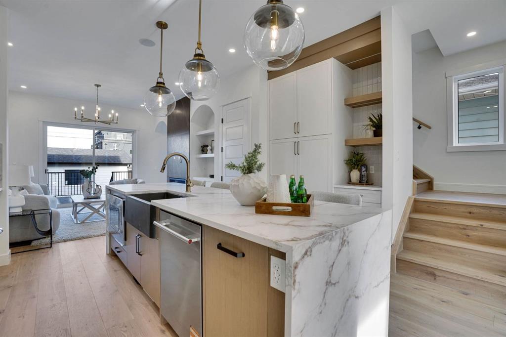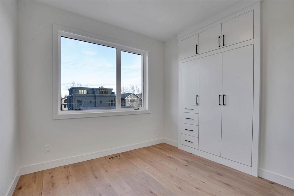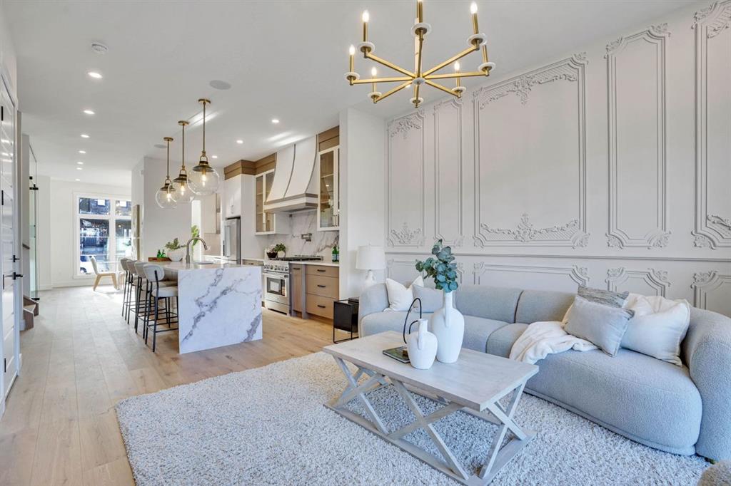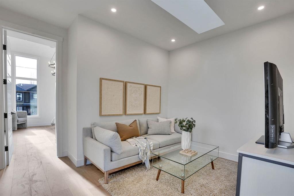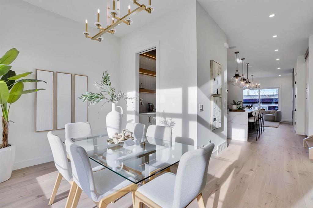 Elegantly crafted and custom-built by Multi Award-Winning Builder Edge Luxury Homes, This exceptional infill residence seamlessly blends elevated design with everyday comfort. Fully finished, professionally landscaped, fenced, and truly move-in ready, this home impresses from the moment you arrive. Step inside to soaring 10-foot ceilings, expansive floor-to-ceiling windows, rich hardwood flooring, and a thoughtfully designed layout that perfectly balances style and functionality. A dedicated main-floor office or den provides an ideal space for remote work or quiet study. The open-concept living area is designed for both relaxation and entertaining. At the heart of the home is a chef-inspired kitchen featuring white oak custom cabinetry, sleek quartz countertops, a stunning waterfall island, premium stainless steel appliances, and elegant glass-front feature cabinets. The adjoining dining area, complemented by a butler’s pantry, is perfectly suited for hosting memorable gatherings. The spacious living room is anchored by full-height rear glass doors, flooding the space with natural light and creating a seamless indoor-outdoor connection. Upstairs, the vaulted primary suite offers a luxurious retreat, complete with a large walk-in closet and a spa-inspired ensuite featuring dual vanities, a freestanding soaker tub, an oversized walk-in shower with steamer rough-in, and heated tile floors. All upper bedrooms feature their own private ensuite bathrooms, offering unmatched comfort and privacy. A cozy bonus room with a skylight is perfect for movie nights, while a convenient laundry room with built-in cabinetry and a sink adds everyday ease.