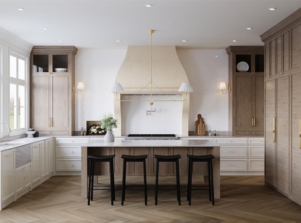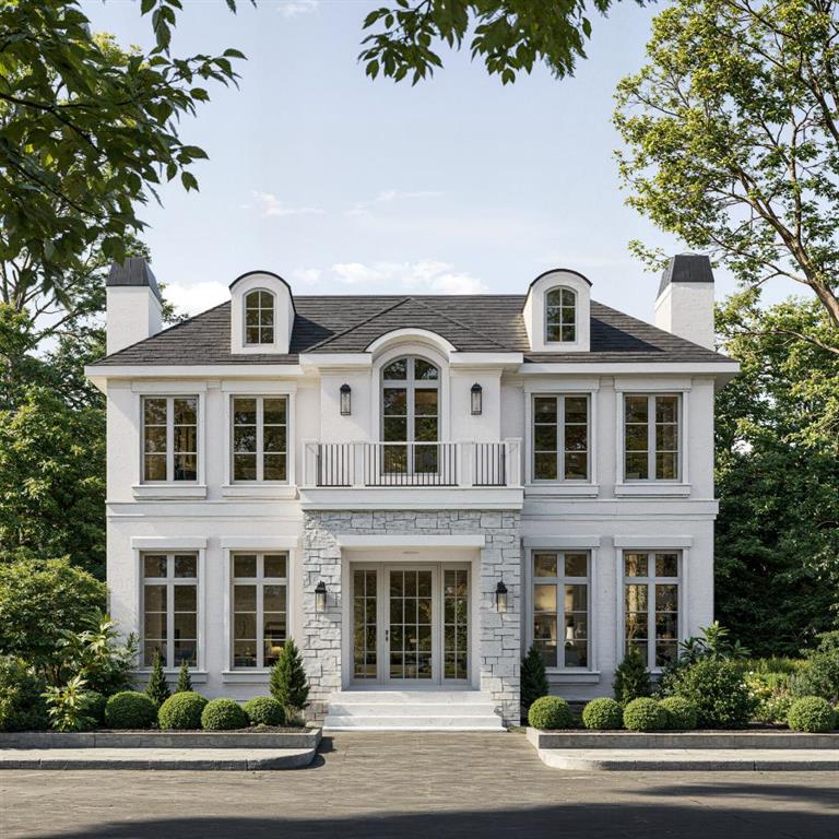 Nestled in the prestigious community of North Glenmore Park, this masterfully designed French Parisian–inspired residence by Bright Custom Homes offers over 5,100 sq ft of exquisitely finished living space across three levels. Set on a full-size lot, this 5 bedroom, 5 bathroom estate blends classical charm with modern sophistication, curated in collaboration with Aly Velji Designs. The main level welcomes you with grand proportions, 10′ ceilings, extensive millwork, and herringbone patterned hardwood flooring. The chef’s kitchen features a curved Venetian plaster hood, Sub-Zero and Wolf appliances, custom cabinetry, natural quartzite, and intricate crown detailing. A fully equipped large butler’s pantry with vertical storage, and integrated prep space connects directly to the formal dining room adorned in custom wall panel moulding and natural light, ideal for hosting. The open concept living room offers coffered ceilings, a gas fireplace, and built-ins, while the adjacent dining nook opens to both a covered rear deck and an open air deck for year round entertaining. A beautifully appointed mudroom features Saltillo tile with black inserts, full-height custom cabinetry, a floating shelf, and a built-in bench. Near the foyer, a front facing office provides a quiet workspace with custom panel moulding, warm white millwork, and matching herringbone hardwood, the entire office in colour-drenching moment enclosed by glass paneled French doors. Heading upstairs from the curved staircase with curved drywall. Upstairs, the high tray ceiling primary suite includes a walk-in closet with reeded millwork and a luxurious ensuite with natural quartzite, double vanity, makeup desk, heated floors, and a curved steam shower. Three secondary bedrooms, two sharing a Jack & Jill bath and one with its own ensuite, are finished with elevated tile selections, polished chrome Delta hardware, and designer wall treatments. The upper level also includes a generous laundry room with built-ins and quartz surfaces, linen storage, and access to a private balcony. The fully developed basement features in-floor radiant heating, a spacious rec room, white oak bar with island, gym area, and a rough-in for a golf simulator ready for a full swing enclosure and projection system. A fifth bedroom and full bathroom complete the lower level. The home includes A/C, in-floor heat, dual hot water tanks (including one for radiant heating), smart thermostats, and full mechanical rough-ins for automation, security, speakers, and motorized blinds. Exterior highlights include triple-pane windows, acrylic stucco with stone veneer, and a fully insulated garage with drywall and EV charging rough-in. With its refined layout, elevated craftsmanship, and architectural character, this residence is a rare opportunity in one of Calgary’s most sought-after inner-city neighborhoods. Buyer’s will have the opportunity to work with the interior designer and make changes to the selections. Call today to book your private tour!