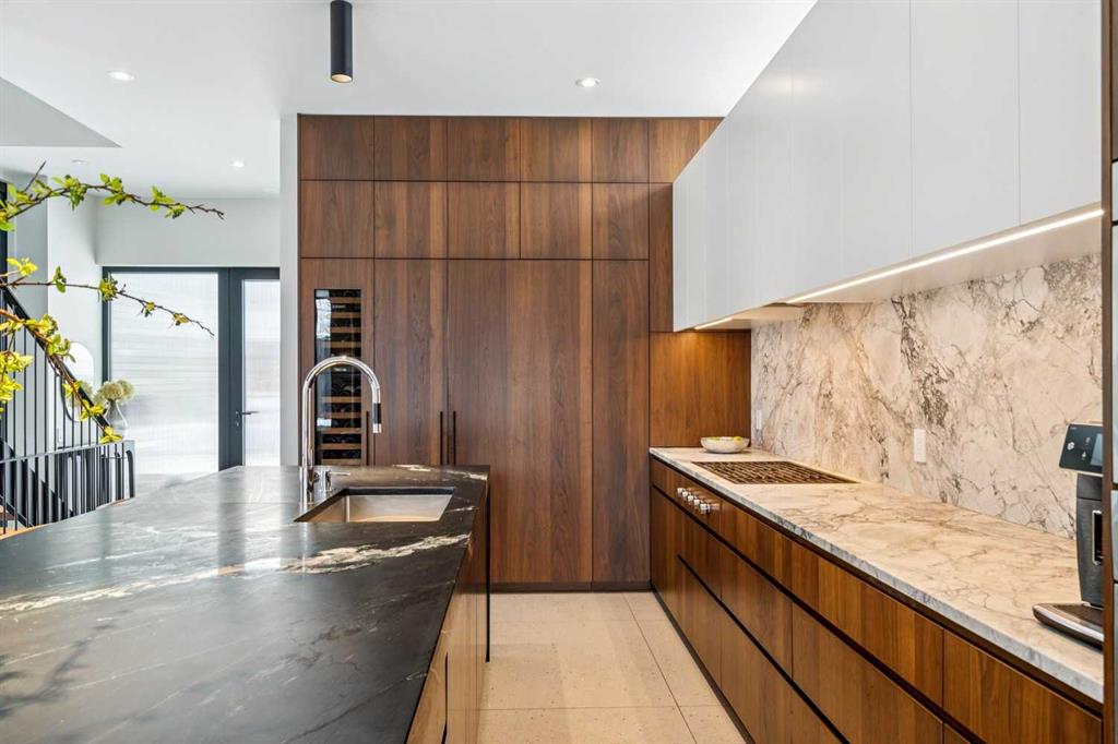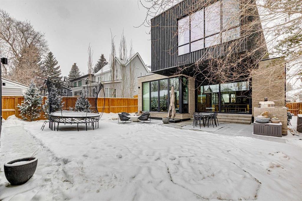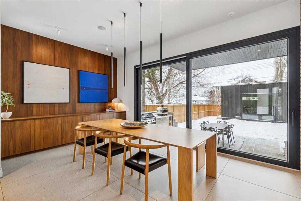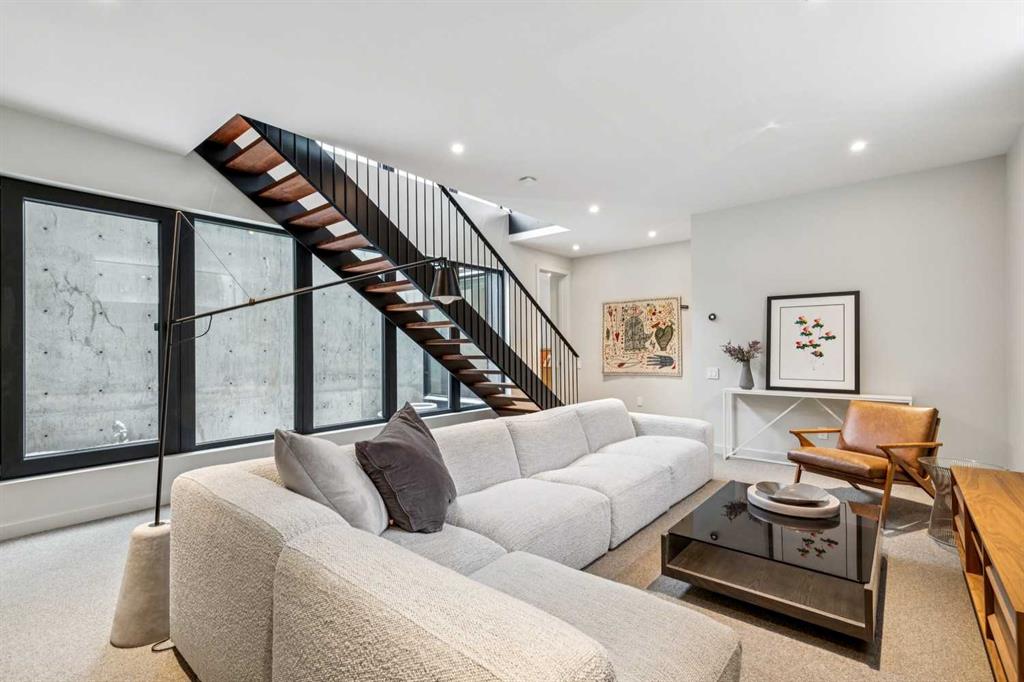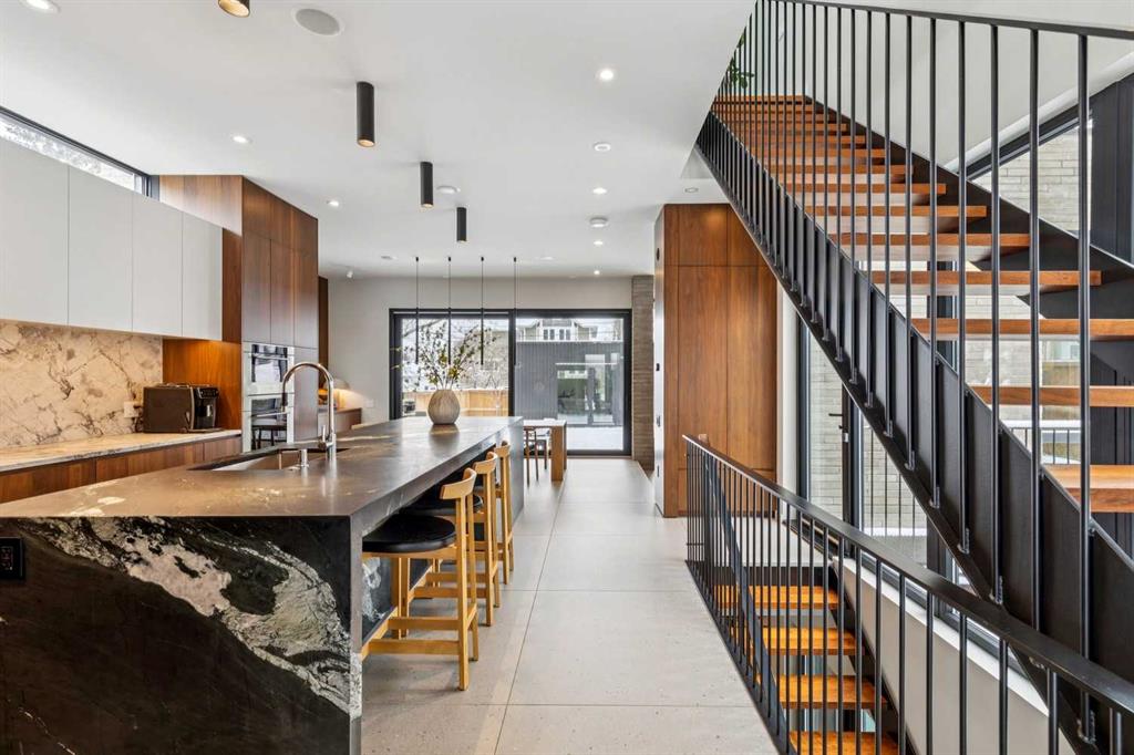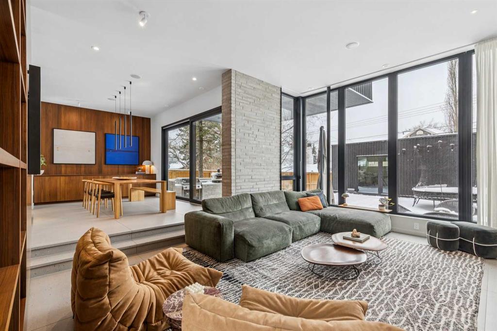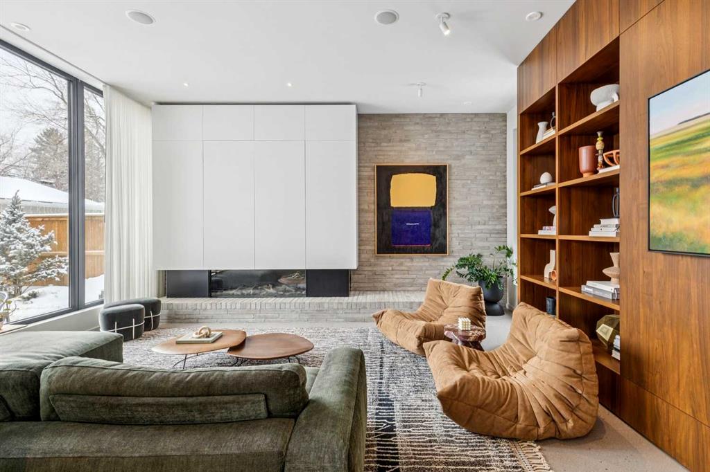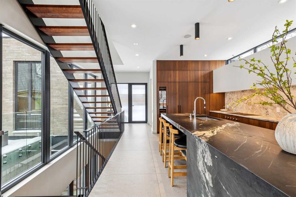 A rare opportunity to own a Bioi-designed architectural residence, featured in Western Living + specifically crafted for modern indoor-outdoor living. Extraordinary natural light, anchored by a striking two-storey light well and a private south-facing backyard on a quiet street. Dramatic sunken living room with interior brick, walnut millwork + a concrete ribbon fireplace with hidden TV + integrated cabinetry. Full-height glazing brings outstanding natural light, complemented by large-format ceramic flooring + rich walnut detailing throughout. Kitchen: integrated appliances, expansive island, Sub-Zero wine fridge, Wolf appliances + soapstone and marble counters. Office: 12-foot ceilings, floor-to-ceiling windows, automated blinds, pocket reeded glass door + custom walnut built-ins. Upstairs: three bedrooms including children’s rooms with built-in desks, plus a serene primary retreat with built-in closet system + a skylit shower. Lower level: bright two-storey west light well, large playroom, generous storage + an additional bedroom with full-height window. Outdoor living: south-facing, fully landscaped yard with a striking cantilever creating a covered concrete patio lounge with outdoor kitchen, firepit, + irrigation for easy maintenance + two custom steel garden beds. Comfort + efficiency: radiant heat, air conditioning, upgraded natural wool carpet, electric vehicle charging ready + European tilt and turn windows. Double garage + a spacious exterior gym. Walk to the Glemore Reservoir pathway system, River Park, tennis, pool + arenas.