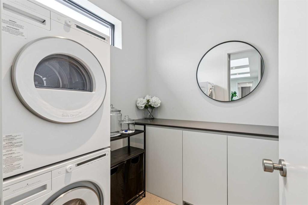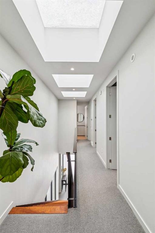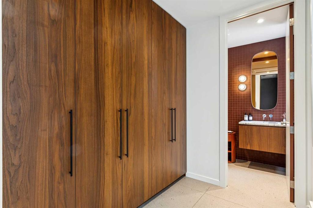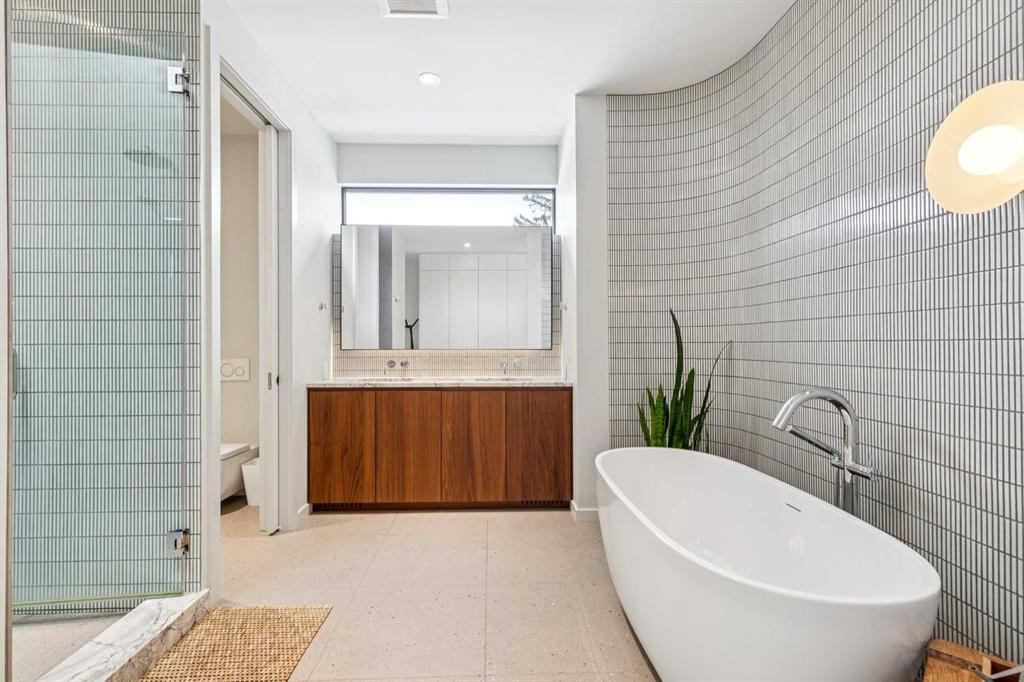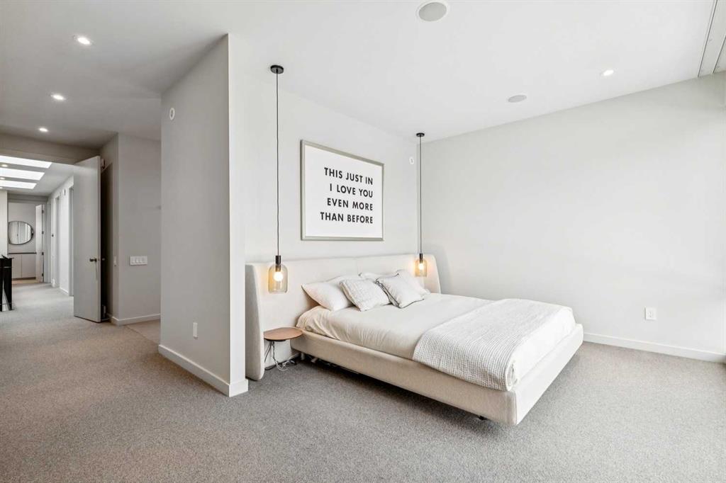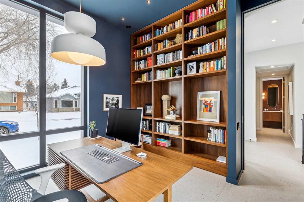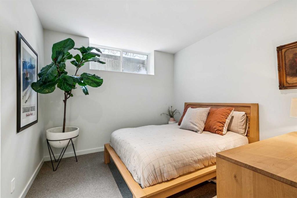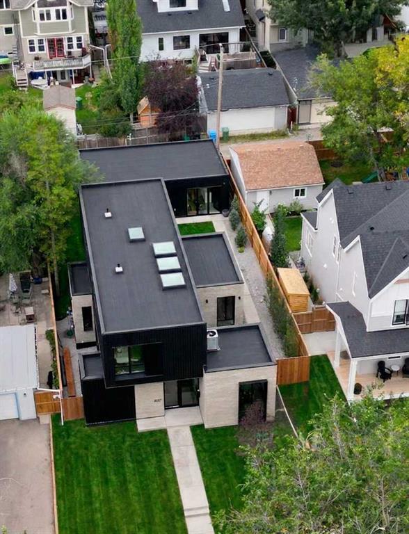 A rare opportunity to own a Bioi-designed architectural residence, featured in Western Living + specifically crafted for modern indoor-outdoor living. Extraordinary natural light, anchored by a striking two-storey light well and a private south-facing backyard on a quiet street. Dramatic sunken living room with interior brick, walnut millwork + a concrete ribbon fireplace with hidden TV + integrated cabinetry. Full-height glazing brings outstanding natural light, complemented by large-format ceramic flooring + rich walnut detailing throughout. Kitchen: integrated appliances, expansive island, Sub-Zero wine fridge, Wolf appliances + soapstone and marble counters. Office: 12-foot ceilings, floor-to-ceiling windows, automated blinds, pocket reeded glass door + custom walnut built-ins. Upstairs: three bedrooms including children’s rooms with built-in desks, plus a serene primary retreat with built-in closet system + a skylit shower. Lower level: bright two-storey west light well, large playroom, generous storage + an additional bedroom with full-height window. Outdoor living: south-facing, fully landscaped yard with a striking cantilever creating a covered concrete patio lounge with outdoor kitchen, firepit, + irrigation for easy maintenance + two custom steel garden beds. Comfort + efficiency: radiant heat, air conditioning, upgraded natural wool carpet, electric vehicle charging ready + European tilt and turn windows. Double garage + a spacious exterior gym. Walk to the Glemore Reservoir pathway system, River Park, tennis, pool + arenas.