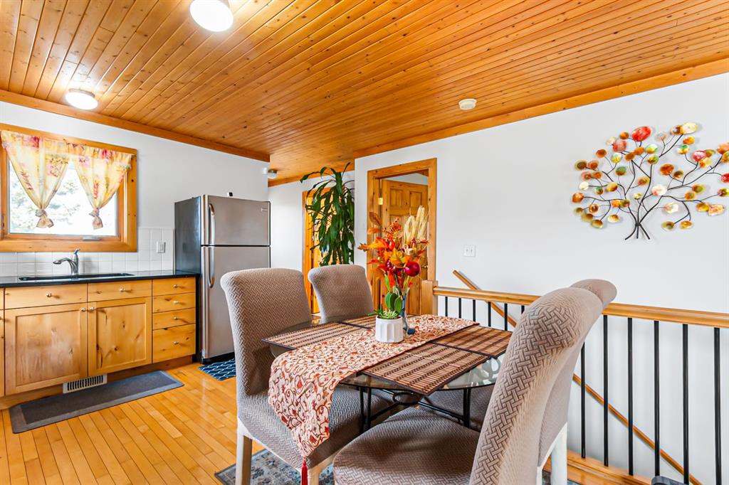 Situated on a peaceful street just steps from Didsbury’s amenities, this 2 bedroom, 2 full bathroom home is the perfect blend of comfort, modern day character, and small-town charm. Its 808 sqft footprint is thoughtfully laid out to make the most of every inch ! It’s Ideal for first-time buyers, downsizers, or anyone looking to slow down and enjoy a simpler way of life. Warm HARDWOOD FLOORS set the tone the moment you walk through the door, pairing beautifully with the natural wood kitchen cabinetry and the unique wood slat ceiling overhead. The kitchen features stainless steel appliances, while the OPEN LAYOUT allows light to flow easily through the main living space .. creating a welcoming atmosphere that feels instantly like home.
