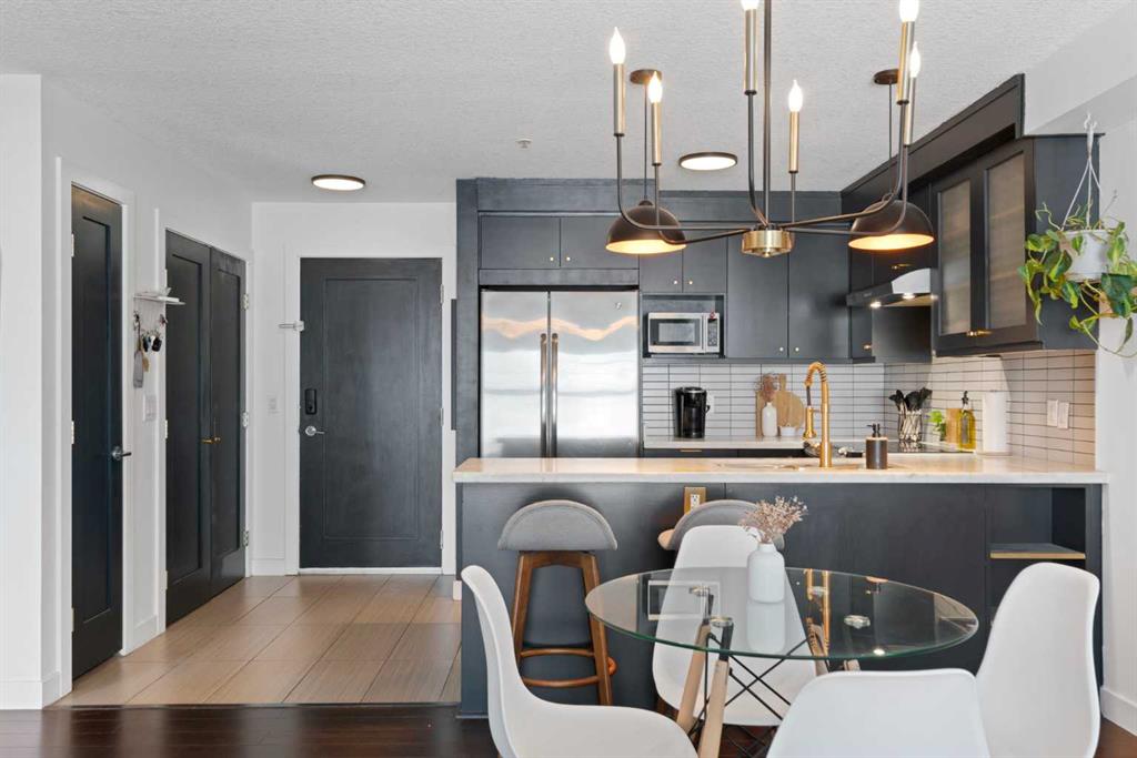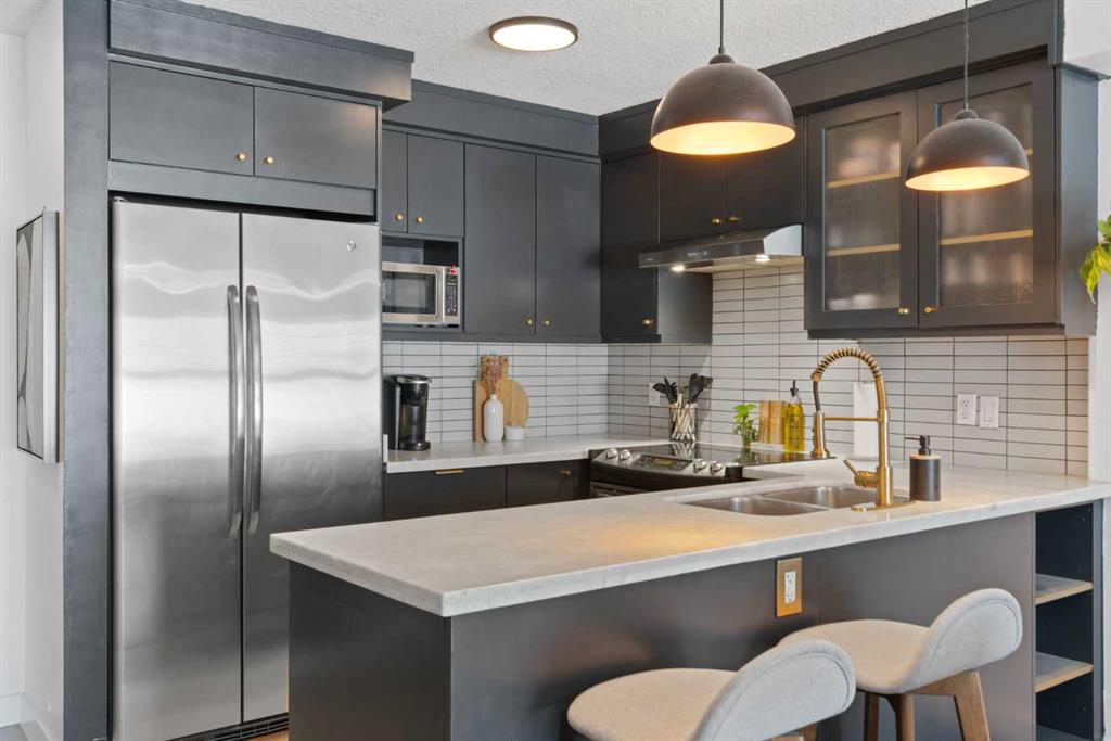 Welcome to this beautifully upgraded condo in one of Calgary’s most sought-after inner-city neighbourhoods. Thoughtfully designed with a modern open-concept layout, this home immediately impresses with rich hardwood floors, soaring windows that flood the space with natural light, and a cozy gas fireplace that anchors the living room.