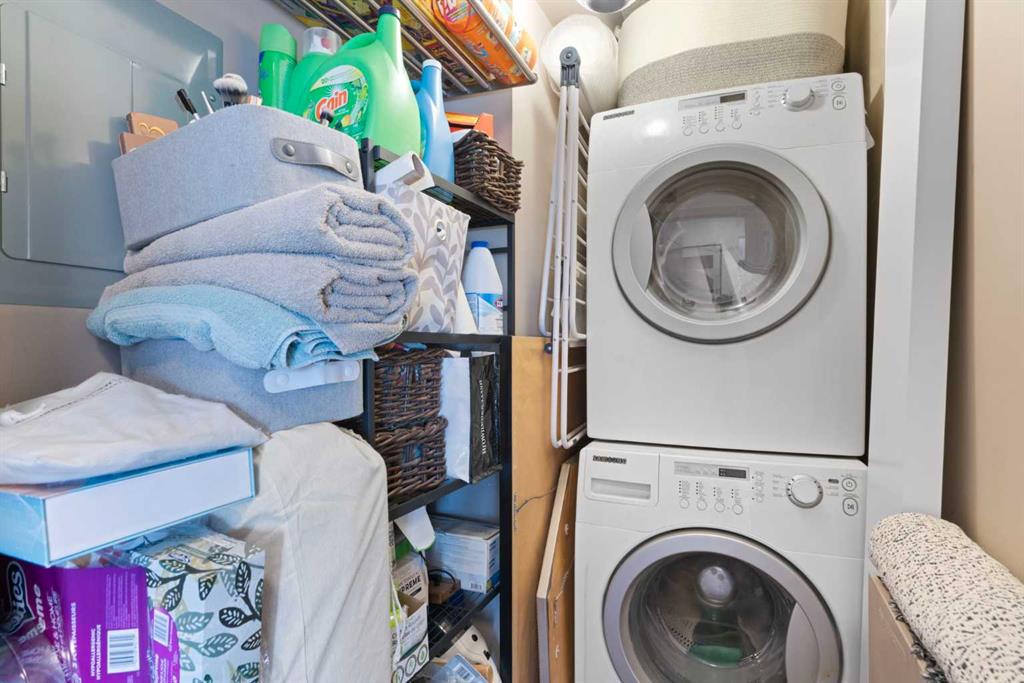 The oversized primary bedroom offers the kind of space that’s rare to find, while the updated bathroom is clean and modern. An in-suite laundry with additional storage rounds out the practical side of condo living.
