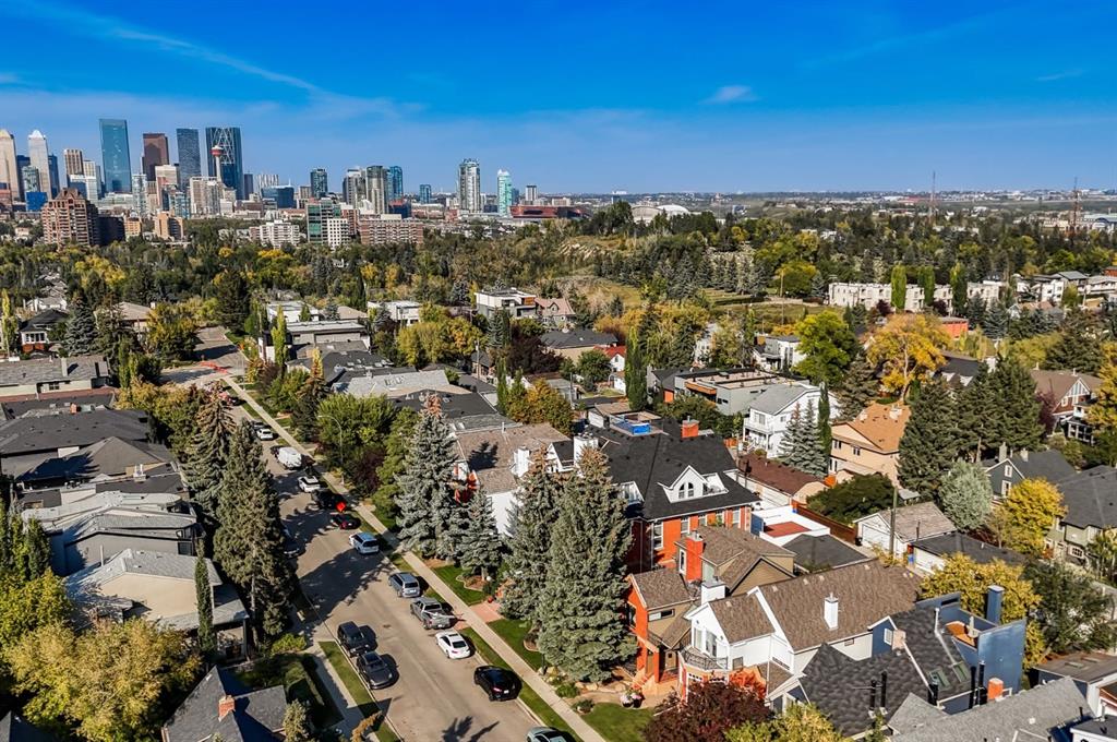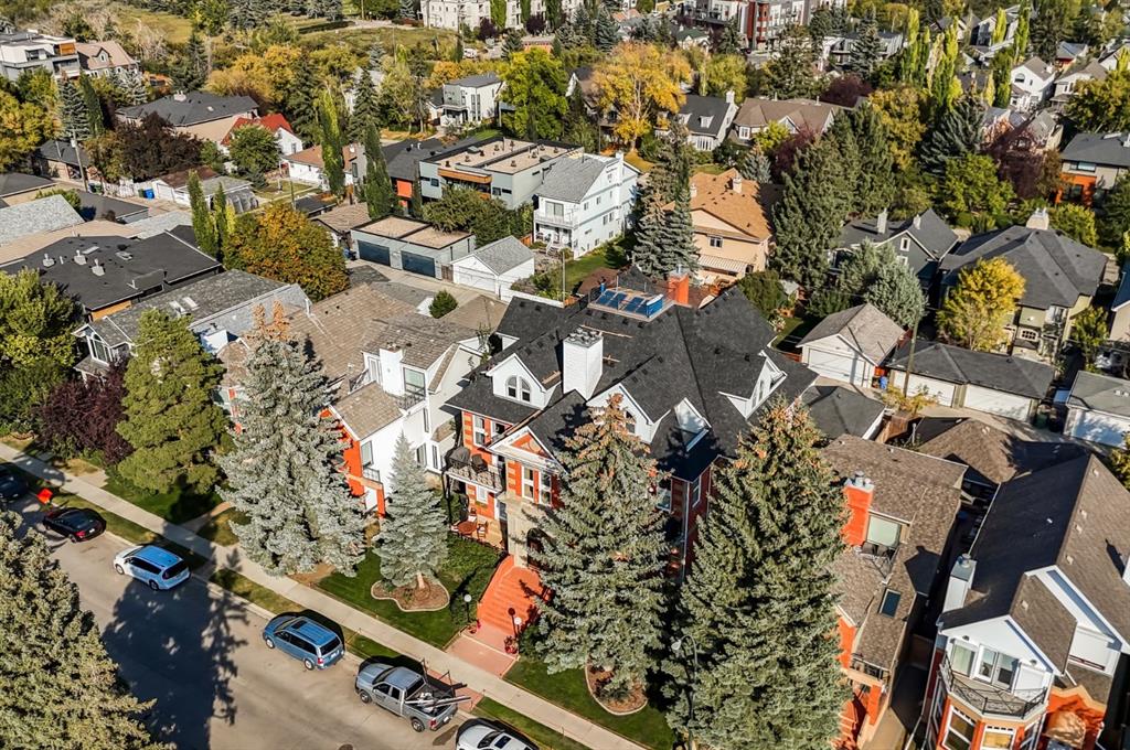 Designed over two expansive levels, this unique home features soaring 12 foot ceilings on the main floor, beautiful hardwood flooring, and an abundance of natural light through oversized windows, skylights, and French doors. The elegant living and dining areas open onto a spacious west facing balcony, while the sunlit kitchen and family room at the rear of the home flow out onto your private deck, perfect for morning coffee or evening entertaining. Upstairs, a stunning skylit staircase leads to two generously sized bedrooms, both with vaulted ceilings, private ensuite bathrooms, and individual balconies. The primary suite also boasts an attached office that could easily be converted into a 3rd bedroom. Additional features include a common elevator, a private back entrance with mudroom and laundry/storage area, plus a rare double detached garage with a massive (over 400 sq/ft) rooftop deck ideal for taking in the serene surroundings. Situated in one of Calgary’s most desirable communities, this one of a kind home offers the perfect balance of heritage charm and contemporary sophistication.