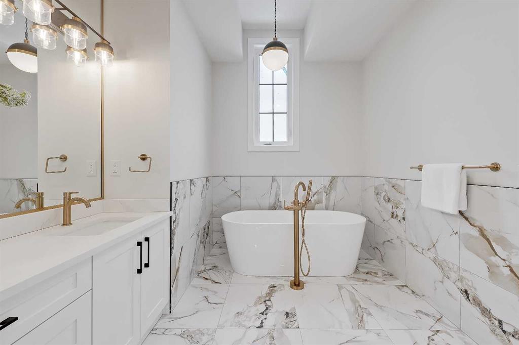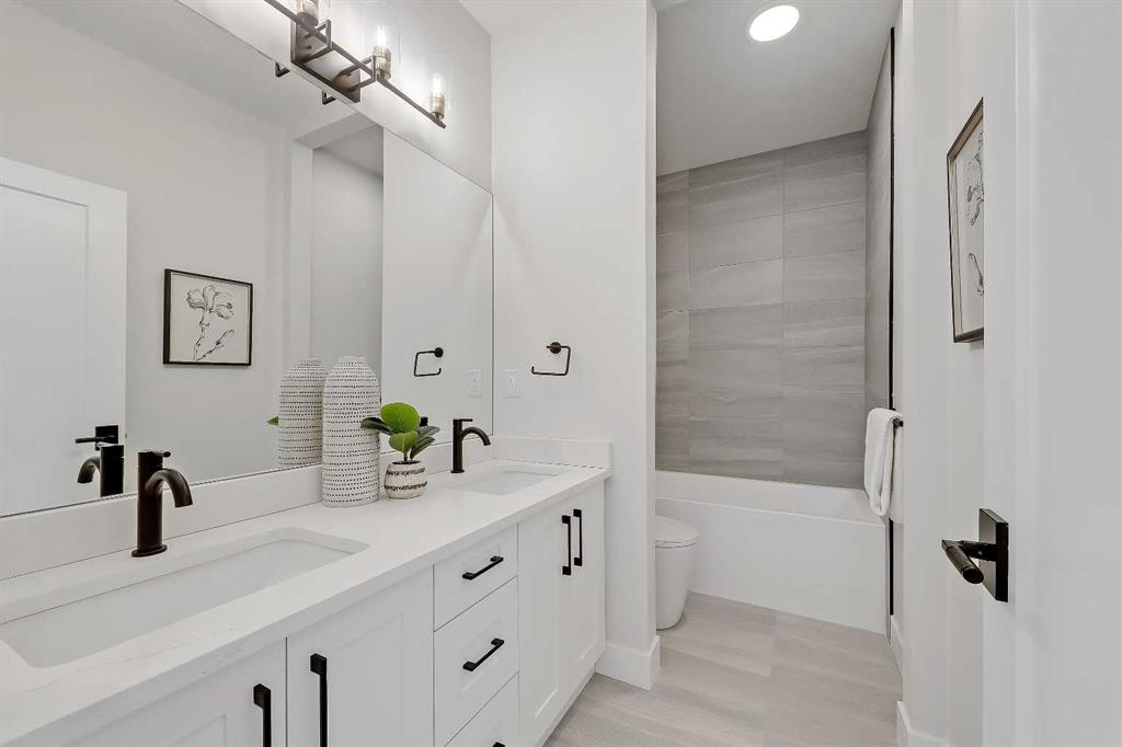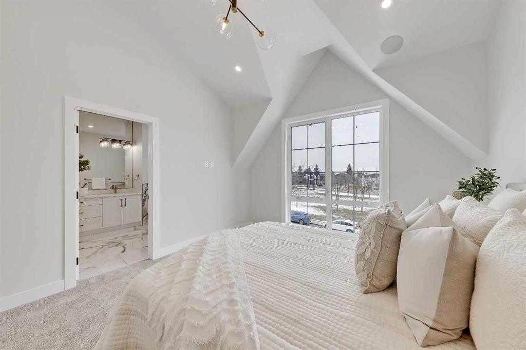 Upstairs, the PRIMARY SUITE feels like a true retreat with VAULTED CEILINGS, large windows, and a spacious WALK-IN CLOSET. The ENSUITE is finished with a FREESTANDING SOAKER TUB, GLASS SHOWER, and DOUBLE VANITY, blending clean design with everyday comfort. Two additional bedrooms are well-sized and connected by a JACK & JILL BATHROOM, while the centrally located LAUNDRY room adds convenience exactly where it’s needed.