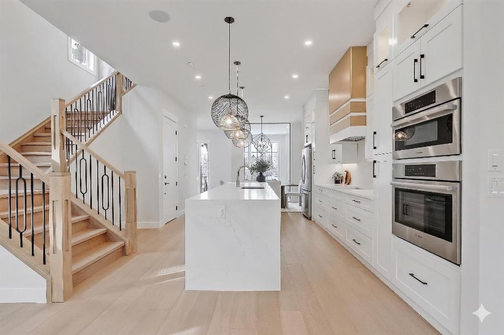 The KITCHEN anchors the space with a long QUARTZ ISLAND, BUILT-IN OVEN, sleek cabinetry, and a layout designed to function as well as it looks. At the rear, the LIVING ROOM is warm and inviting, centred around a GAS FIREPLACE with CUSTOM BUILT-INS. Large sliding doors span the back wall, bringing in natural light and opening onto the deck and backyard for an easy indoor-outdoor connection. A discreet POWDER ROOM and smart storage complete the main level.