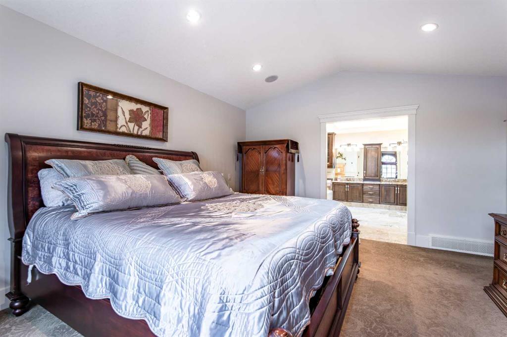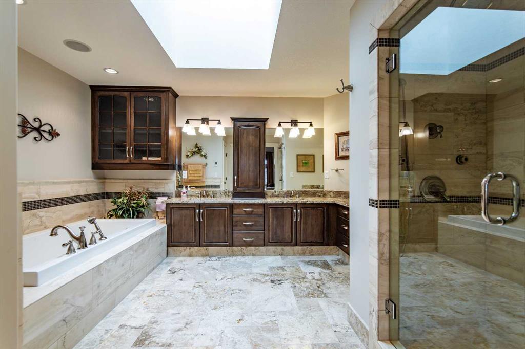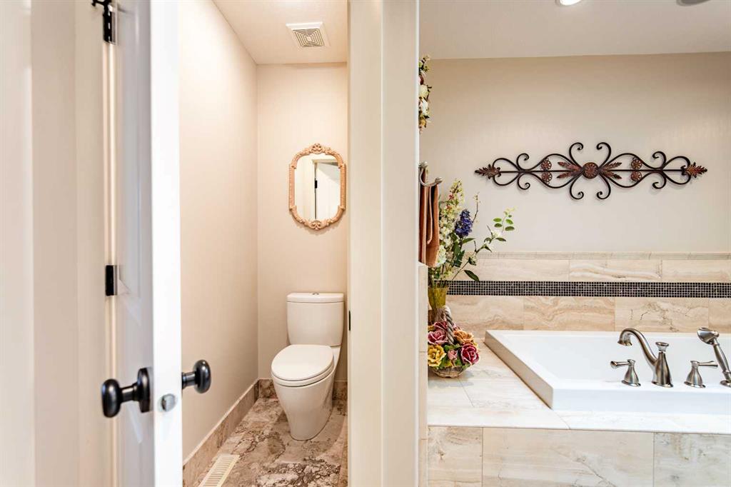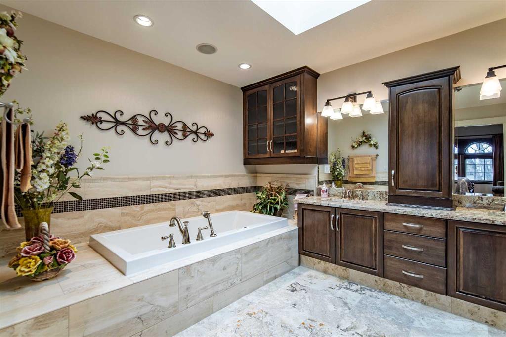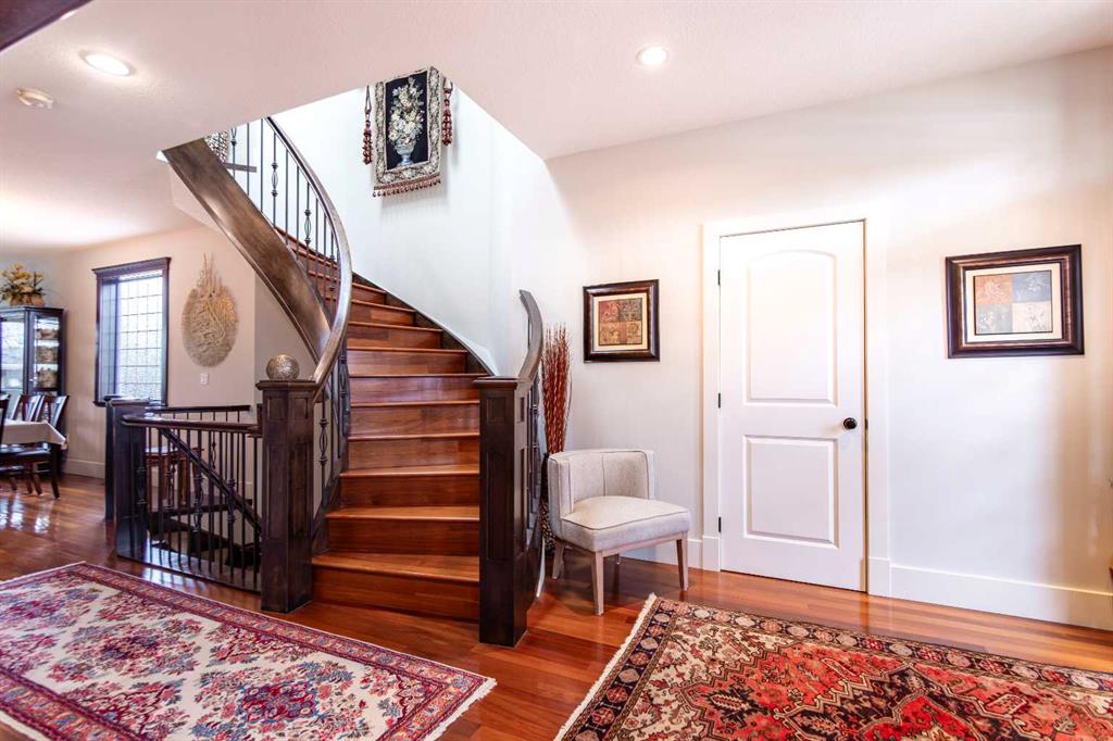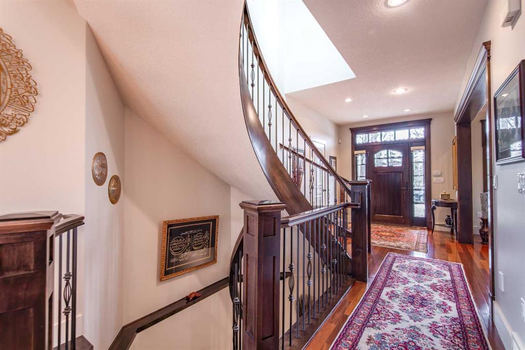 A stunning spiral staircase leads to the upper level, where you’ll find three spacious bedrooms, a convenient laundry room, and a well-appointed 4-piece bathroom. The luxurious primary suite offers a walk-in closet and a spa-like 5-piece ensuite complete with heated travertine floors, dual sinks, and a relaxing jetted tub.
