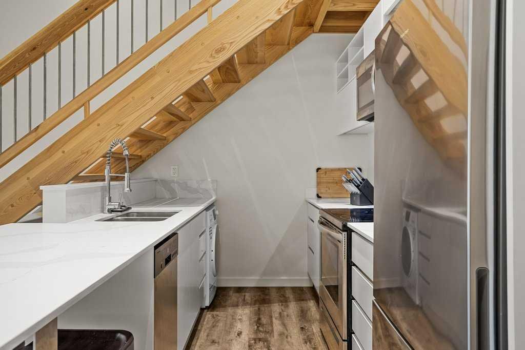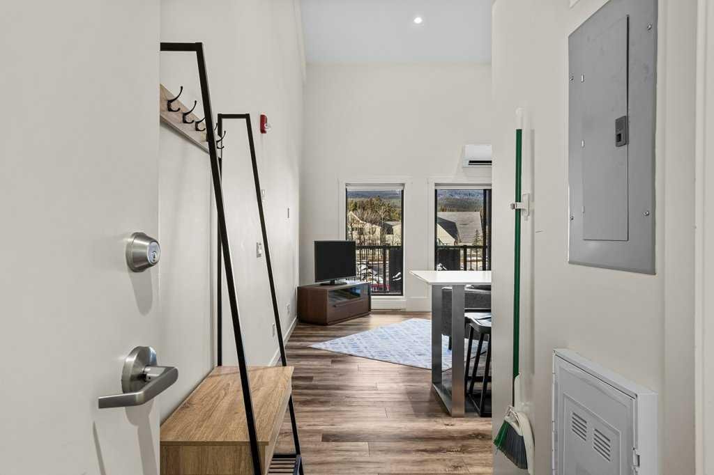 Welcome to this stylish and highly functional loft-style unit located in the heart of Canmore. Thoughtfully designed and fully furnished, this contemporary retreat blends comfort, convenience, and mountain-town charm. Step inside to an open, airy layout featuring sleek stainless-steel appliances and an abundance of cabinet space to keep everything organized. The unit also includes a European-style in-suite washer/dryer, adding exceptional everyday convenience. A covered private deck extends the living space outdoors, perfect for relaxing and taking in the fresh mountain air year-round. This property offers outstanding amenities, including secured bike storage, individual storage lockers, and the added benefit of industrial-grade laundry machines onsite for larger loads. Perfectly situated, the location is a standout: walking distance to downtown Canmore and just moments from shopping, transit, nature trails, the golf course, and the area’s endless outdoor recreation.