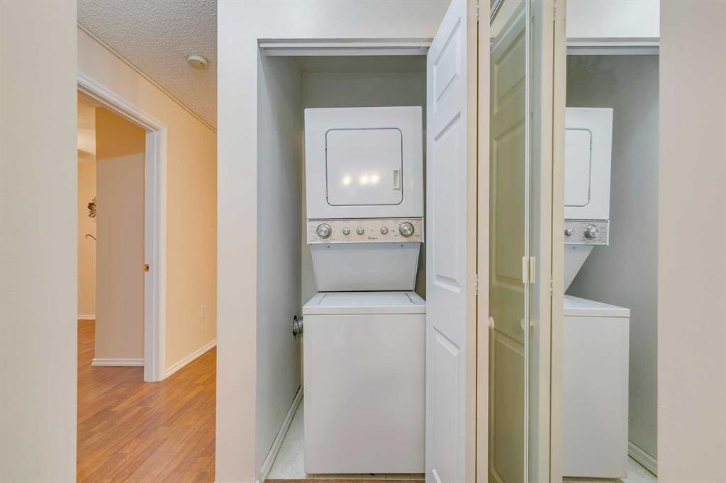 Welcome home to this bright and inviting, 2-bedroom, south-facing condo , drenched in natural light from morning to evening. Enjoy the generous balcony overlooking mature trees that provide both privacy and a lovely, peaceful outdoor view. Stay cool during warm summer days with the added comfort of AIR CONDITIONING, the functional floor plan includes a full in-suite laundry area with stacking washer/dryer and a large storage room to keep everything organized. The pride of ownership is evident – this freshly painted unit is exceptionally well cared for. Attractive laminate flooring spans the home, and the kitchen features tasteful cabinet and countertop updates, along with quality appliances including a Whirlpool microwave and fridge, Maytag stove, and Frigidaire dishwasher. A spacious front coat closet adds even more convenience. Both bedrooms are well-proportioned, and the bathroom offers excellent storage options , this is a rare find. Located in Dover, this condo provides quick access to Deerfoot Trail for an easy 10–15 minute commute into downtown or to other major areas of the city. You are also just moments from the ridge and a short walk to the Bow River pathway perfect for nature lovers, cycling, and daily walks. Nearby Co-op shopping adds to the convenience. The complex boasts mature landscaping and tall trees, contributing to a serene environment. You’ll also appreciate accessible parking, clean garbage facilities, and plenty of visitor parking for your guests. A bright, well-located, and affordable opportunity ideal for those seeking comfort, convenience, and value, whether you’re an investor or looking for your future home.