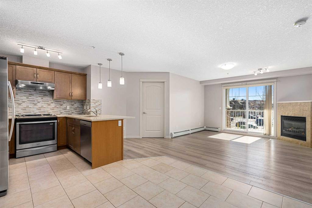 The kitchen features rich maple cabinetry, stainless steel appliances, modern tile backsplash, and a convenient peninsula with additional seating. The spacious living room is filled with natural light and offers a cozy corner gas fireplace with direct access to the private balcony — perfect for relaxing or enjoying your morning coffee.