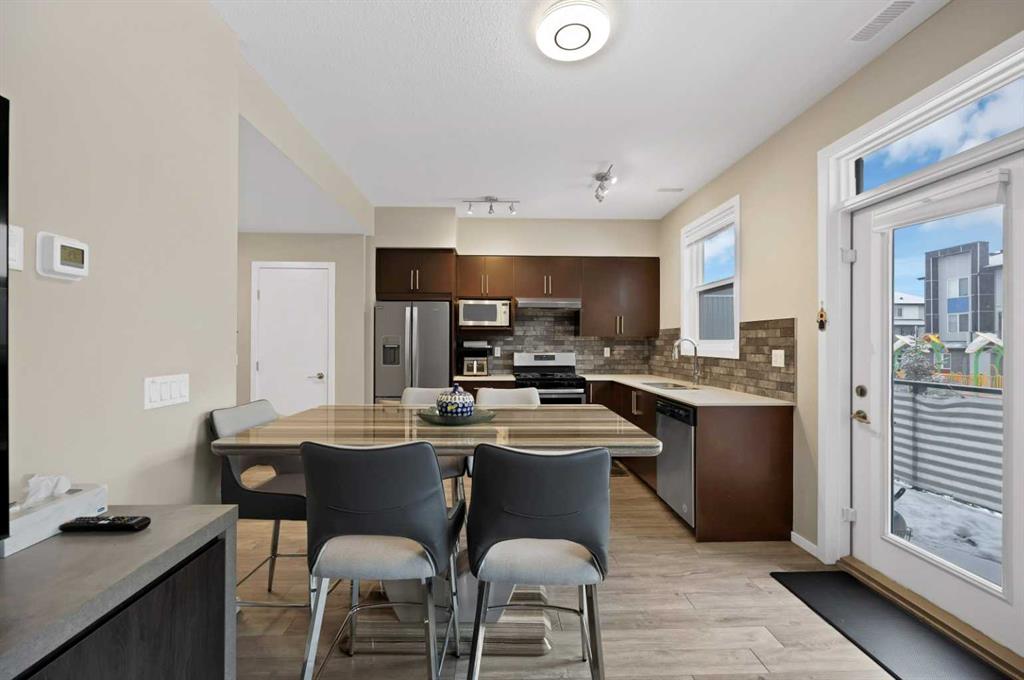 3 BEDS | 3.5 BATHS | MULTI LEVEL TOWNHOME | CORNER END-UNIT | SEPARATE ENTRANCE | Welcome to this beautiful CORNER MULTI LEVEL END-UNIT TOWNHOME nestled in the highly sought-after community of Redstone, offers unparalleled convenience and comfort. This corner end unit is perfectly positioned to enjoy full-day sunshine as it’s directly backing onto a large park. This spacious 3-level home offers a thoughtful layout with 3 bedrooms, 3.5 bathrooms and a convenient parking stall out-front. The entry level features a versatile bedroom that can serve as a guest room, office or flex space with and attached full bathroom. The open-concept second level is designed for both everyday living and entertaining, showcasing a bright and modern kitchen with ample cabinetry, quartz countertops, stainless steel appliances, a large living room and a dining area with a leading door to the balcony, where you can enjoy summer evening barbecues and soak in the vibrant atmosphere. On the second level, you’ll find two luxurious primary bedrooms boasting a pristine en-suite in each and a spacious walk-in closet ensuring comfort and privacy for all occupants. Laundry is thoughtfully located on the upper floor for added convenience. Large windows throughout the home create a bright and inviting atmosphere, while the location offers easy access to parks, walking paths and family-friendly green spaces just steps from your front door. With its unbeatable location and immaculate condition, this property is a rare find in today’s market. Don’t miss out on the opportunity to make it yours – schedule a showing with your favorite realtor today before it’s gone!