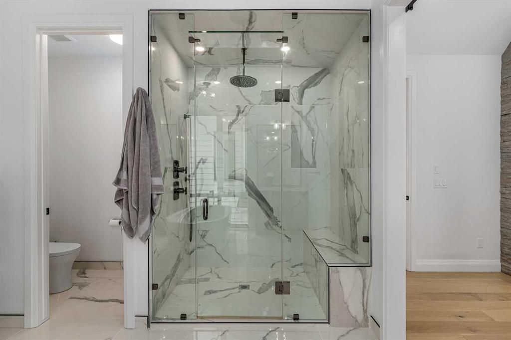 The second floor features 9′ CEILINGS, a sun-drenched south-facing primary retreat with vaulted ceilings, another GAS FIREPLACE, and a truly STATE OF THE ART ENSUITE BATHROOM. This level also includes a beautifully appointed laundry room, a refined 5PC bathroom, and two additional generously sized bedrooms, each with a walk-in closet.