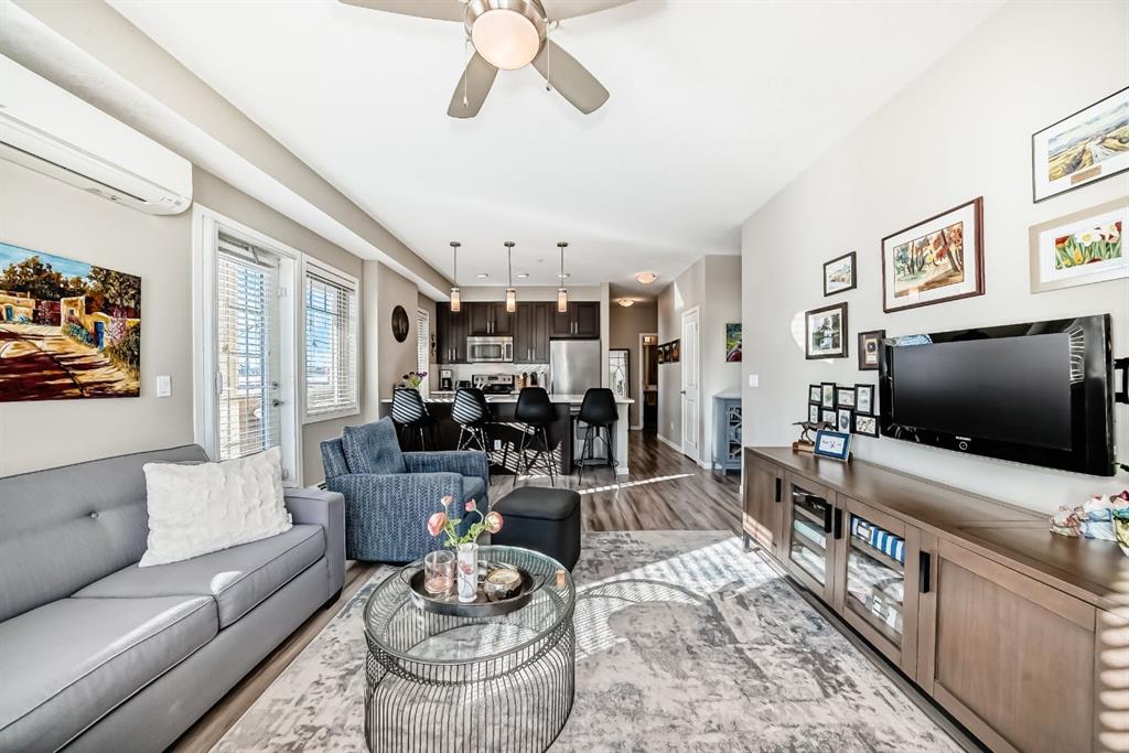 OPEN HOUSE SATURDAY, FEBRUARY 28 1:00–3:00PM. Welcome to this beautifully maintained 2 bedroom, 2 bathroom corner unit in an unbeatable location. With desirable south facing exposure, this home is filled with natural light throughout the day, creating a warm and inviting atmosphere. The thoughtfully designed layout offers a rare hallway entrance that opens into a bright, open concept living space, creating both privacy and flow. A front entry closet and two additional pantry closets provide exceptional storage, while in unit laundry adds everyday convenience. The primary bedroom features built in shelving within the walk in closet and a private 3 piece ensuite bathroom. Stainless steel appliances were updated in 2019, and air conditioning keeps the space comfortable during the summer months, making this home truly move in ready. Step outside onto the impressive 36 foot south facing balcony with mountain views, an ideal extension of your living space to enjoy a quiet morning coffee or relax in the evening sun. Additional highlights include heated underground parking with a storage locker conveniently located directly in front of the stall, stairwell access just outside the unit, and a private gym within the building. Situated in a vibrant, amenity rich community with shops, dining, schools, and everyday essentials within walking distance, this is condo living at its best. Don’t forget that you will have lake access all year round for swimming and skating! A wonderful opportunity to own in a highly sought after neighbourhood.
