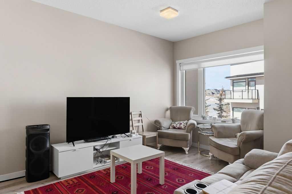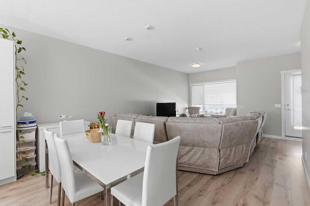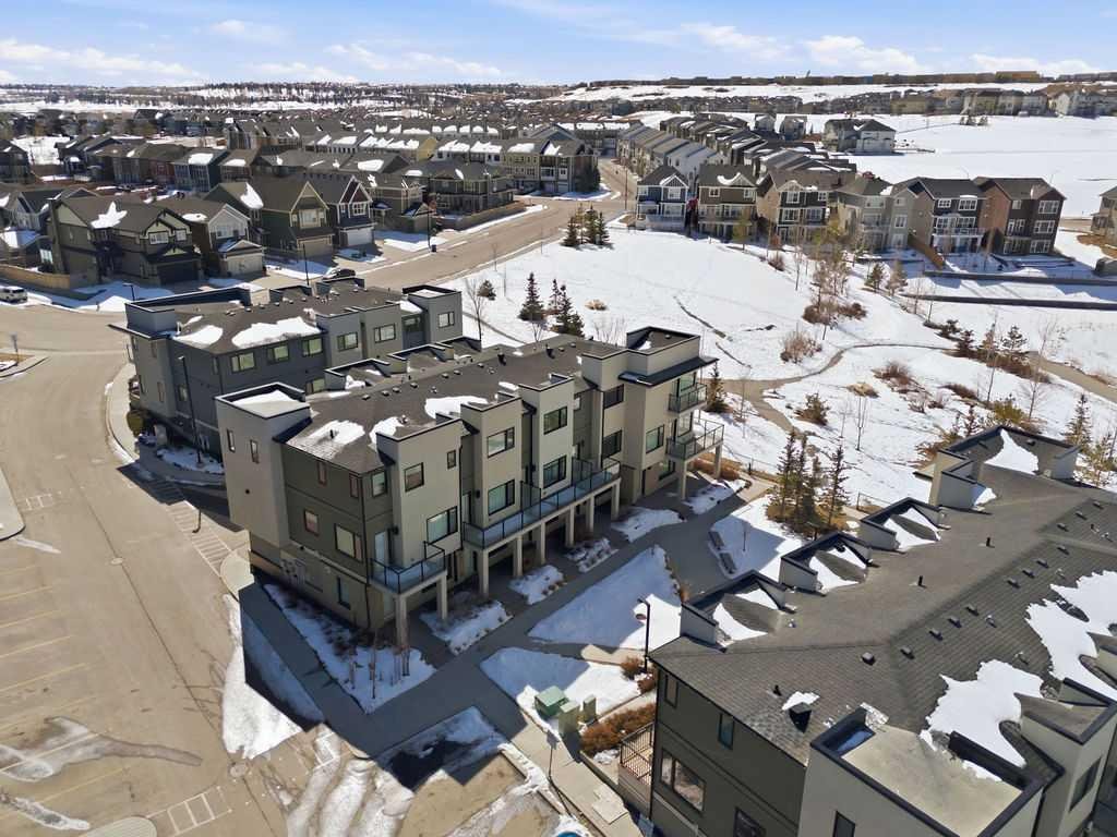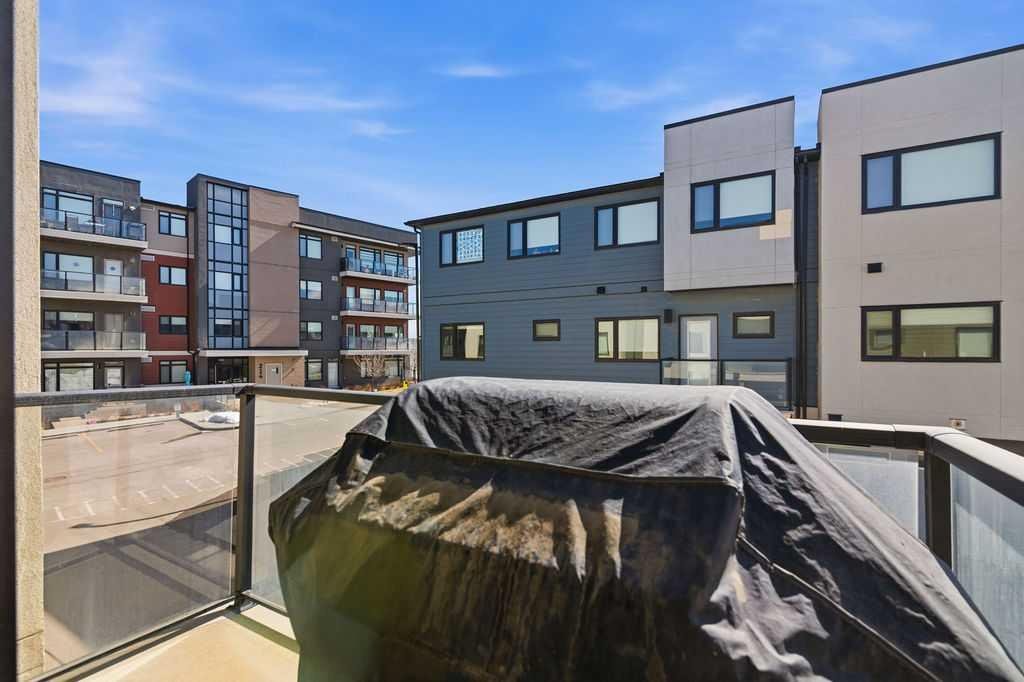 Welcome to this stunning and beautifully appointed townhome in the highly desirable Diseno community of Sherwood. Offering 1,576 sq. ft. of thoughtfully designed living space, this home seamlessly blends modern style, comfort, and functionality—ideal for families, professionals, or those seeking low-maintenance living without compromise. The main level welcomes you with a bright and spacious flex room, perfectly suited for a home office, gym, or guest space. Large windows fill the area with natural light while showcasing peaceful views of the surrounding greenspace, creating an inviting and versatile environment. This level also provides convenient access to the double attached garage, making everyday living effortless. Upstairs, the second level reveals an impressive open-concept layout designed for both relaxing and entertaining. The spacious living room is anchored by natural sunlight, creating a warm and welcoming atmosphere. The adjacent dining area flows seamlessly into the contemporary kitchen, which is sure to impress with its sleek quartz countertops, stainless steel appliances, modern cabinetry, stylish backsplash, and a large island with breakfast bar seating—perfect for casual dining or hosting guests. A standout feature of this home is the presence of two private balconies—one off the living room and another off the kitchen—both offering tranquil pond and greenspace views. These outdoor spaces provide the perfect setting to enjoy your morning coffee or unwind in the evening. The upper level is thoughtfully laid out to maximize comfort and privacy. The spacious primary bedroom serves as a relaxing retreat, complete with a walk-in closet and a private 3-piece ensuite with a stand-up shower. Two additional generously sized bedrooms offer flexibility for family, guests, or workspace, and are complemented by a full 4-piece bathroom. Convenient in-suite laundry on this level adds to the home’s overall practicality. Situated in the sought-after community of Sherwood, this home offers exceptional access to nearby amenities, including Beacon Hill and Sage Hill shopping centres, schools, public transit, parks, and an extensive network of walking paths. With quick access to major roadways, commuting is simple and efficient. Combining a functional layout, modern finishes, beautiful views, and a prime location, this exceptional townhome presents a rare opportunity to enjoy elevated living in one of NW Calgary’s most desirable communities.