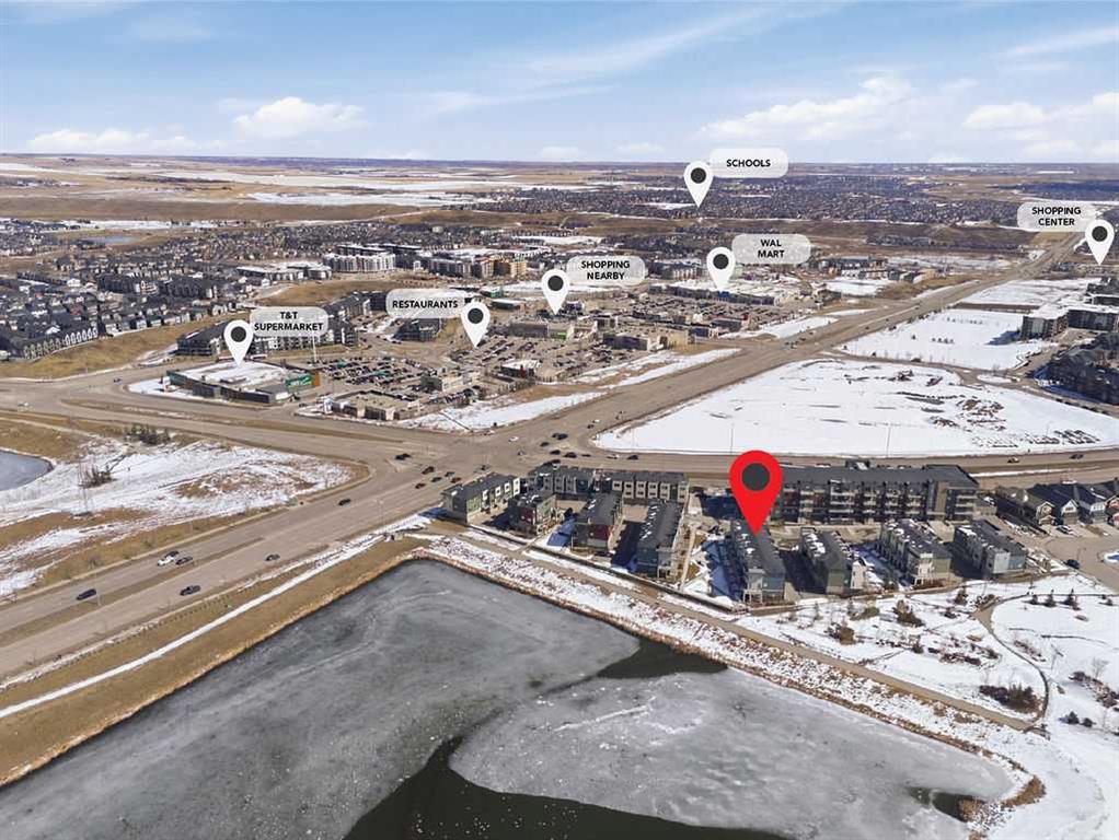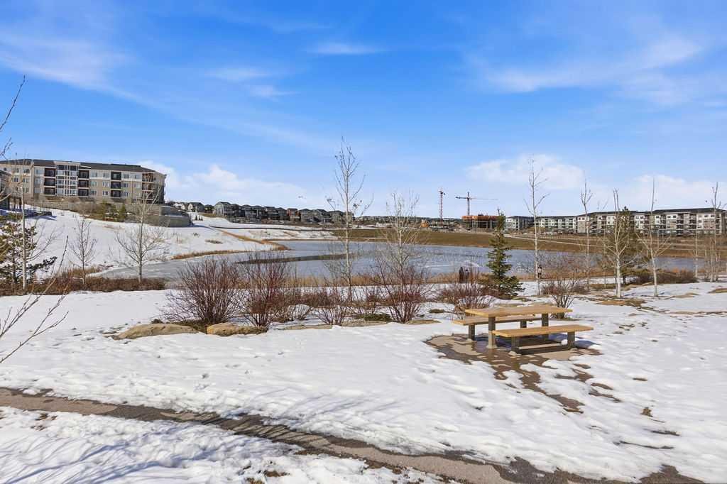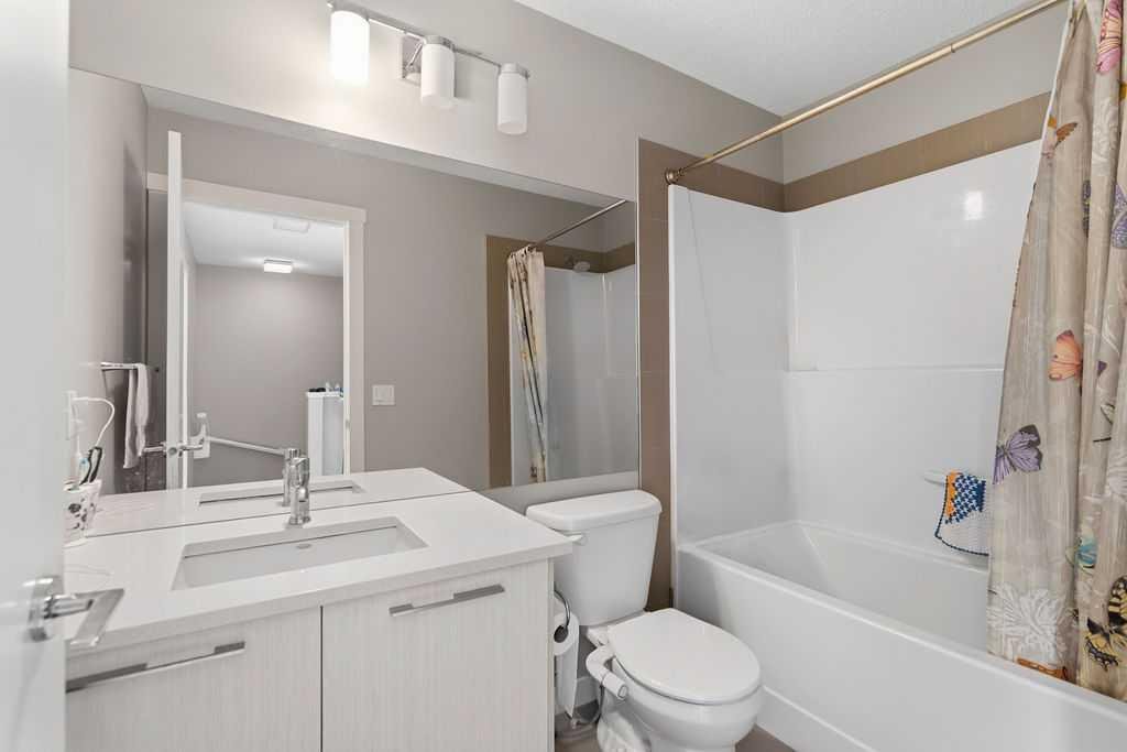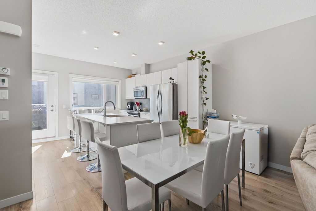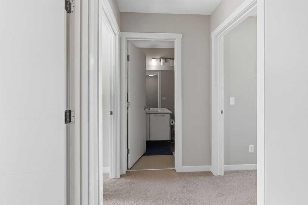 Welcome to this stunning and beautifully appointed townhome in the highly desirable Diseno community of Sherwood. Offering 1,576 sq. ft. of thoughtfully designed living space, this home seamlessly blends modern style, comfort, and functionality—ideal for families, professionals, or those seeking low-maintenance living without compromise. The main level welcomes you with a bright and spacious flex room, perfectly suited for a home office, gym, or guest space. Large windows fill the area with natural light while showcasing peaceful views of the surrounding greenspace, creating an inviting and versatile environment. This level also provides convenient access to the double attached garage, making everyday living effortless. Upstairs, the second level reveals an impressive open-concept layout designed for both relaxing and entertaining. The spacious living room is anchored by natural sunlight, creating a warm and welcoming atmosphere. The adjacent dining area flows seamlessly into the contemporary kitchen, which is sure to impress with its sleek quartz countertops, stainless steel appliances, modern cabinetry, stylish backsplash, and a large island with breakfast bar seating—perfect for casual dining or hosting guests. A standout feature of this home is the presence of two private balconies—one off the living room and another off the kitchen—both offering tranquil pond and greenspace views. These outdoor spaces provide the perfect setting to enjoy your morning coffee or unwind in the evening. The upper level is thoughtfully laid out to maximize comfort and privacy. The spacious primary bedroom serves as a relaxing retreat, complete with a walk-in closet and a private 3-piece ensuite with a stand-up shower. Two additional generously sized bedrooms offer flexibility for family, guests, or workspace, and are complemented by a full 4-piece bathroom. Convenient in-suite laundry on this level adds to the home’s overall practicality. Situated in the sought-after community of Sherwood, this home offers exceptional access to nearby amenities, including Beacon Hill and Sage Hill shopping centres, schools, public transit, parks, and an extensive network of walking paths. With quick access to major roadways, commuting is simple and efficient. Combining a functional layout, modern finishes, beautiful views, and a prime location, this exceptional townhome presents a rare opportunity to enjoy elevated living in one of NW Calgary’s most desirable communities.