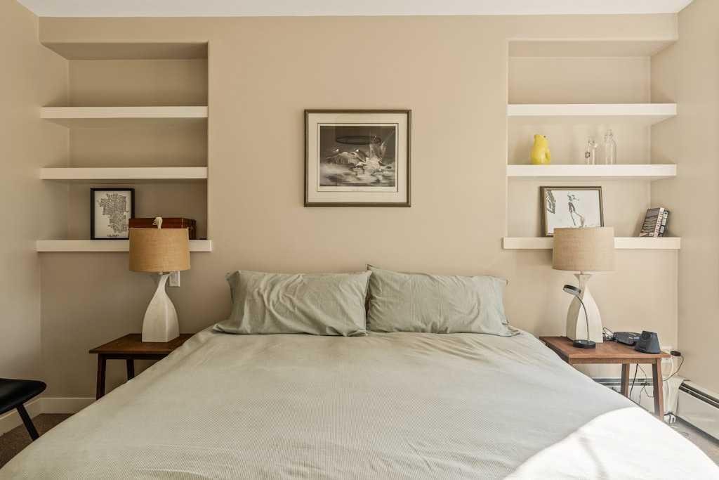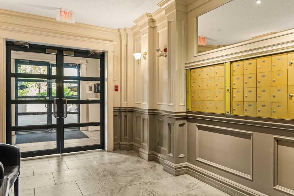 Thoughtfully designed with privacy in mind, the layout separates the bedrooms: the primary suite boasts a walk-in closet, built-in shelving, and a relaxing ensuite with a soaking tub, while the secondary bedroom also features a walk-in closet and cheater access to its own full bath. Step outside to a large sunny balcony that overlooks the treelined courtyard – an ideal retreat for morning coffee or with a glass of wine in the evenings.
