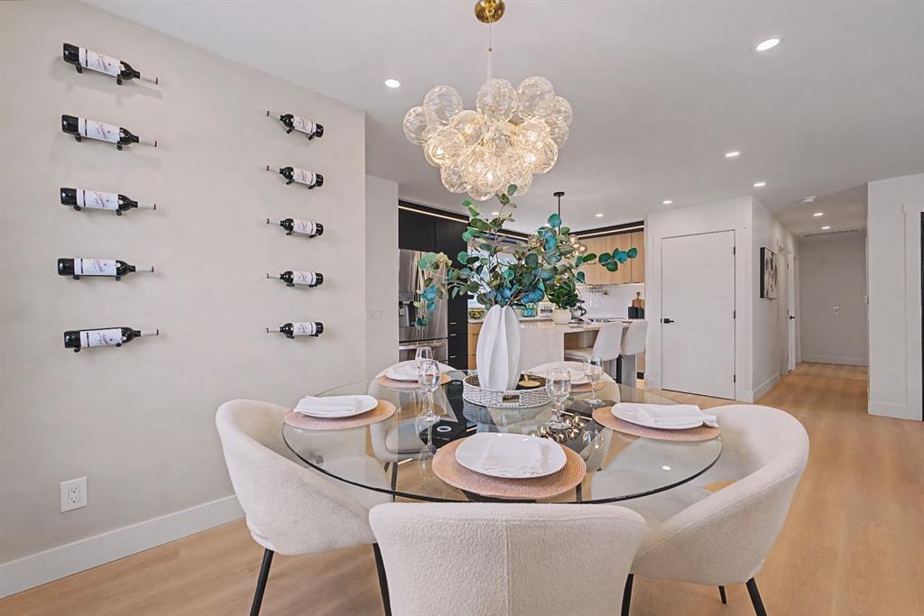 The main floor features a bright, open-concept living and dining space enhanced by designer lighting, layered ceiling details, and warm modern finishes, instantly elevating the feel of the home. The chef-inspired kitchen is anchored by a large island, sleek cabinetry, and quality appliances — thoughtfully designed for everyday living and effortless entertaining.
