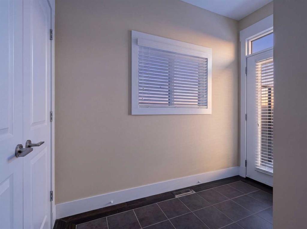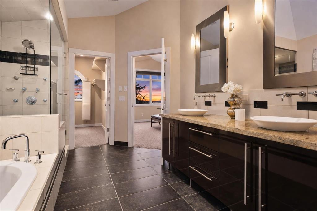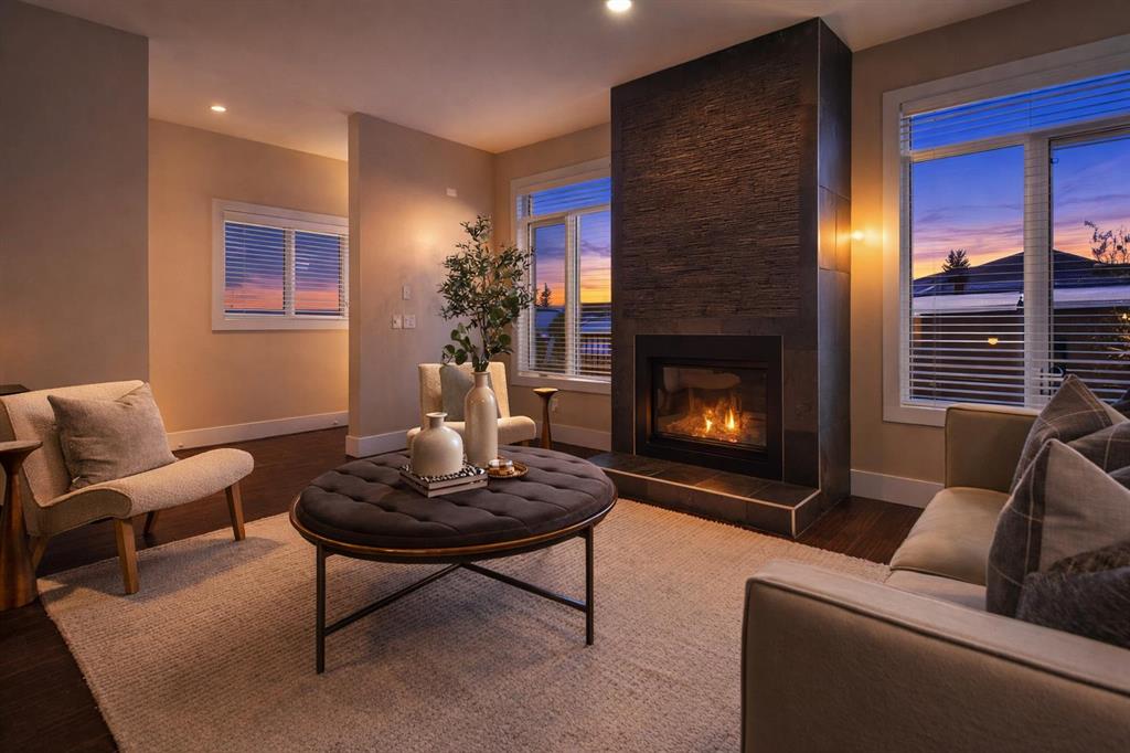 The dramatic floor-to-ceiling textured fireplace commands attention, flames dancing against charcoal stone while Calgary’s prairie skies perform through flanking windows. Above, 3 peaceful bedrooms await, including a primary retreat with vaulted ceilings and spa-inspired ensuite featuring double vessel sinks, soaking tub, and rainfall shower with body sprays. The 923 sq ft finished lower level offers endless possibilities with additional bedroom or guest room, full bathroom, home office, gym, entertainment hub.