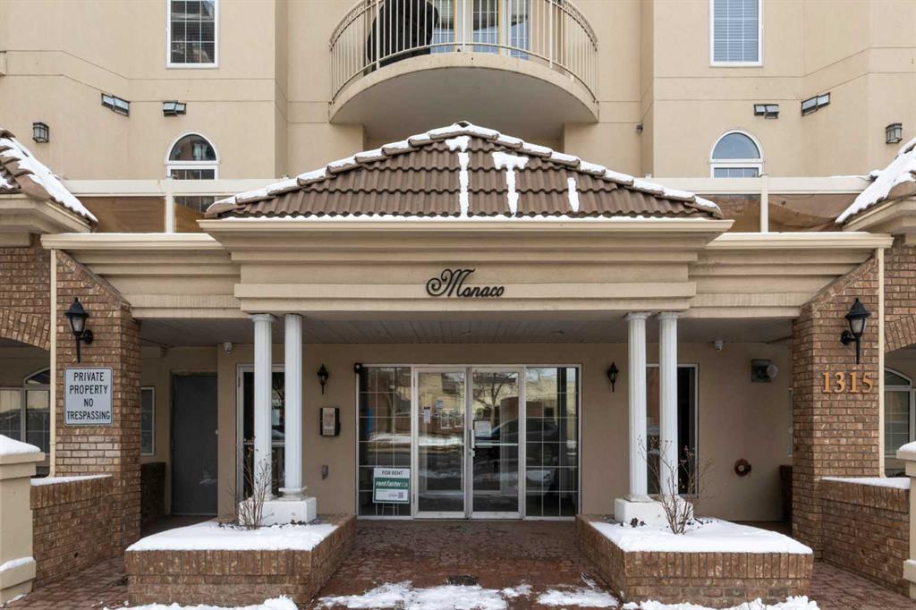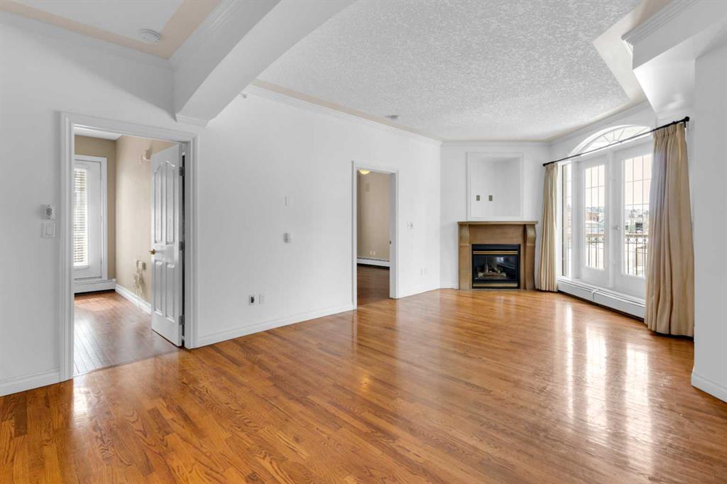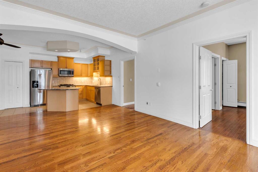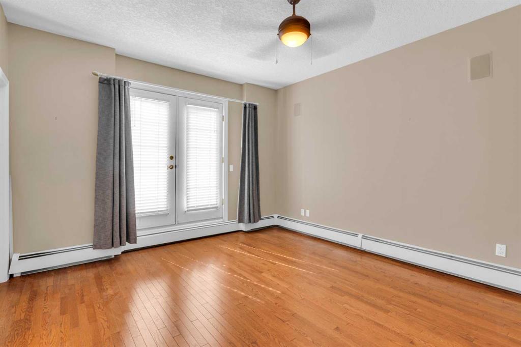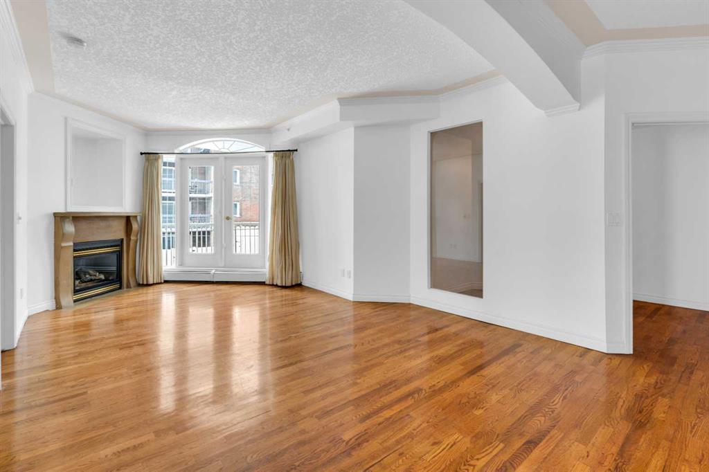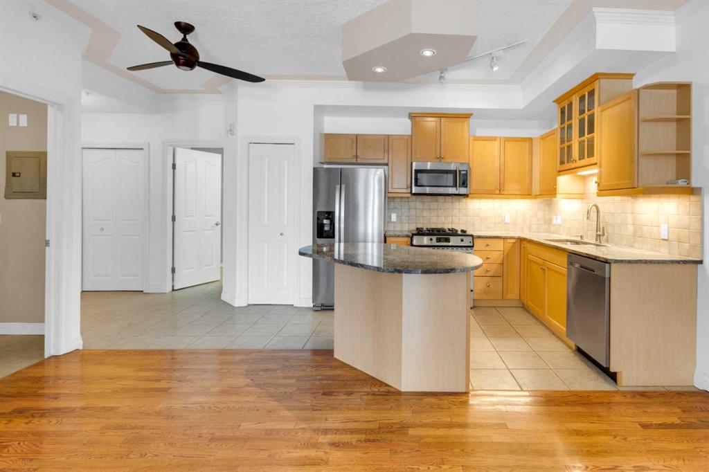 Welcome to unit #205 in The Monoco. This very well maintained 2 bedroom 2 bathroom + den unit is just under 1000 square feet and one the largest units in the building. Featuring a wide open living area anchored by a architectural surround mantled corner fireplace and french doors to the spacious balcony. The main areas are bright and have immaculate hardwood flooring and the entire unit is lightly lived in and well cared for. The open kitchen features a gas range, stainless steel appliances, ceramic tile flooring, ample cupboard space, separate pantry and granite counters with an eating island all over looking the main living and dining areas, perfect for entertaining. Adjacent to the dining area is the den/flex room – a great bonus space and can easily be used for a home office or work out area. Large primary bedroom has a 4 piece ensuite with a deep spa like jetted soaker tub and walk in closet with built-ins. Second bedroom is a nice size with a Juliet balcony and perfect for guests or roommate. Just off the kitchen is the additional 3 piece bathroom and separate laundry room with a stacked washer & dryer and additional storage space with shelving. The large 74 square foot balcony has a gas bbq and is an extension of the living area in seasonal weather, an excellent retreat. The Monaco is in a perfect central location close to all shopping, the Co-op Central Market, many restaurants, pubs and walking distance to The Core. One titled parking stall completes the package – this unit is amazing value in the Beltline and ready for a new owner.