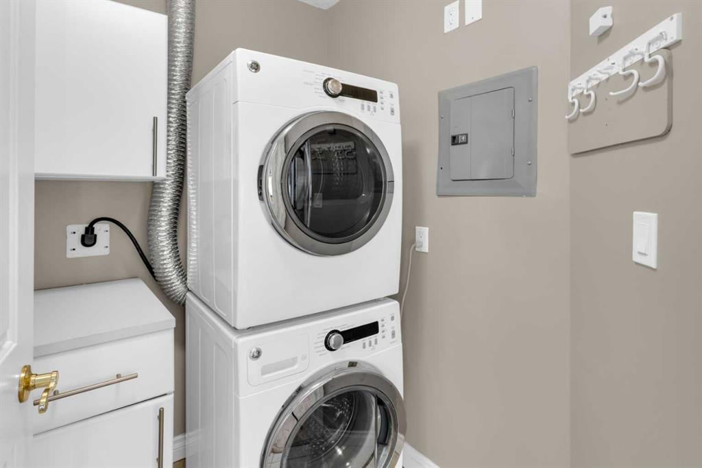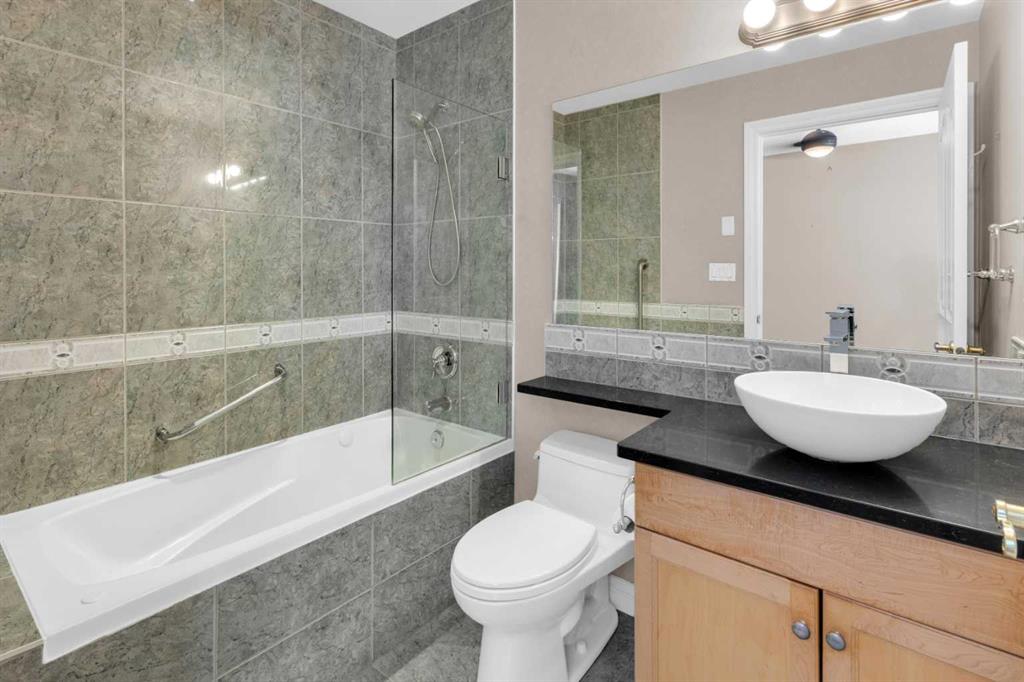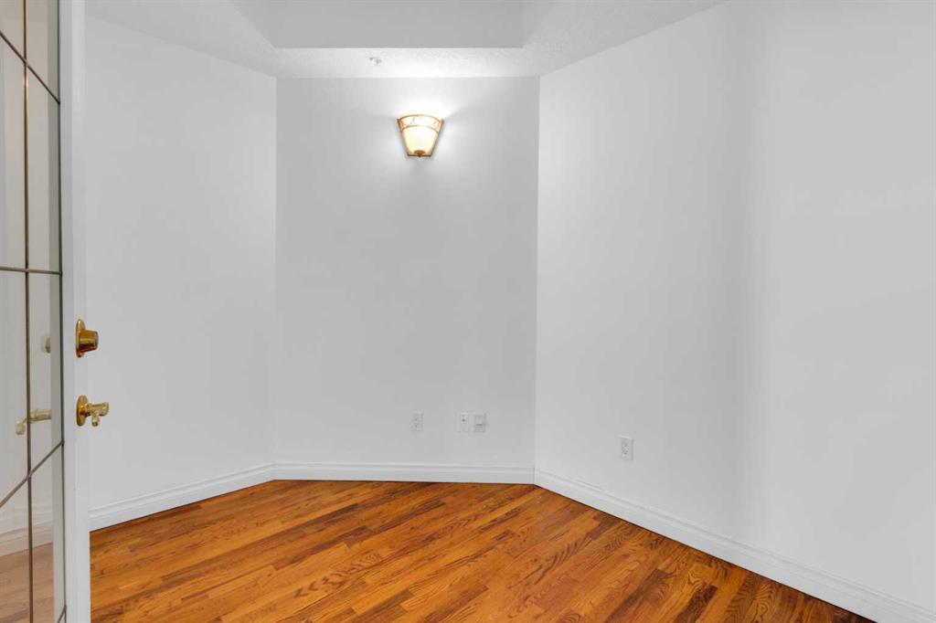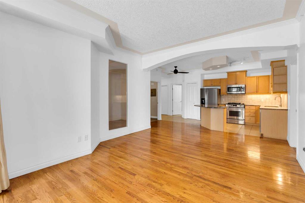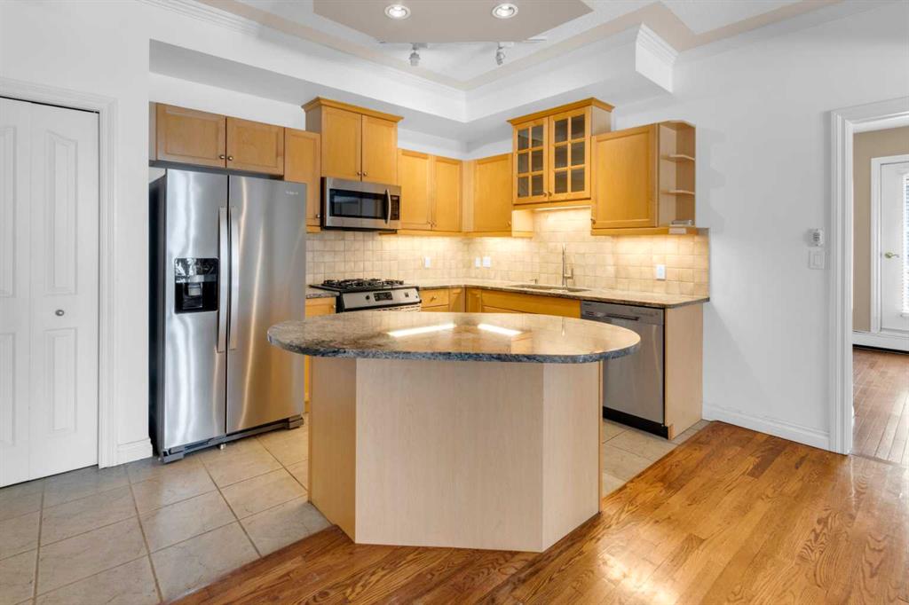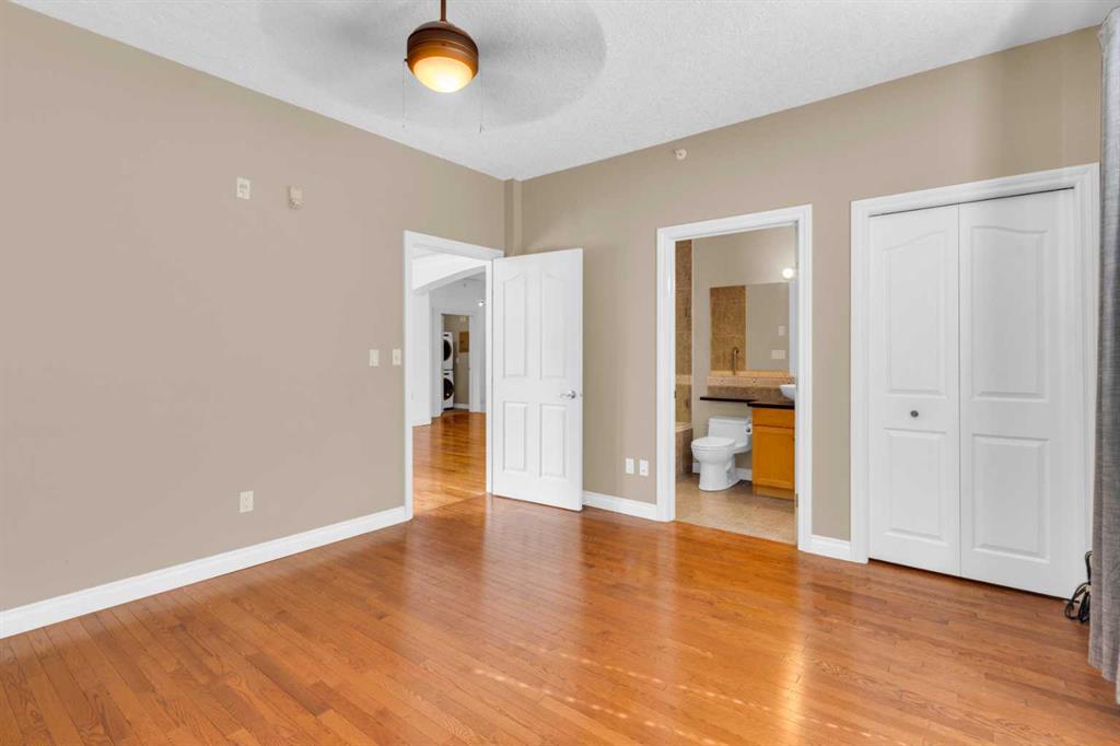 Welcome to unit #205 in The Monoco. This very well maintained 2 bedroom 2 bathroom + den unit is just under 1000 square feet and one the largest units in the building. Featuring a wide open living area anchored by a architectural surround mantled corner fireplace and french doors to the spacious balcony. The main areas are bright and have immaculate hardwood flooring and the entire unit is lightly lived in and well cared for. The open kitchen features a gas range, stainless steel appliances, ceramic tile flooring, ample cupboard space, separate pantry and granite counters with an eating island all over looking the main living and dining areas, perfect for entertaining. Adjacent to the dining area is the den/flex room – a great bonus space and can easily be used for a home office or work out area. Large primary bedroom has a 4 piece ensuite with a deep spa like jetted soaker tub and walk in closet with built-ins. Second bedroom is a nice size with a Juliet balcony and perfect for guests or roommate. Just off the kitchen is the additional 3 piece bathroom and separate laundry room with a stacked washer & dryer and additional storage space with shelving. The large 74 square foot balcony has a gas bbq and is an extension of the living area in seasonal weather, an excellent retreat. The Monaco is in a perfect central location close to all shopping, the Co-op Central Market, many restaurants, pubs and walking distance to The Core. One titled parking stall completes the package – this unit is amazing value in the Beltline and ready for a new owner.