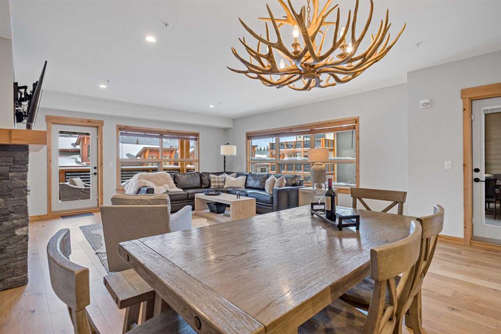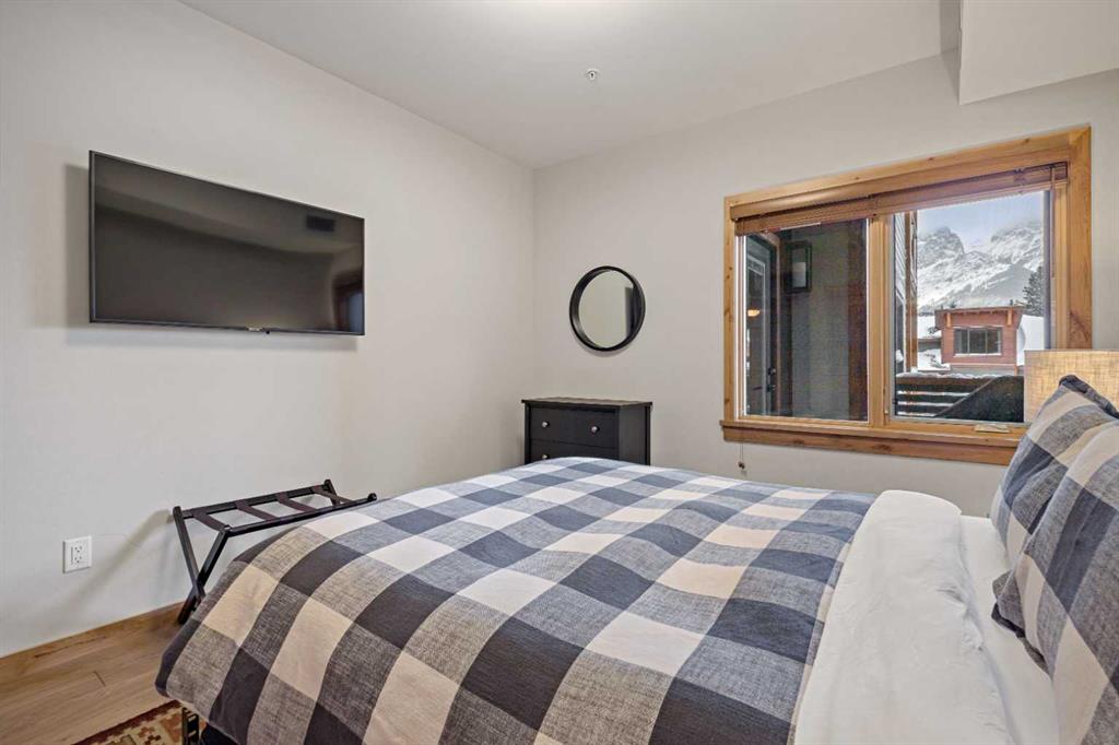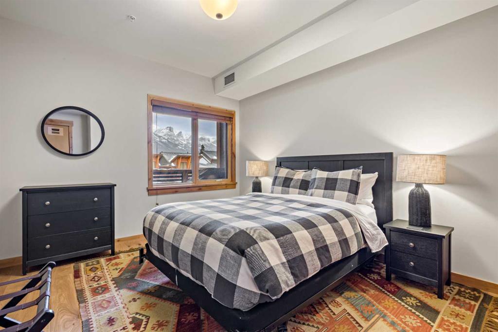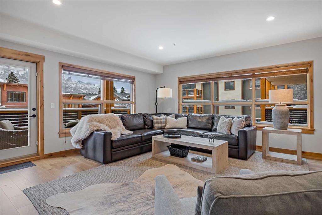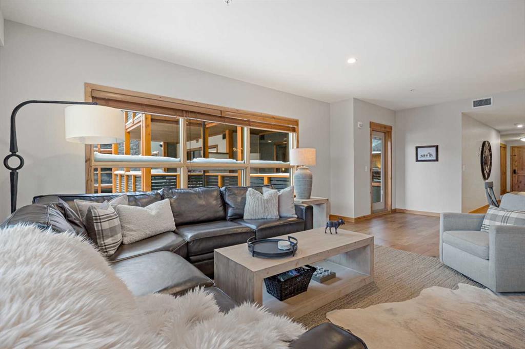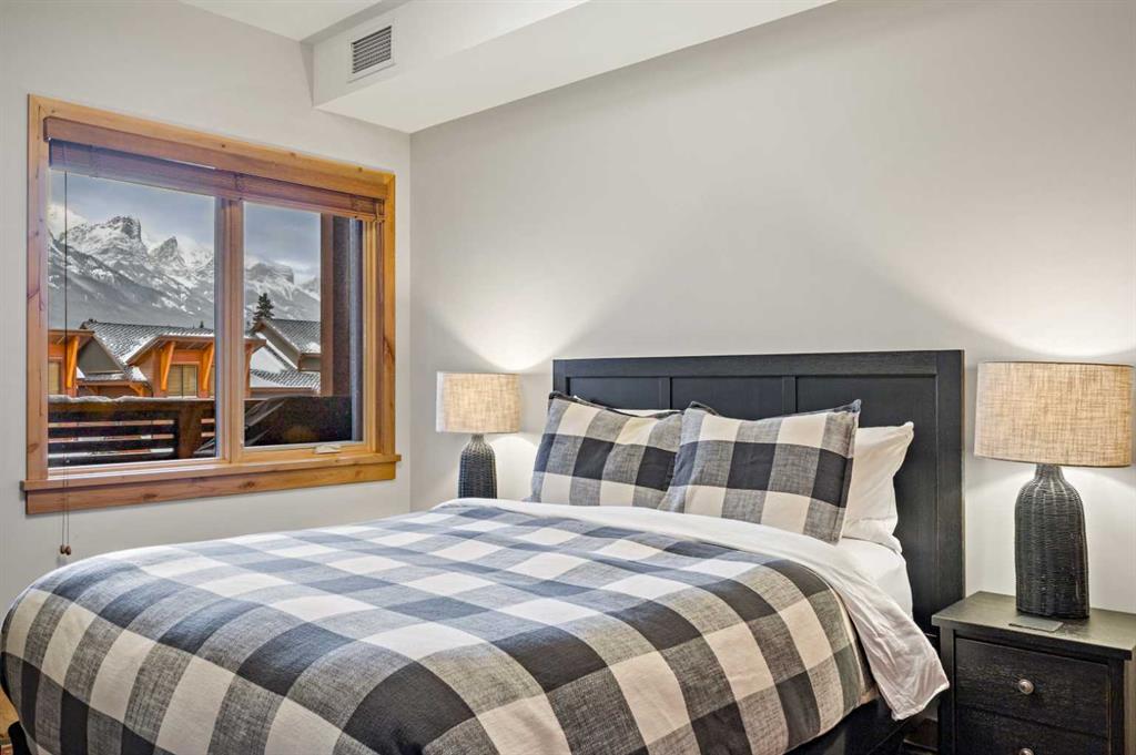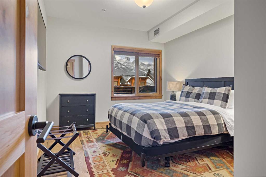 Immaculate and rare 2-bedroom plus den (functions as 3rd bedroom) luxury condominium in White Spruce Lodge in the heart of Spring Creek. This property carries the “tourist home” designation permitting short-term vacation rentals. Sold fully furnished and turn-key for immediate rentals, with many reservations already on the books for 2026! Owners and rental gusts will enjoy the open concept living with spacious living areas ideal for families or gatherings with a large gourmet kitchen complete with stainless appliances, quartz counters and plenty of cabinet space, a large dining area and living room, perfect for entertaining. Enjoy outdoor living with 2 large covered decks, facing SW/W with great views of Ha Ling Peak and the entire Rundle Range. The den has two full size built in bunk beds, perfect for the kids! The large primary bedroom features king, a walk-in closet and 5 piece ensuite. White Spruce Lodge has an inviting courtyard hot tub with fantastic views and an exercise room on the main level. White Spruce Lodge is located adjacent to the Plaza in Spring Creek with shops, Bridgette Bar restaurant and is just a short stroll to Main Street Canmore along the lovely creek paths to downtown.