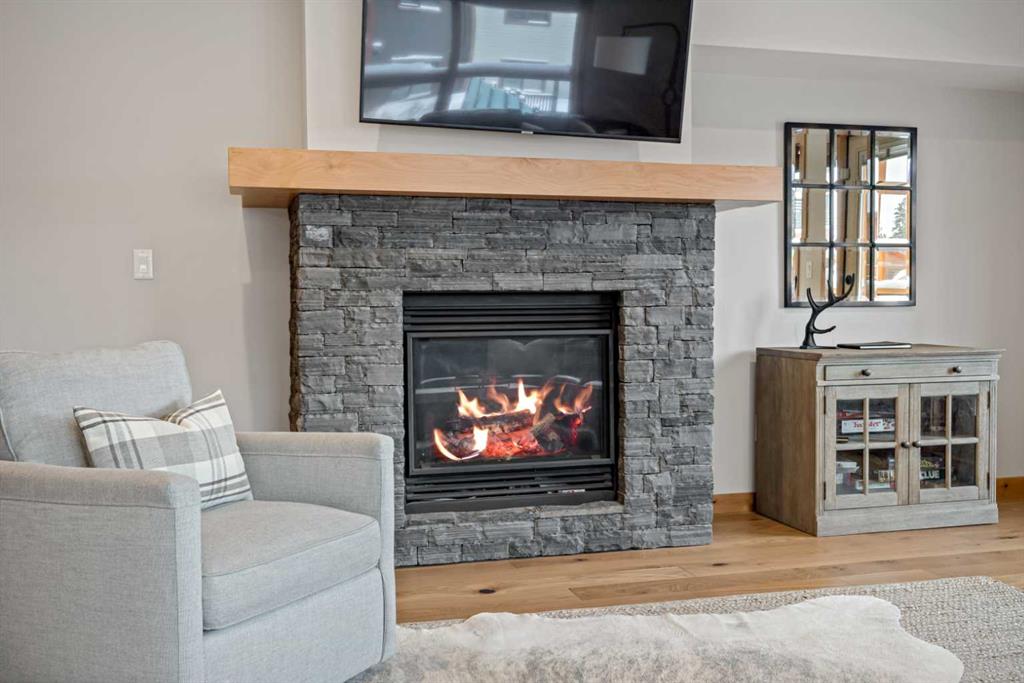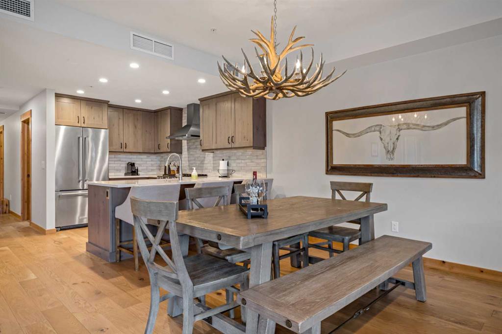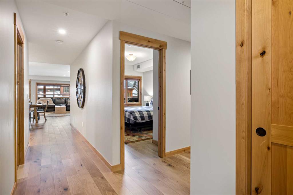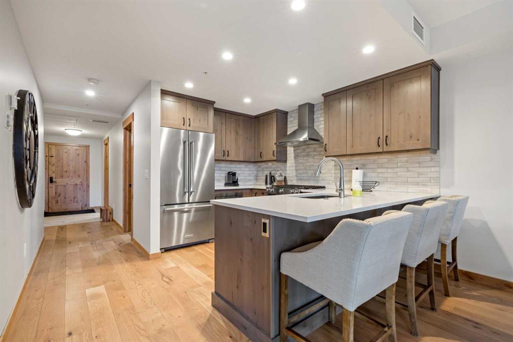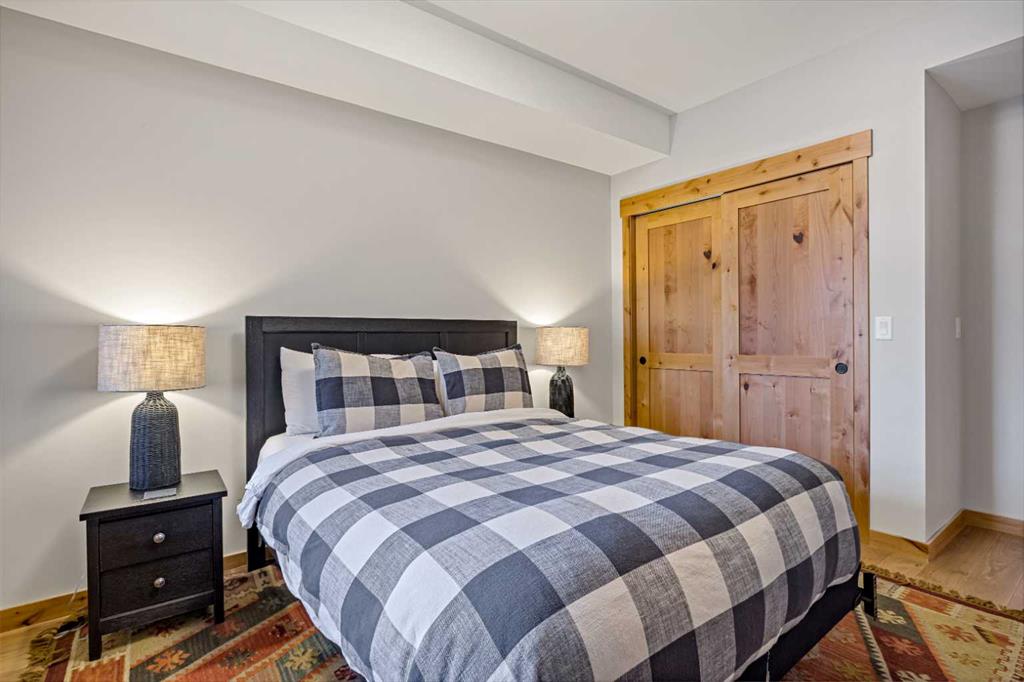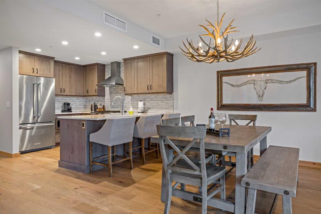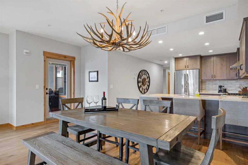 Immaculate and rare 2-bedroom plus den (functions as 3rd bedroom) luxury condominium in White Spruce Lodge in the heart of Spring Creek. This property carries the “tourist home” designation permitting short-term vacation rentals. Sold fully furnished and turn-key for immediate rentals, with many reservations already on the books for 2026! Owners and rental gusts will enjoy the open concept living with spacious living areas ideal for families or gatherings with a large gourmet kitchen complete with stainless appliances, quartz counters and plenty of cabinet space, a large dining area and living room, perfect for entertaining. Enjoy outdoor living with 2 large covered decks, facing SW/W with great views of Ha Ling Peak and the entire Rundle Range. The den has two full size built in bunk beds, perfect for the kids! The large primary bedroom features king, a walk-in closet and 5 piece ensuite. White Spruce Lodge has an inviting courtyard hot tub with fantastic views and an exercise room on the main level. White Spruce Lodge is located adjacent to the Plaza in Spring Creek with shops, Bridgette Bar restaurant and is just a short stroll to Main Street Canmore along the lovely creek paths to downtown.
