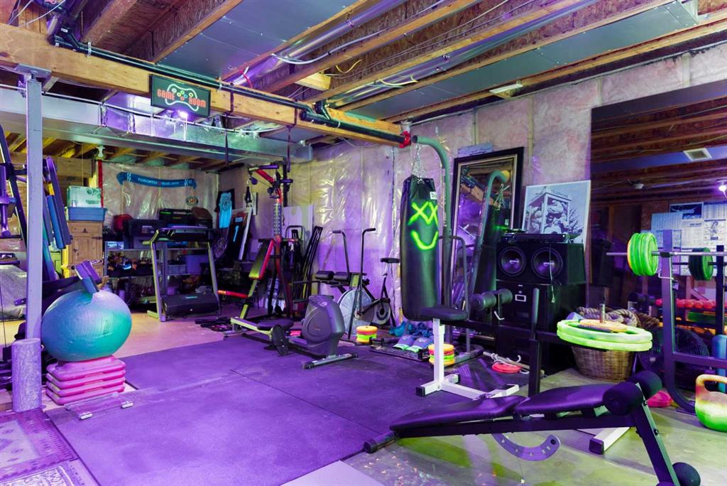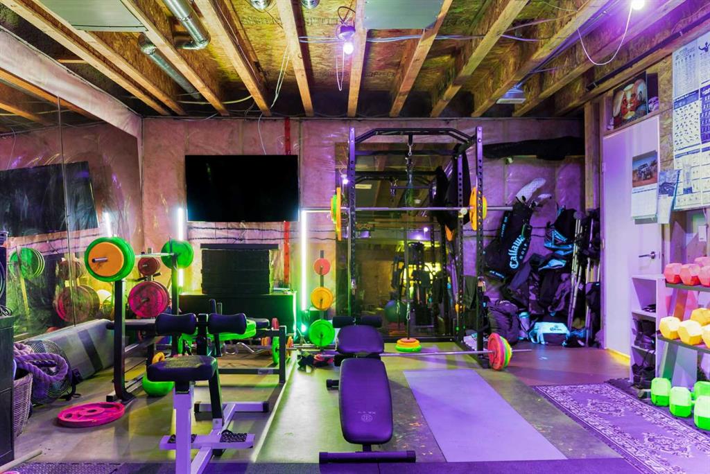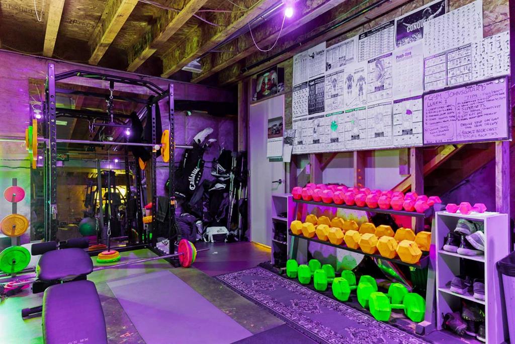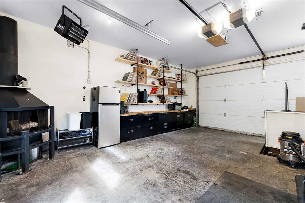 The fully finished garage transforms into an entertainer’s retreat with golf simulator capability, projector setup, custom storage, and a rare wood-burning garage fireplace, creating a truly one-of-a-kind space.