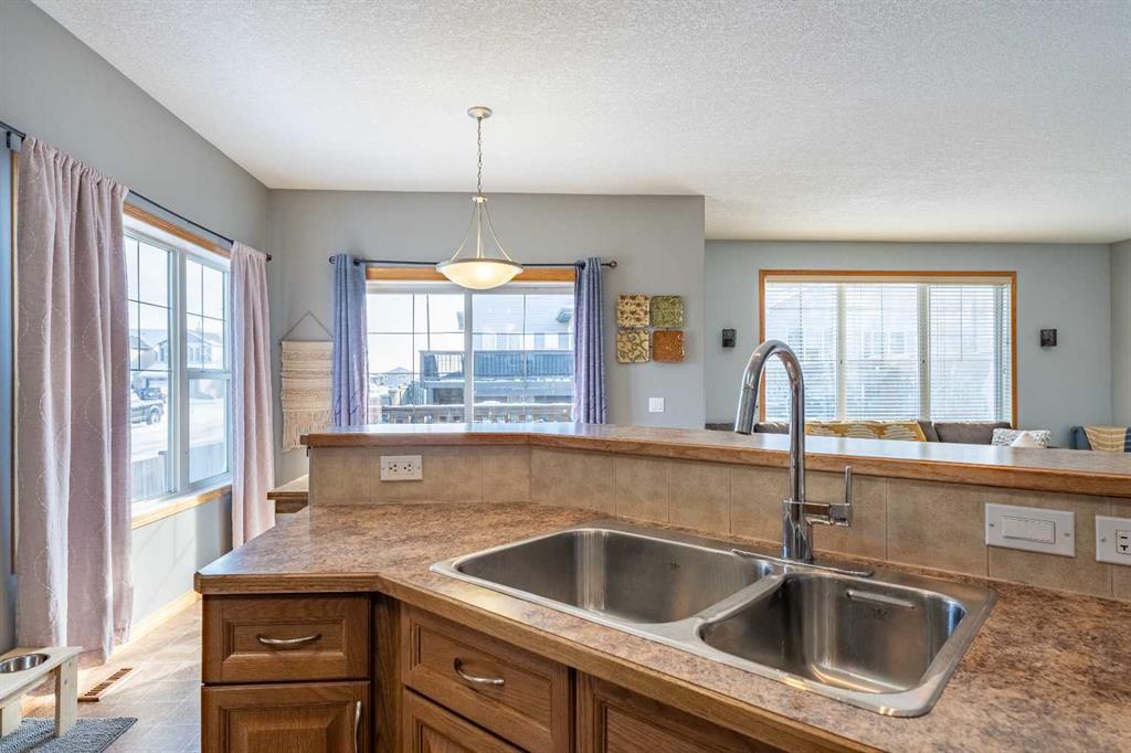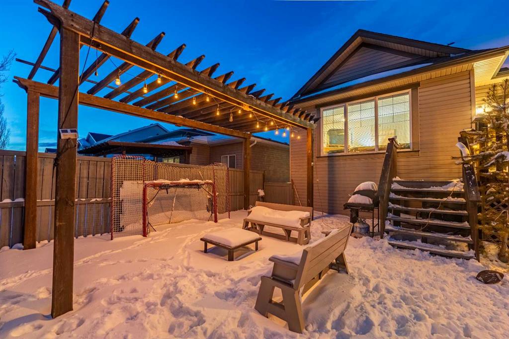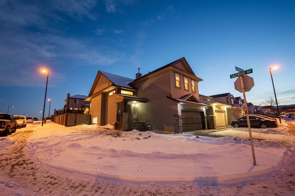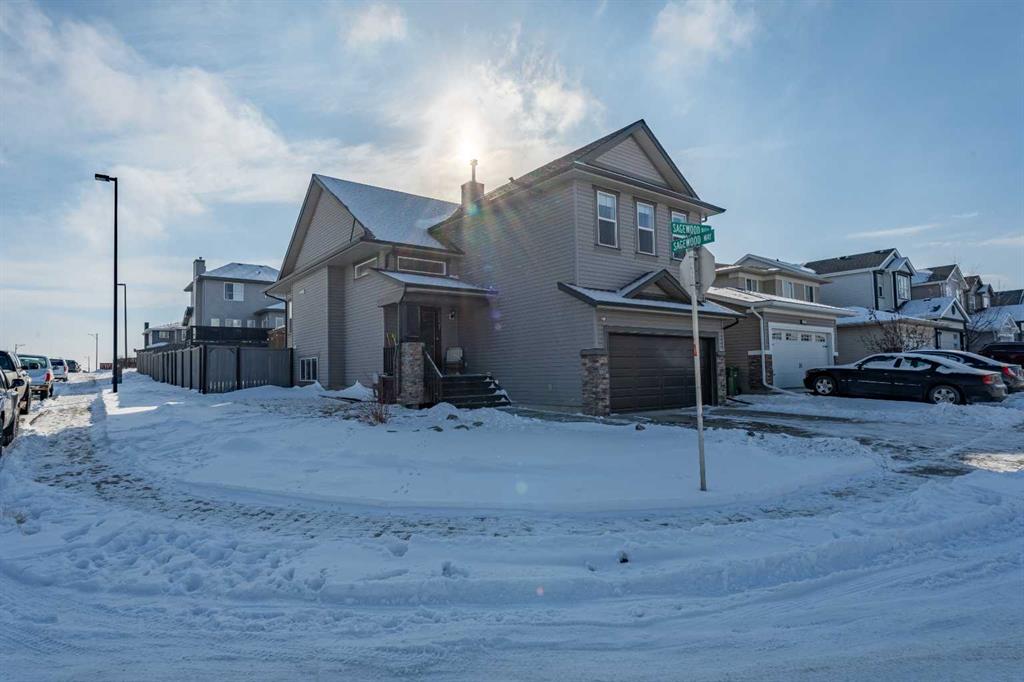 Welcome to this beautiful custom bi-level home located on a desirable corner lot in the family-friendly community of Sagewood in Airdrie. With a sunny south-facing backyard complete with a charming pergola, this home offers the perfect setting for relaxing or entertaining outdoors. The spacious front entrance greets you with soaring ceilings, creating a bright and inviting first impression. The thoughtfully designed main floor features three bedrooms and two full bathrooms, including a generous primary suite that easily accommodates a king-sized bed, along with a walk-in closet and a luxurious 4-piece ensuite showcasing a separate corner soaker tub and standalone shower. Just a few steps down are two well-sized secondary bedrooms and an additional 4-piece bath. The open-concept kitchen, dining, and living areas are ideal for modern family living, highlighted by a large kitchen island with breakfast bar, a corner gas fireplace in the living room, and a dining space spacious enough for everyday meals or hosting guests. Abundant windows throughout the main floor flood the home with natural light. The fully developed basement adds even more functional space with a fourth bedroom, full bathroom, expansive rec room, dedicated games area, laundry room, and ample storage including additional space under the stairs. Completing this exceptional property is a double attached garage. This well-designed home truly offers the right space in all the right places for comfortable family living.