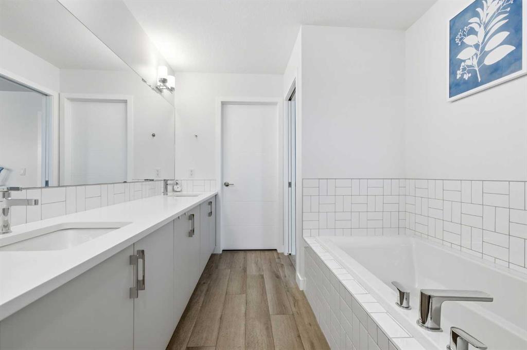 Upstairs, the primary suite is a retreat of its own, complete with a stunning ensuite showcasing a full-length dual vanity, walk-in closet, a full-tile glass shower, and a beautiful soaker tub designed for unwinding at the end of the day. A second bedroom and additional full bathroom complete the upper level with comfort and privacy.