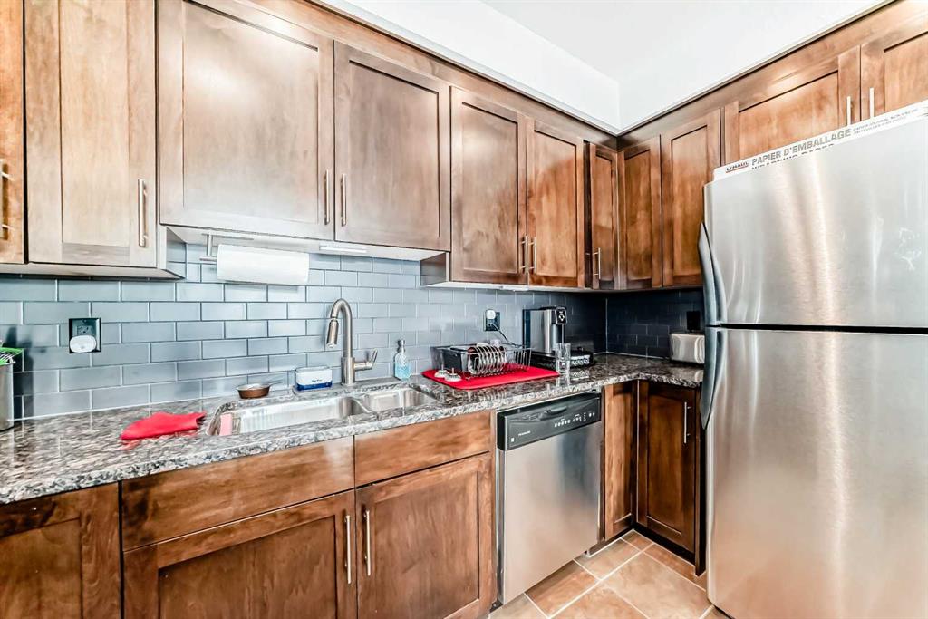 This well-designed 764 sq ft, 1-bedroom, 1-bathroom unit features a bright open-concept layout with generous natural light throughout. The kitchen is finished with granite countertops, rich shaker-style cabinetry, stainless steel appliances, and a breakfast bar, making it both functional and stylish. The cozy living area is anchored by a corner gas fireplace with tile surround, creating a warm and inviting space to relax.
