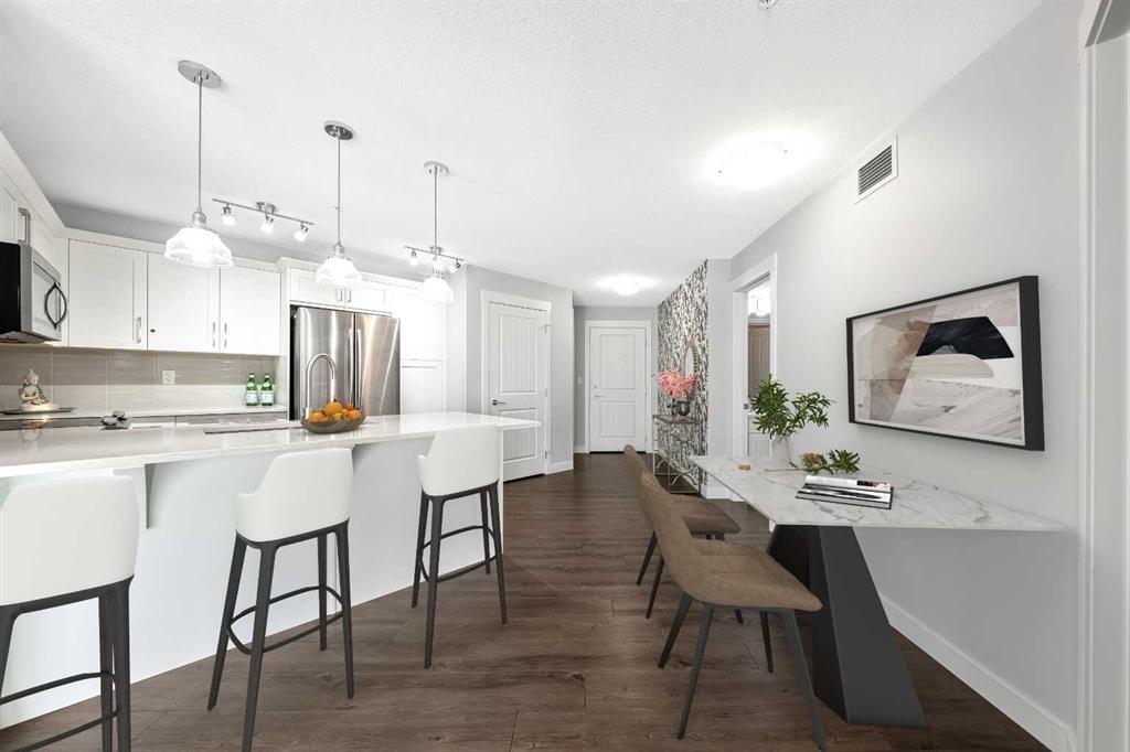 Welcome to Auburn Bay one of Calgary’s most loved lake communities where this beautifully maintained 2-bedroom, 1 bathroom condo truly stands out. This unit is conveniently located just steps from the elevator and offers 764 sq. ft. of well-designed living space, plus a massive corner balcony—an ideal blend of comfort, convenience, and standout outdoor space. Freshly painted and professionally cleaned, it’s truly move-in ready. From the moment you step in, you’ll notice the care and upgrades throughout, starting with a chef-inspired kitchen featuring upgraded stainless-steel appliances, quartz countertops, an under-mount sink, and stylish cabinetry—perfect for everyday living and easy entertaining. The bright, open-concept living space flows seamlessly to what can only be described as a Sunny, Massive 290 sq. ft. covered corner balcony an incredible amount of outdoor space for morning coffee, summer BBQs, and relaxing evenings, with space that truly feels like an extension of your living area, and ideal for year-round outdoor enjoyment. Patio furniture is included, and there’s also a gas BBQ outlet for year-round grilling. Both bedrooms are generously sized. Retreat to a generous primary bedroom. Enjoy a walk-through closet with direct access to the main bath. The second bedroom is spacious with a double closet perfect for guests, a home office, or a roommate. You’ll also appreciate convenient in-suite laundry, and 1 heated titled underground parking stall, oversized to accommodate a larger vehicle, with a dedicated storage locker—because convenience matters. Best of all, this building is pet-friendly (with board approval) and you’re just steps to Auburn Station groceries shopping, transit, restaurants, and everyday conveniences. Plus, as part of the Auburn Bay community, you’ll enjoy exclusive year-round lake access—whether it’s swimming in the summer, skating in the winter, paddleboarding, or simply relaxing at the beach. Quick access to Stoney and Deerfoot Trail completes the package—this is low-maintenance, lifestyle-focused living in one of Calgary’s most desirable lake communities, and an outstanding value for first-time buyers, professionals, downsizers, and investors.