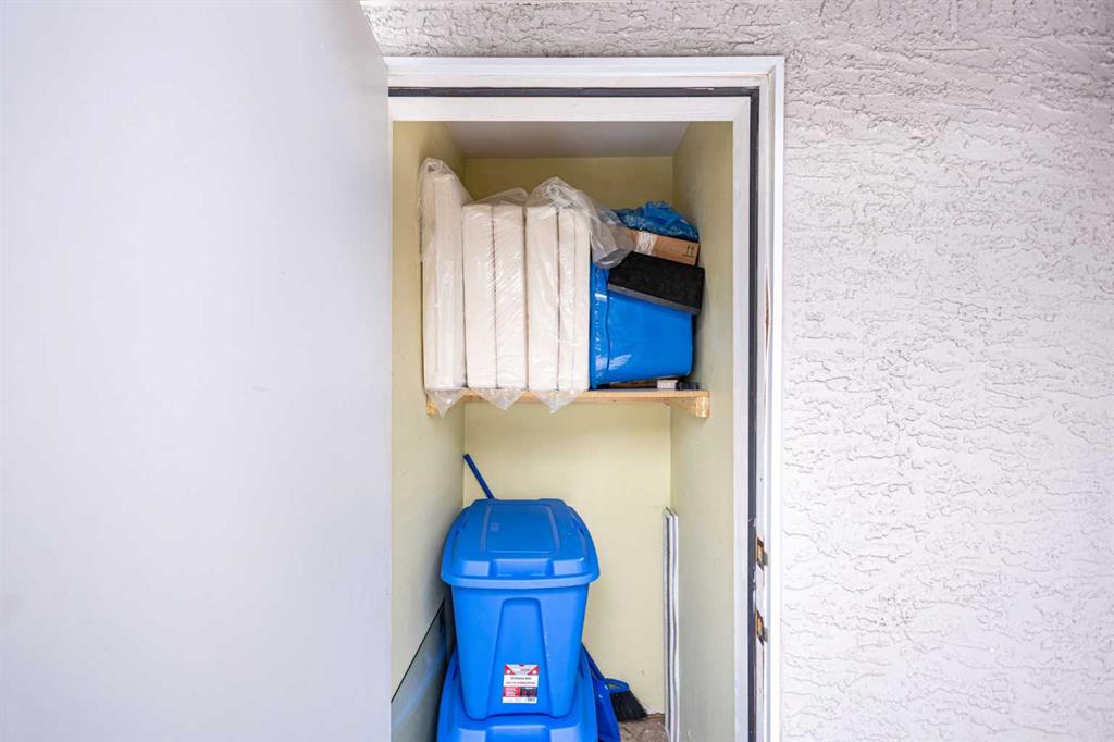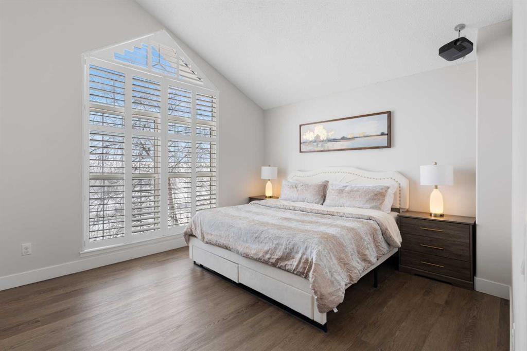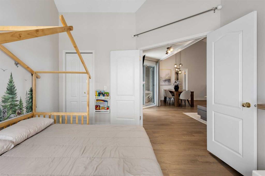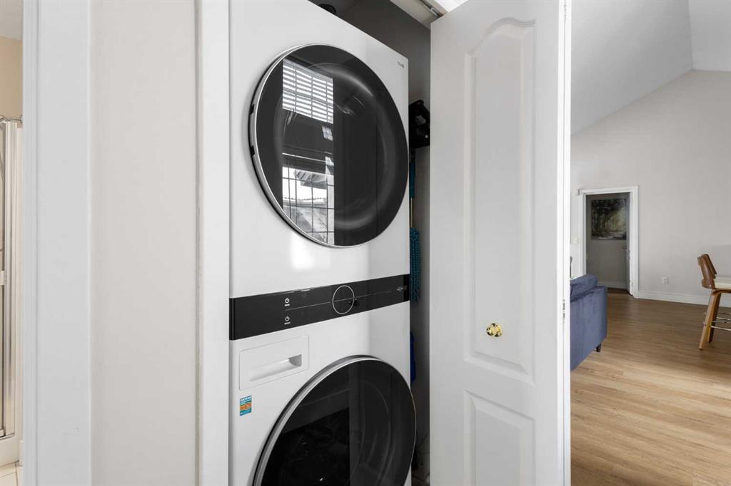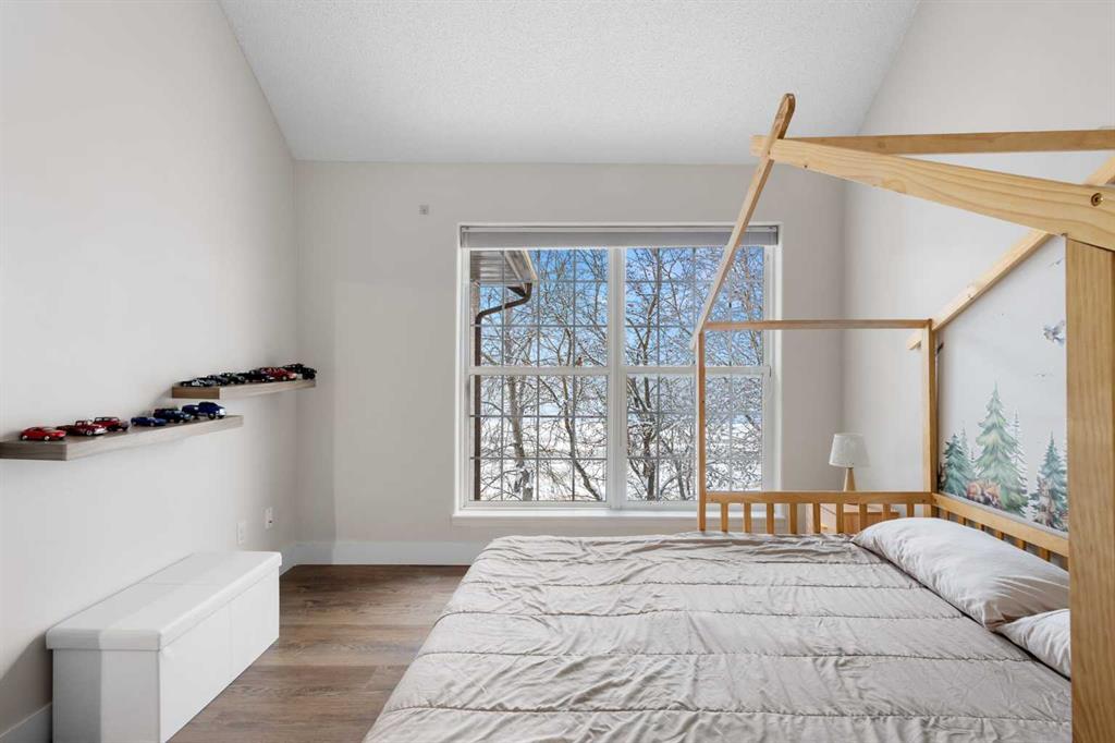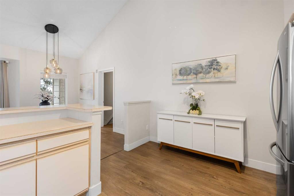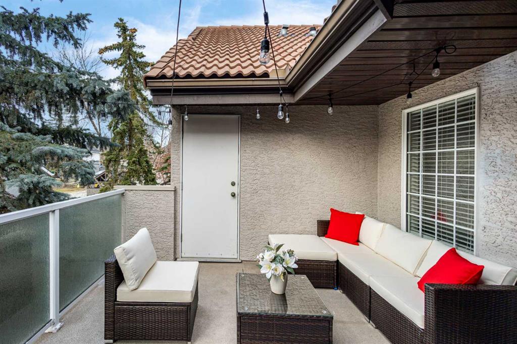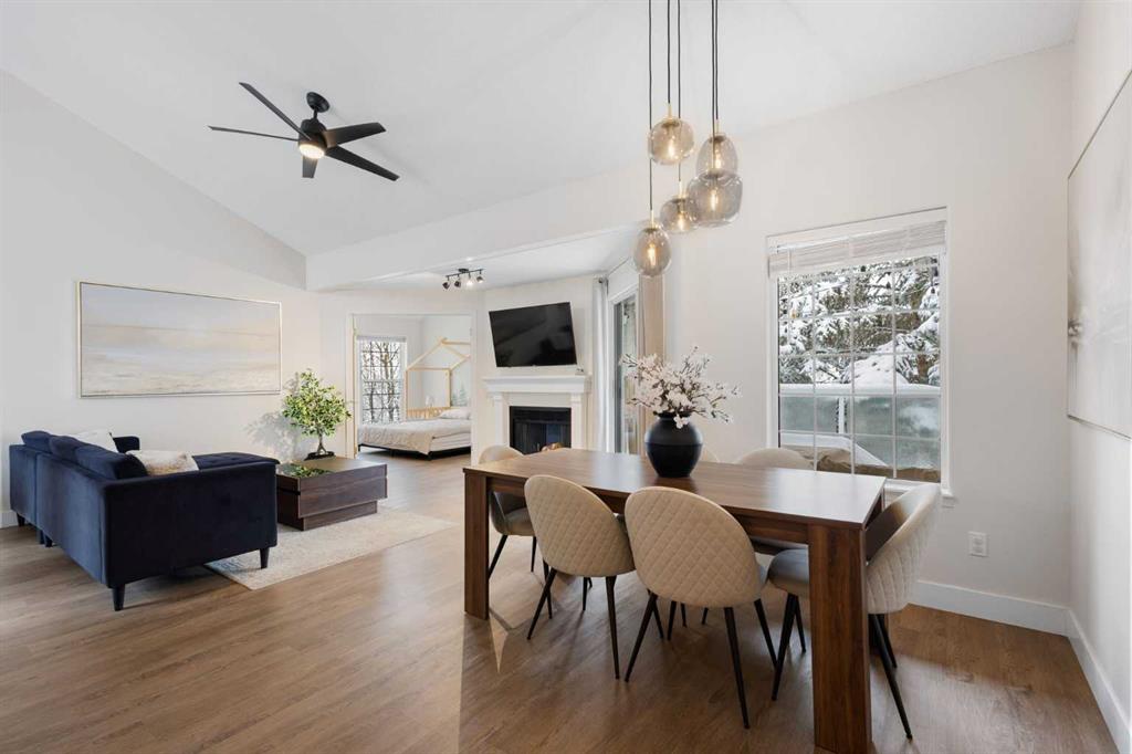 This upper-level stacked townhouse in Signal Hill overlooks Optimistic Park instead of a neighbour’s window. That view is one of the reasons the current owners bought it. A wood-burning fireplace anchors the living room, and the whole space opens to a private balcony with a 25 sq ft storage room tucked off to the side.