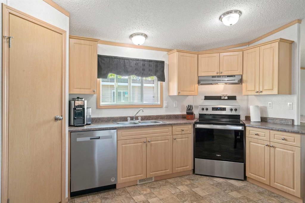 Inside, new subflooring, vinyl sheet flooring, and carpet were installed. The kitchen and bathrooms were refreshed with new cabinetry and vanities, paired with Whirlpool stainless steel appliances and a Whirlpool washer and dryer—all new in 2023.