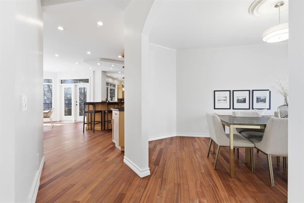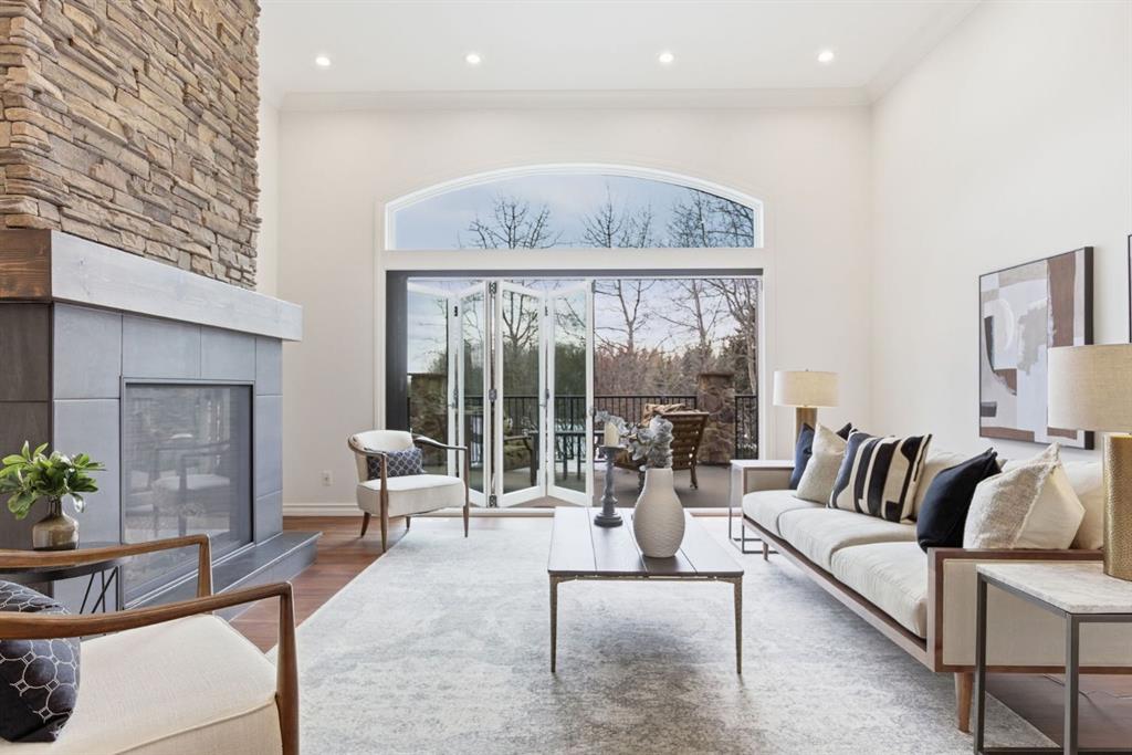 Inside, the home is bright in a way that changes the whole experience of acreage living. Windows in nearly every direction keep the outdoors present, refinished African walnut hardwood brings warmth underfoot, and the more traditional layout gives the home a sense of comfort and structure that is becoming harder to find. The rebuilt southwest-facing deck is a major part of this acreage’s way of living. Engineered with substantial beams and finished with heavy-weight UV-stabilized vinyl decking, it is a high-end outdoor space built to be used and enjoyed. Accordion doors off the living room open fully to the deck, allowing the whole main floor to breathe.