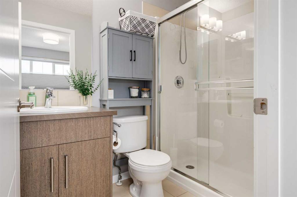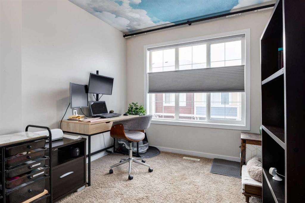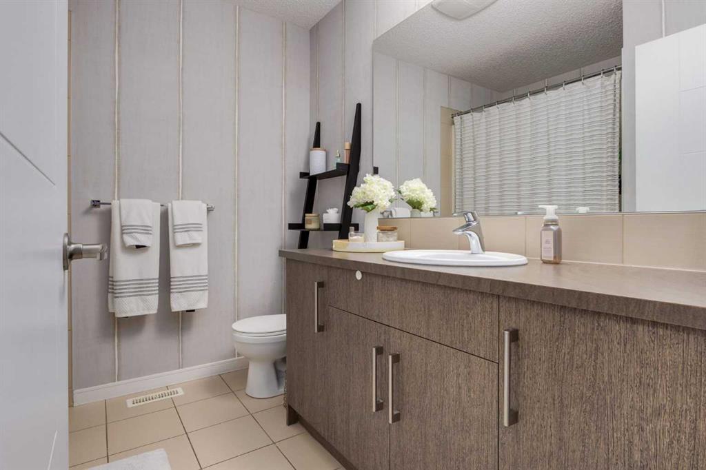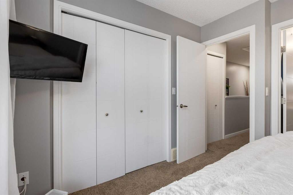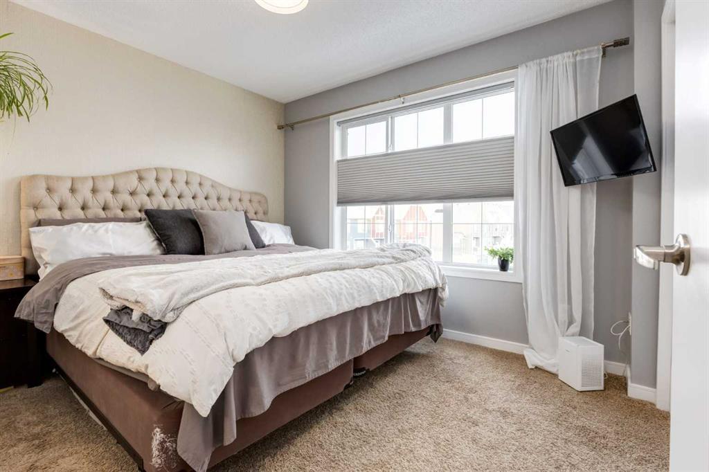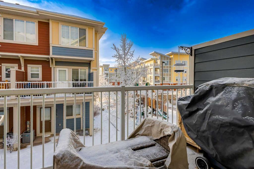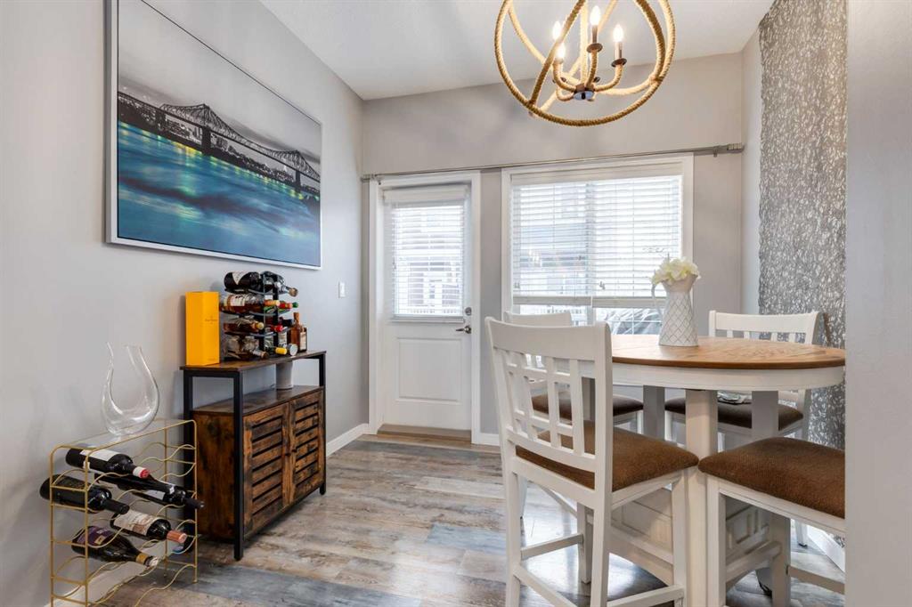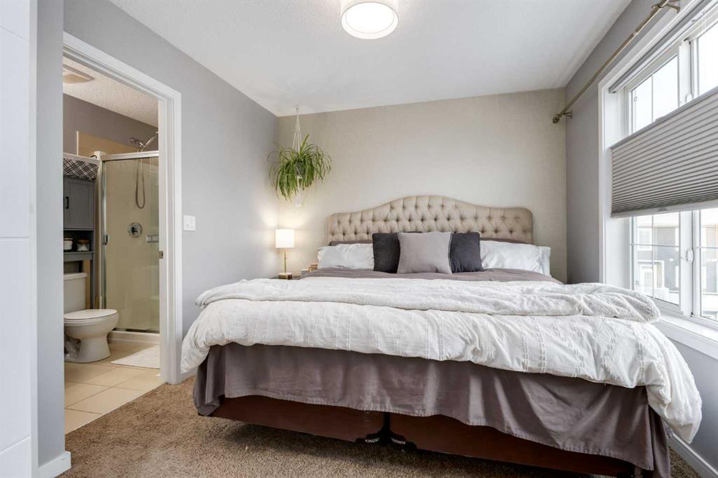 Some other value added updates include; heated tile floor at the entry, new furnace (2025), Tesla charge station, new Samsung washer & dryer, top-down/bottom-up window shades, added plugs in kitchen island, and a heater in the garage! The kitchen showcases sleek cabinetry with a wood grain effect in tones of dark wood and greys, perfectly accented by a mosaic tiled backsplash. Stainless steel appliances, granite countertops, and an island with seating space add both functionality and style to this culinary haven. Adjacent to the kitchen, the generous dining area opens to a balcony equipped with a gas line for BBQs, making it an ideal spot for entertaining guests. A cozy living room is a must and the included surround sound speakers will be an added bonus. Additionally, a powder room on the main floor with updated tile flooring caters to your visitors. The upper level features a primary bedroom complete with a four-piece en-suite bathroom and a spacious walk-in closet, with natural light so you’ll know if your top and bottoms actually match! This level also includes two additional bedrooms, a family bathroom, and a convenient laundry area. The air conditioning and a tandem heated garage with ample space for two vehicles under covered with a 3rd in the driveway and additional storage will be major checkmarks for your lifestyle. The visitor parking stalls are right across the street from your driveway, so your guests won’t mind coming over at all. Additionally, the location is prime and is just steps away from both Public and Catholic schools and within walking distance to the lake, which offers year-round recreational activities for residents. The amenities at Westman Village, Mahogany Village, Auburn Station, and Seton are easily accessible, as well as major routes like Stoney and Deerfoot trails, making this townhouse a perfect blend of convenience and comfort. Don’t hesitate to book a showing today, we’re happy to accommodate!