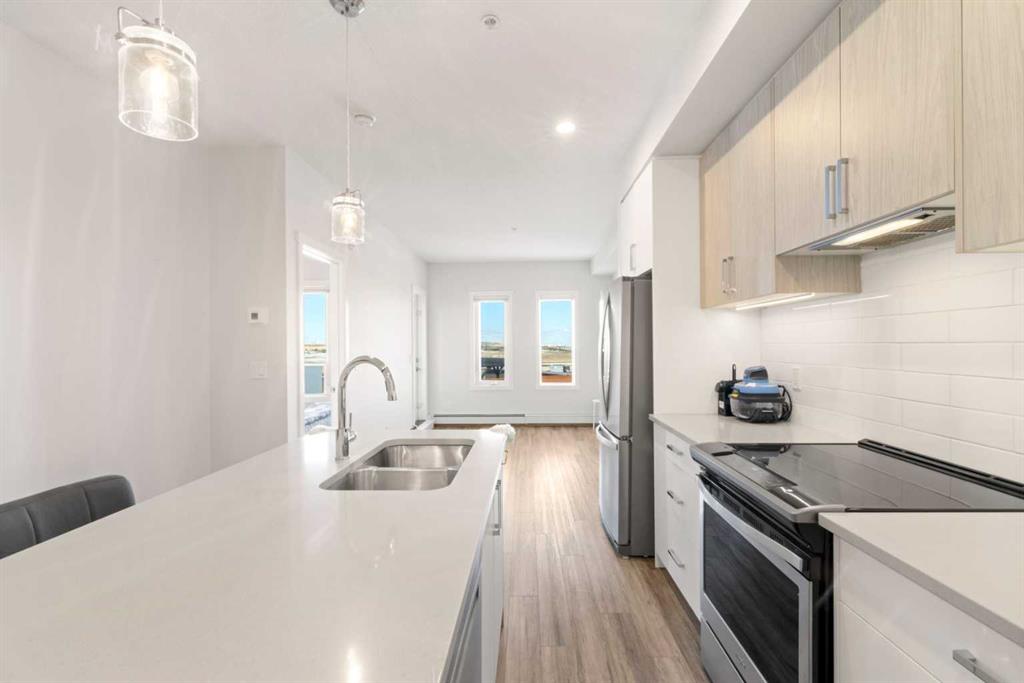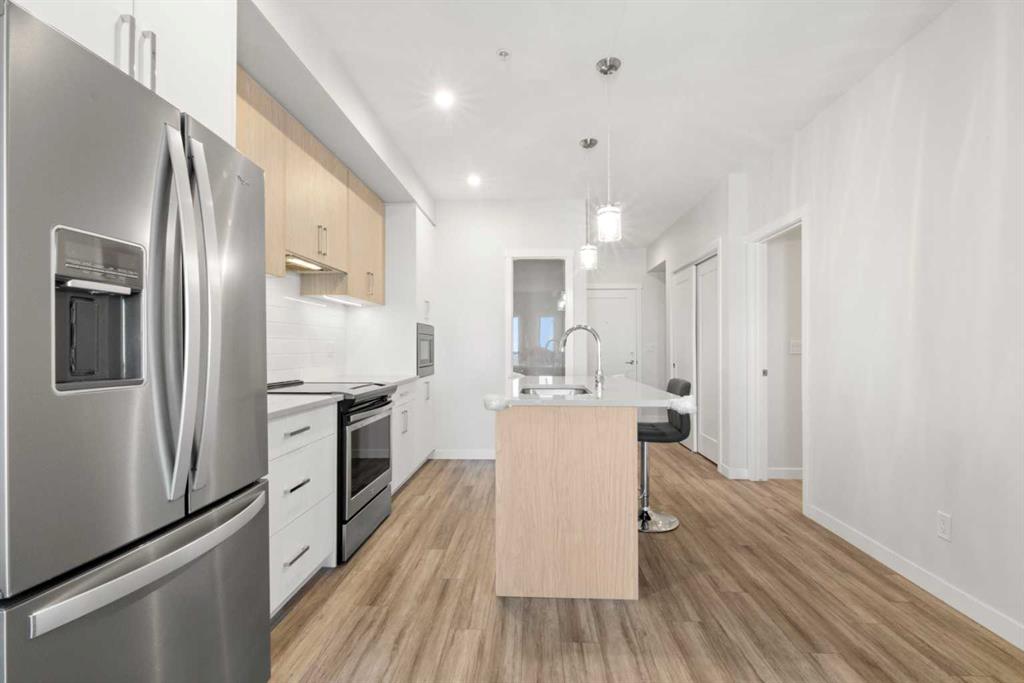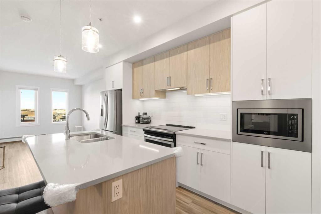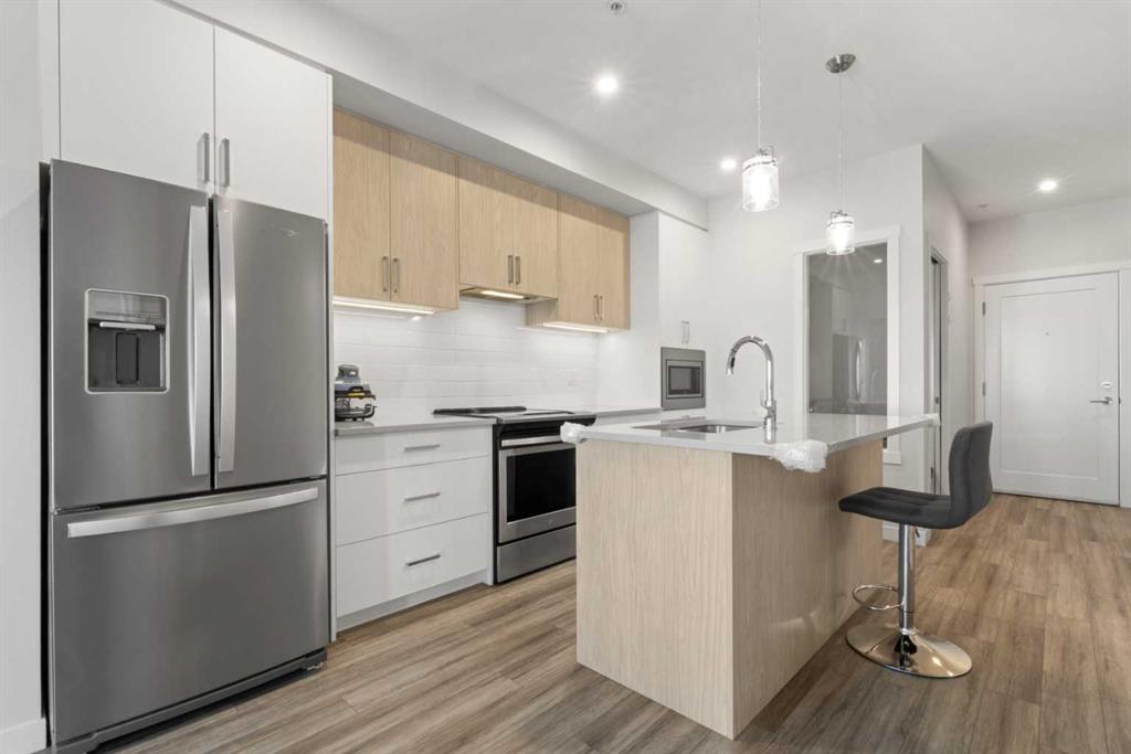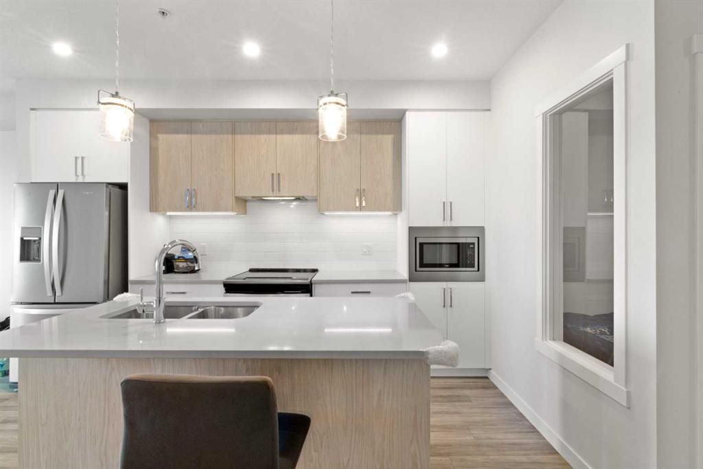 Step into a space that instantly feels like home in the vibrant community of Sage Hill Quarter. This beautifully maintained second floor condo offers a perfect balance of style, comfort and everyday functionality, all in one of northwest Calgary’s most convenient locations. From the moment you walk in, you are welcomed by a bright, open layout with durable vinyl plank flooring flowing seamlessly throughout, creating a clean and modern feel. The kitchen is a standout feature with its eye catching two toned cabinetry, stainless steel appliances, ample storage and a central island that is perfect for casual dining or entertaining, all finished with sleek quartz countertops that carry through to the bathroom as well. The living room is filled with natural light and opens onto your private balcony complete with a gas line, ideal for summer BBQs and relaxing evenings. The primary bedroom is spacious and thoughtfully designed, featuring a large walk through closet that leads directly to a well appointed four piece bathroom. Adding even more versatility to the layout is a separate flex room that works perfectly as a home office, guest space or hobby room. A dedicated laundry room adds extra convenience along with additional in suite storage. This home is truly move in ready and offers the ease of low maintenance living with the added benefits of a titled underground parking stall and a titled storage locker. Located in the heart of Sage Hill Quarter, you are just steps from everyday essentials including groceries, pharmacy, restaurants, fitness studios and more, making it easy to enjoy a walkable lifestyle. Surrounded by pathways, parks and green space, and with quick access to Stoney Trail, Shaganappi Trail and nearby shopping destinations like Beacon Hill, this is a location that truly connects you to everything you need.
