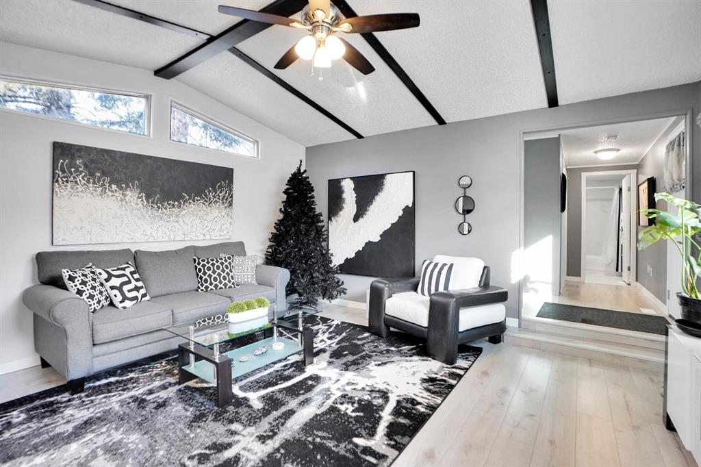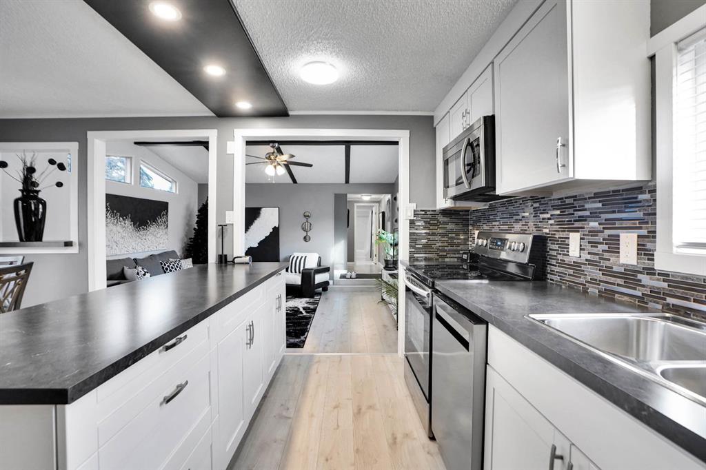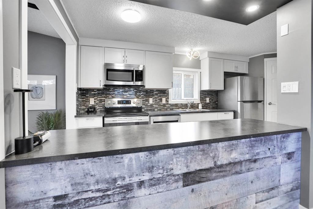 Welcome to Greenwood Village. Beautiful, completely renovated in 2021, 3 bed, 2 bath, 1160 sf mobile home in this NW amenities-rich community. This immaculately maintained home that shows like new is truly move-in ready. Laminate flooring throughout, white shaker-style kitchen cupboards, tiled backsplash, stainless steel appliances, coffee bar, and corner pantry, large kitchen island with pot lights, and a good size eating nook complete the kitchen area. Also in 2021 NEW WINDOWS, NEW FURNACE, All POLY B replaced with PEX, and newer roof. Electrical Panel – 2021 Baseboard and casing – 2021. 4 PCE ENSUITE has walk-in shower with tiled seat and awesome massage shower system. This great home has a huge sunken living room with black accent beams in the vaulted ceiling, and a step up to the kitchen and eating area. Separate laundry and furnace room can be found at the rear exit. The large master bedroom could easily fit a king bed, has a wall to wall closet with glass doors, and a black metal siding door that leads to the huge, fully tiled ensuite with a double sink vanity and walk in shower. All new lighting, painted throughout in a modern palette, with a bright and airy feel. At the opposite end of the home are two additional bedrooms, the full bathroom, a nice entry with coat closet all makes this a great, functional floorplan. Add a carport, parking for two cars, a fenced backyard and a shed are all value-added items that round out this home to be terrific value! Located next to Greenwich Village, home of the famous Farmers Market West. This home is ideally located near Stoney Trail Ring Road for effortless citywide travel, and Highway 1 for a weekend getaway to Banff or Bragg Creek. Lease fee of $1375 includes water, sewer, garbage pick up & snow removal. Calgary Transit and a school bus offers service through the park. Lease approval required, pets allowed.
