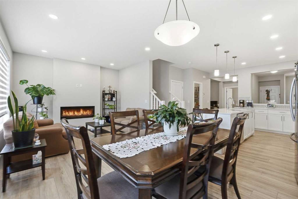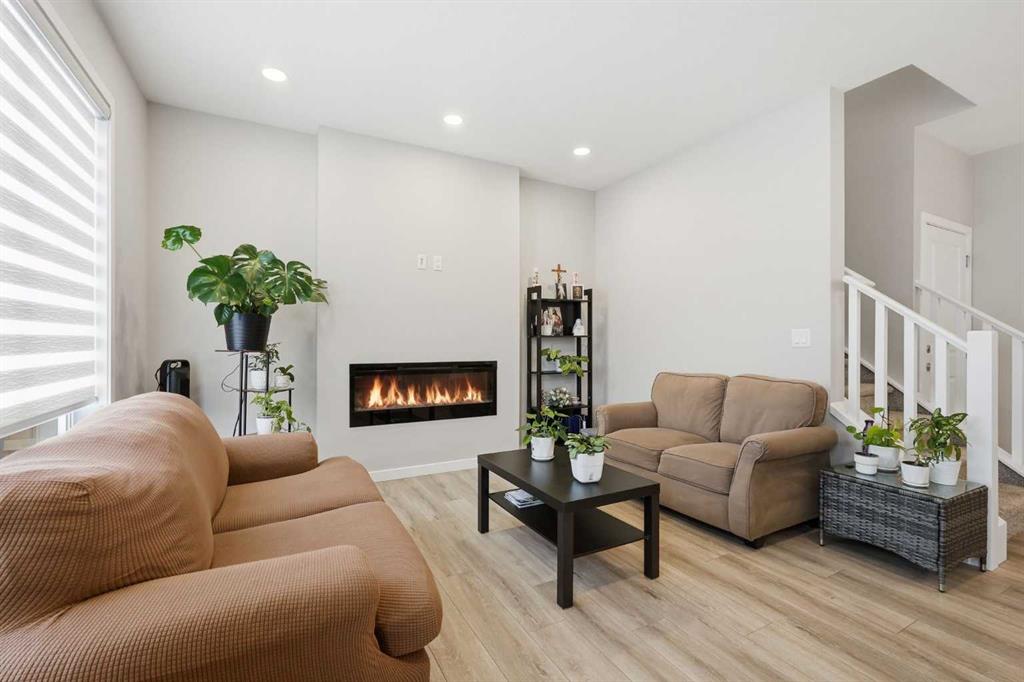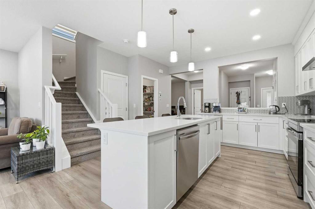 Inside, the home shows in true showhome condition with a bright open-concept main floor designed for modern living. The upgraded kitchen features quartz countertops, a large island, herringbone tile backsplash, and a spacious walk-in pantry. The main floor also includes a private office/den, powder room, electric fireplace, and a welcoming front entry with generous storage.