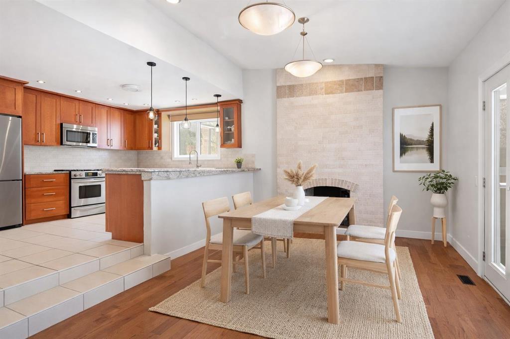 The main floor features hardwood flooring and a bright open living space with large windows that bring in plenty of natural light. The updated kitchen includes granite countertops, stainless steel appliances, modern lighting, and a raised eating bar that opens to the dining area. A wood-burning fireplace adds warmth and character, creating a comfortable space for everyday living or entertaining.