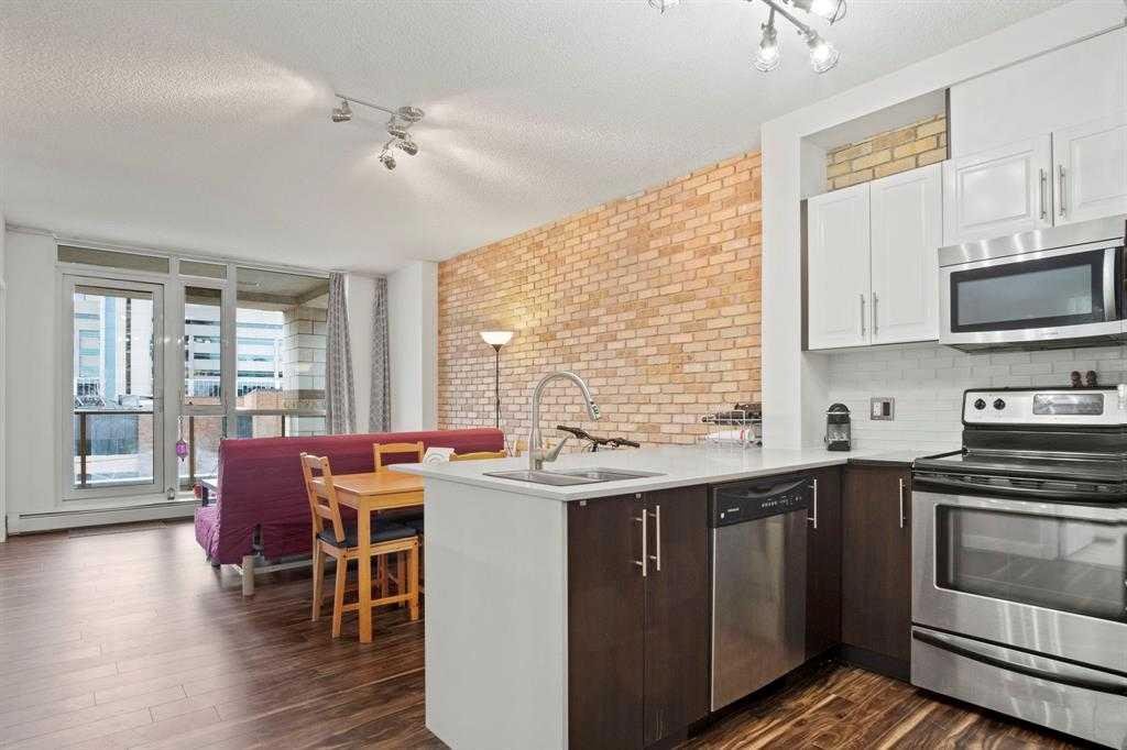 Welcome to this beautifully appointed and ideally located 1 bedroom + den condo offering impressive downtown Calgary skyline views. This bright and spacious unit features a modern interior design highlighted by a unique brick feature wall, quartz countertops, and stainless steel appliances. The functional layout includes a generous bedroom, a full bathroom, and a versatile den—perfect for a home office or study area. The open-concept living space flows seamlessly onto a large private deck, ideal for outdoor relaxation while enjoying panoramic city views. Additional features include: Heated underground parkade for year-round comfort Well-managed building with excellent walkability Prime location just steps from shopping, restaurants, entertainment, and transit Whether you’re a first-time buyer, investor, or looking for an urban lifestyle upgrade, this property offers exceptional value in the heart of downtown Calgary. A must-see unit with unbeatable views and convenience. Book your showing today!
