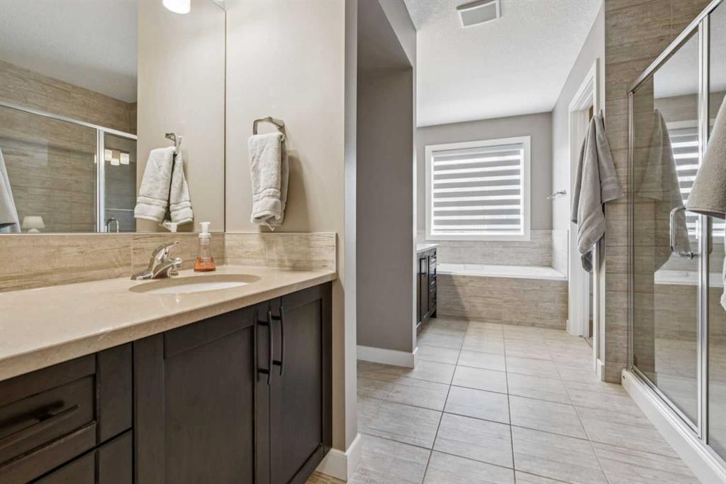Upstairs offers three bedrooms including a spacious primary retreat with a five-piece ensuite featuring double sinks, a soaker tub, and a tiled shower. The bonus room offers beautiful views overlooking the environmental reserve, creating a bright and inviting additional living space. The main bath includes quartz counters, and the laundry room is conveniently located upstairs with added shelving.