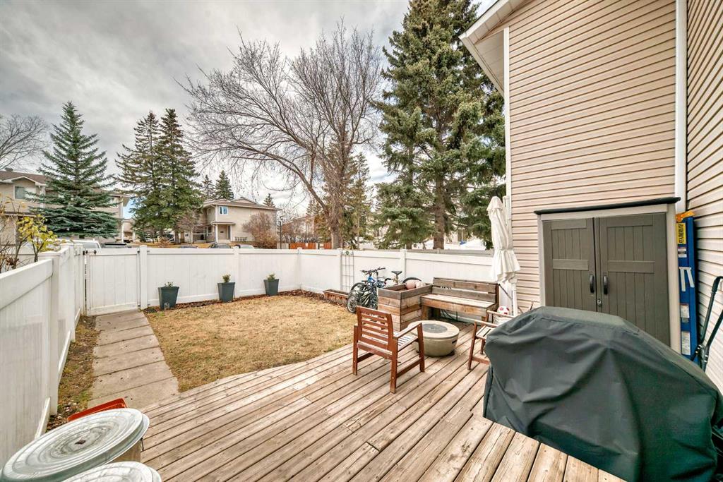 Key features include a west-facing, fully fenced backyard, a pet-friendly complex with low condo fees, and an amazing family-oriented location. The property is steps from St. Jude K-6 school and playground, Woodborough Park (with pickleball courts, an outdoor skating rink, and basketball courts), Woodcreek Skateboard Park, and several soccer fields and baseball diamonds.